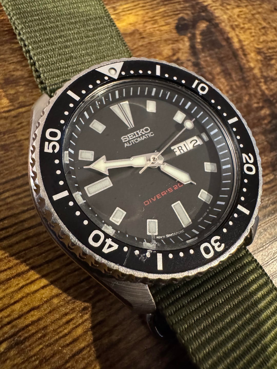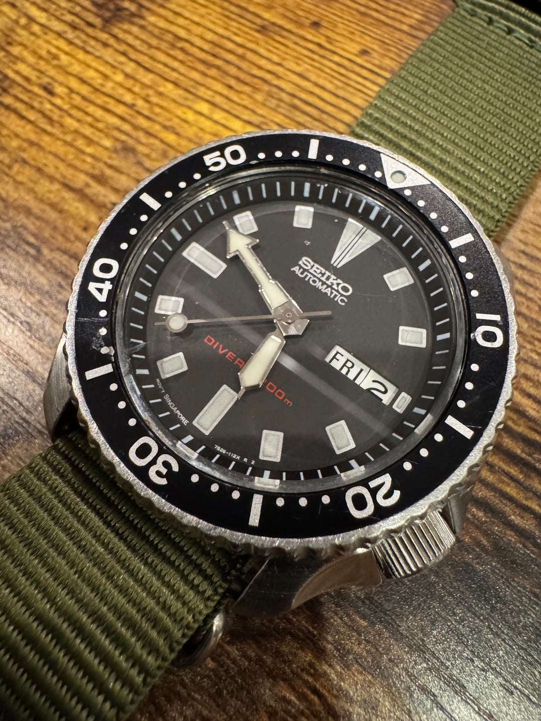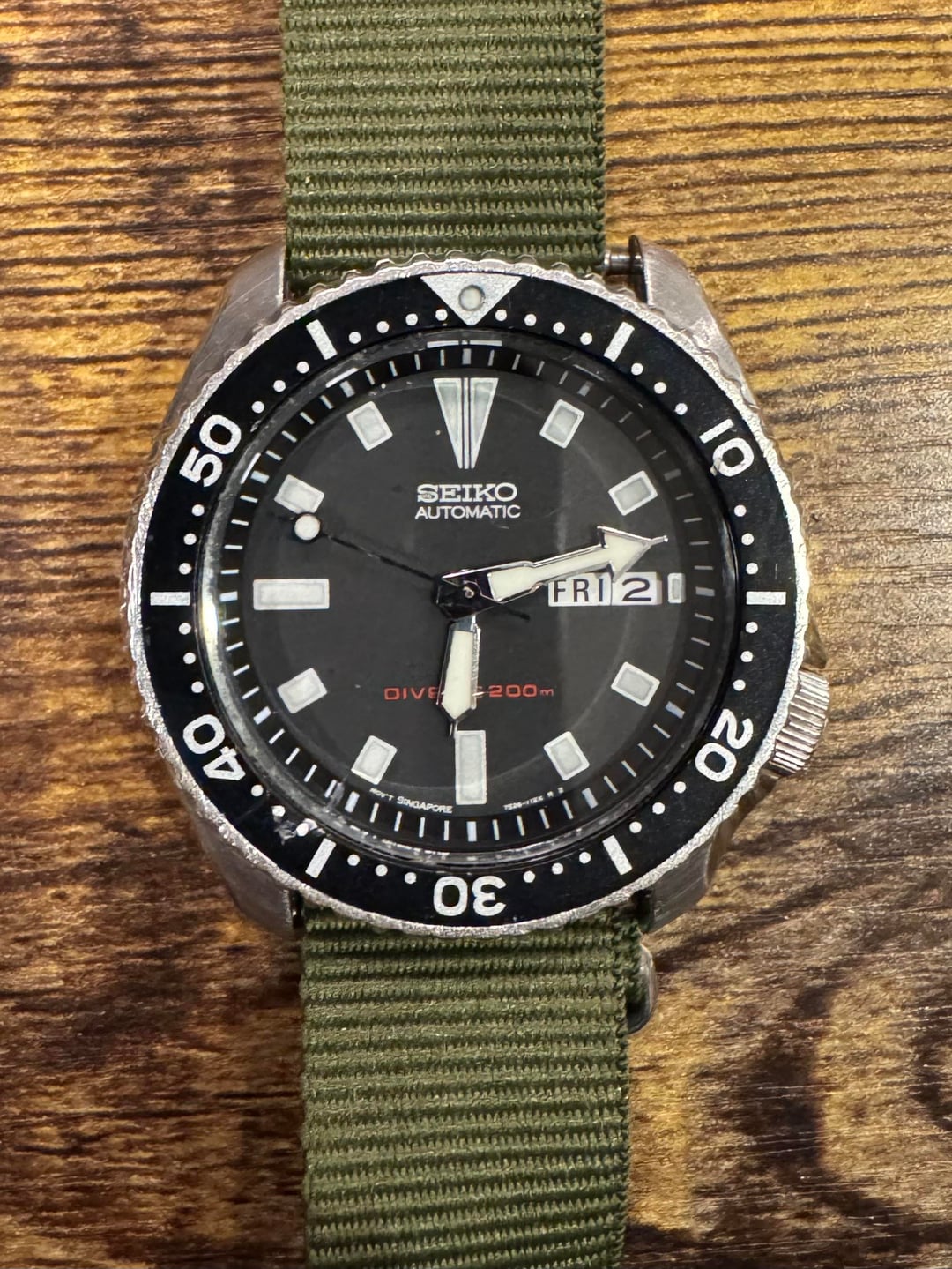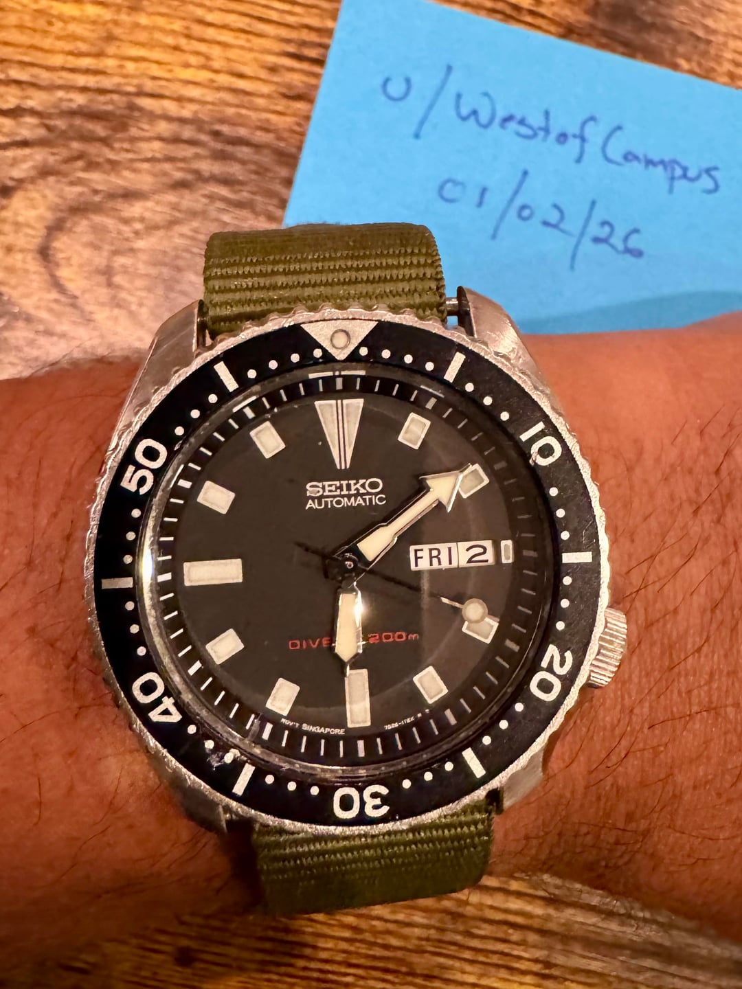 Up for sale is my Seiko SKX173, the U.S.-market variant of the SKX007 featuring squared hour markers while retaining the same iconic SKX case, bezel, and 7S26 movement. Dial and caseback are Singapore-marked. Comes on an olive green NATO strap. The watch is running well and keeping time as expected. Bezel action, crown, and day/date functions all operate properly. Lume performance is unbelievable. Condition: - Honest wear consistent with age - Small mark on the bezel insert with a corresponding mark on the crystal; minor and not noticeable on wrist, shown in photos to the extent possible Price: $260 OBO, shipped from the U.S. to CONUS addresses. Payment via PayPal F&F or Venmo preferred. Happy to answer questions or provide additional photos. Thanks for reading!