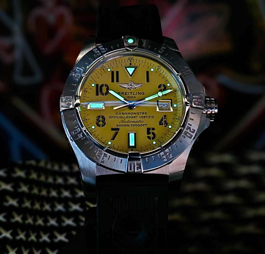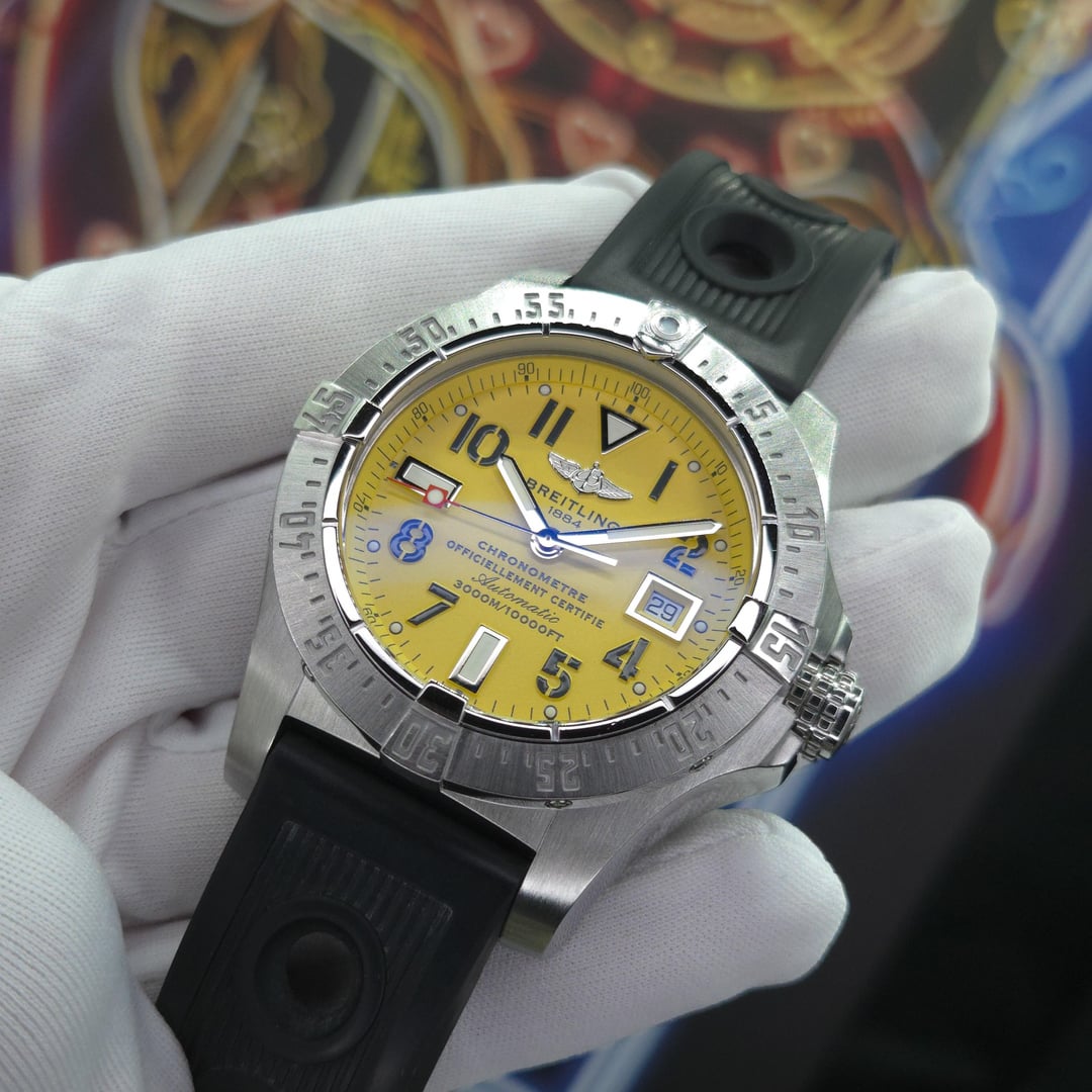 Let's jump on a video chat to show you the watch. Breitling Avenger Seawolf Reference A1733010 Size 45mm Box and Papers Included: Warranty, Manual, COSC, Hang Tag, Travel Box, Black Box, Outer Box Yellow Dial Rubber Strap Condition: Excellent Pre-Owned Condition. Typical of a Breitling box, there are signs of wear inside the travel box and storage box. The watch has been tested on a timegrapher and it is performing well. Features: 10,000 ft Water Resistant Unidirectional Bezel Red Seconds Hand Date Window Bright Lume Iconic Breitling Logo on the Dial and Buckle Strap this timepiece on and start your adventure. Put on that wetsuit and dive to your heart's content or 10,000 feet. Whichever comes first. Located in Huntington Beach, Ca Cash, Wire, PayPal G&S References Available $2599 FREE SHIPPING [Timestamp ](https://imgur.com/a/7jKXXKs) [Pics](https://imgur.com/a/7jKXXKs)