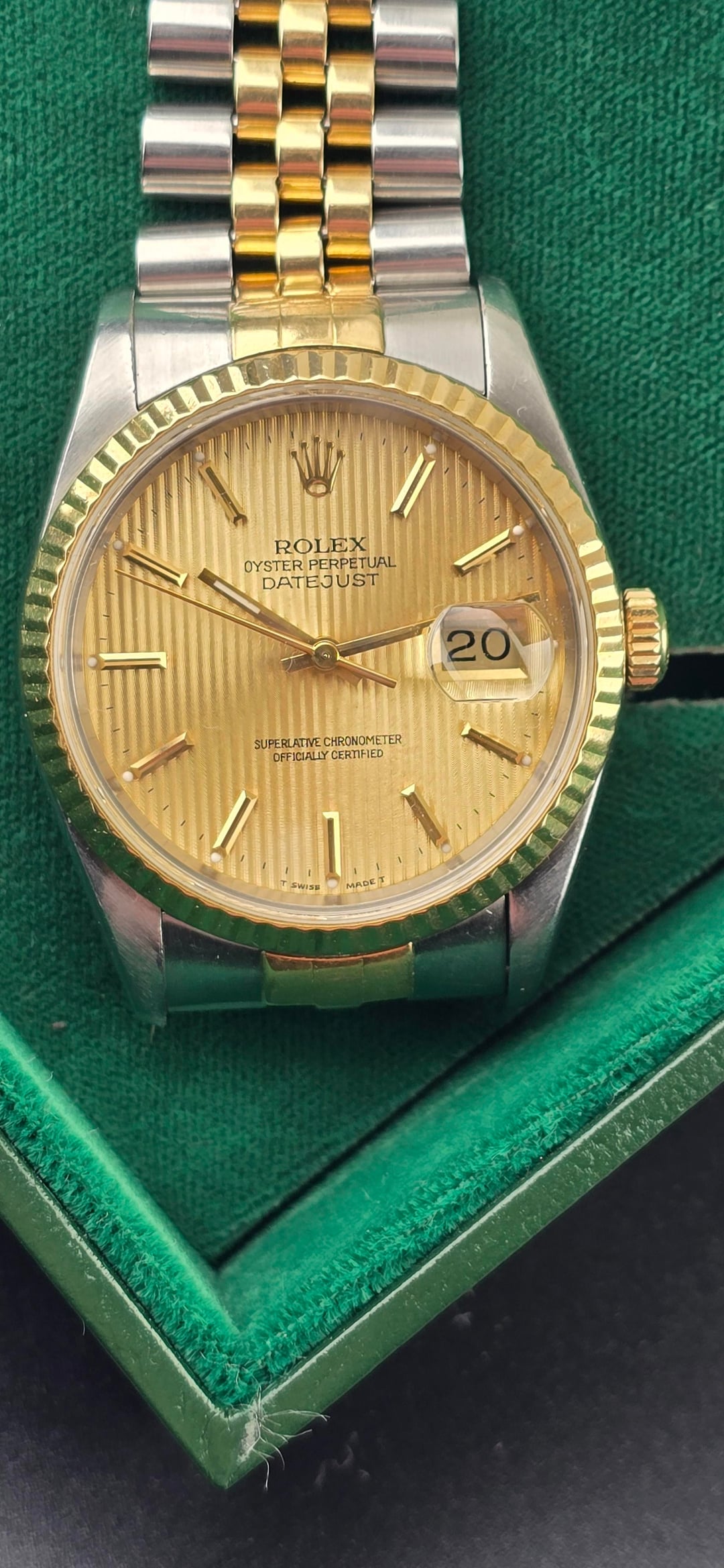 For sale is the Iconic 1991 Rolex Datejust 2 tone in jubilee. 16233https://imgur.com/gallery/time-stamp-tvGdLte Timestamp Reference 16233 All original Full links, bracelet has some stretch Comes as watch only (can include box for $125) Case could use a polish Pictures accurately depict the condition of watch, if you would like more pics or to jump on a video call feel free to PM me. Plenty of references. $5250+label or add $50 for overnight insured shipping within in CONUS.