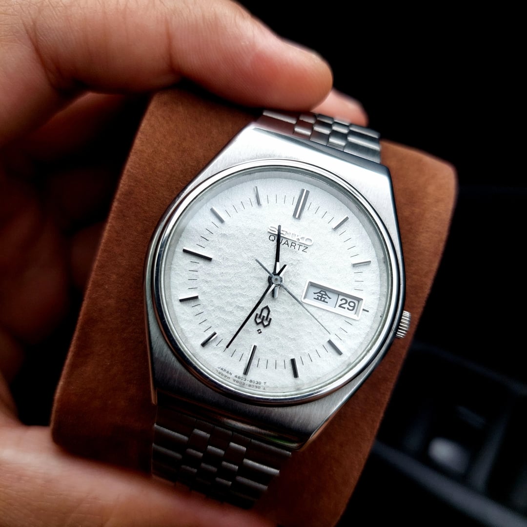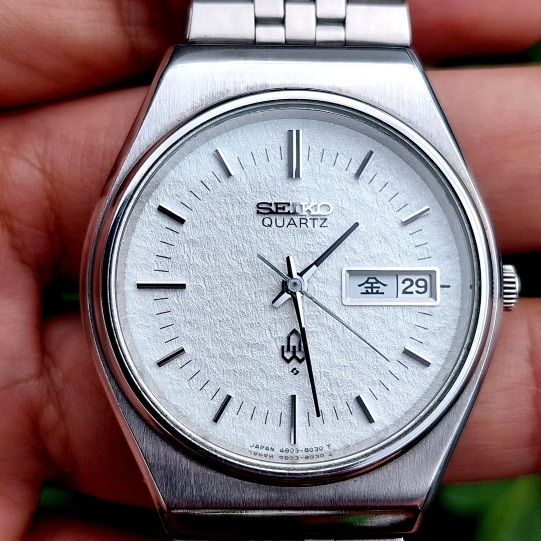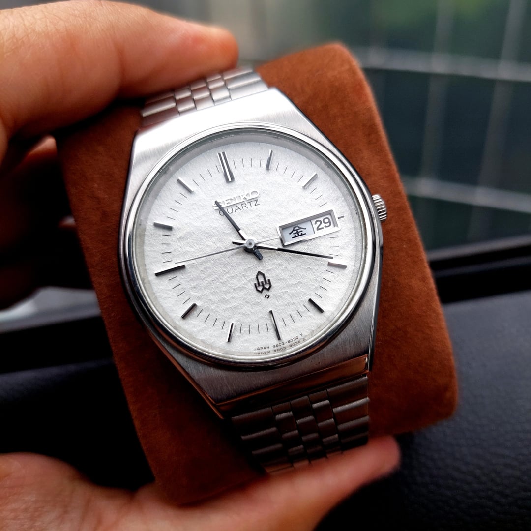 For sale one of high sought after Seiko Quartz 4803-8010 from 70’s, this is the first day-date snowflake dial from Seiko which an enhancement of the earlier QT 38-7030 model, which was successfully launched two years prior and notably featured Seiko's first-ever Snowflake dial. The dial features a captivating textured white canvas subtly accented with silver, a design element that would later used on Grand Seiko models like the SBGA011/211 The watch runs normally, powered by Caliber 4803-8010, the same reliable movement used in Seiko's high-end Superior, Grand Quartz, and King Quartz models. ▫️Production Year : July 1976 ▫️Case : 37.5 mm ▫️Lug to Lug : 42 mm ▫️ Comes with AM bracelet fit up to wrist size 20.5cm / 8 inch ▫️Day available in Kanji and English the movement is running perfeclty fine without any issue The watch fully functional with a refined case polish that preserves its original shape. The crystal is also in good condition. Looking to get $250 shipped. Payment via Paypal F&F and G&S + 4.8%. Video of watch : https://www.instagram.com/reel/DTDjCeoj8Lg/?igsh=MTN3aG9zMWVzaXZlZg== for more collection please follow my instagram: https://www.instagram.com/lougeposh/ Please COMMENT FIRST before sending me a pm or chat. Tracking number (Airwaybill) will available within 3 days once payment confirmed
