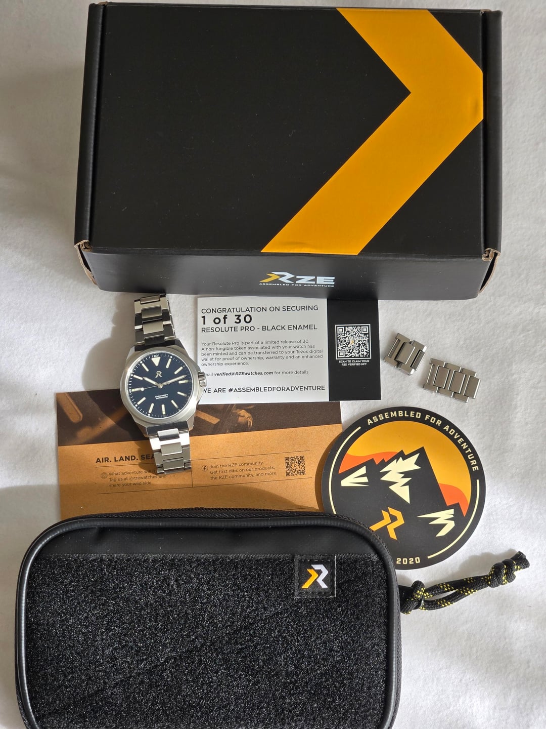 Hello Watchexchange! I’m almost done consolidating my collection. Available is my limited-edition RZE Titanium Resolute Pro Jet Black Enamel. It’s a 1 of 30 with a unique case back engraving–although RZE is weird and the actual number is 58/500. Blackcomb pouch, box, sticker, extra links, and cards as shown are included. SPECS: \- Solid Titanium with UltraHex™ Coating (up to \~1200Hv hardness) \- Miyota 90S5 (No-Date) Automatic Movement \- 100m (330ft) / 10ATM \- Screw-down crown with custom reverse engraved logo \- Heated-Enamel dials with applied indexes and RZE logo \- Swiss Super-LumiNova® \- Sapphire Crystal with inner-side Super-AR \- Solid Titanium bracelet with UltraHex™ Coating + QUIKCLIQ™ 316L deployment buckle \- Screw-down solid titanium case back with VITON® gasket It was regularly worn, but the UltraHex coating has done a great job of minimizing any marks. The only significant sign of wear is on the case back. I guess UltraHex on UltraHex does result in some marks. It’s a great, lightweight, comfortable GADA watch. $395 (firm) shipped fully insured CONUS. Timestamp: [https://imgur.com/a/Zddik9F](https://imgur.com/a/Zddik9F) Payment: Zelle or Paypal FF only. I’m happy to have a Zoom or phone call to verify identify and ownership. In-person delivery possible in Los Angeles.