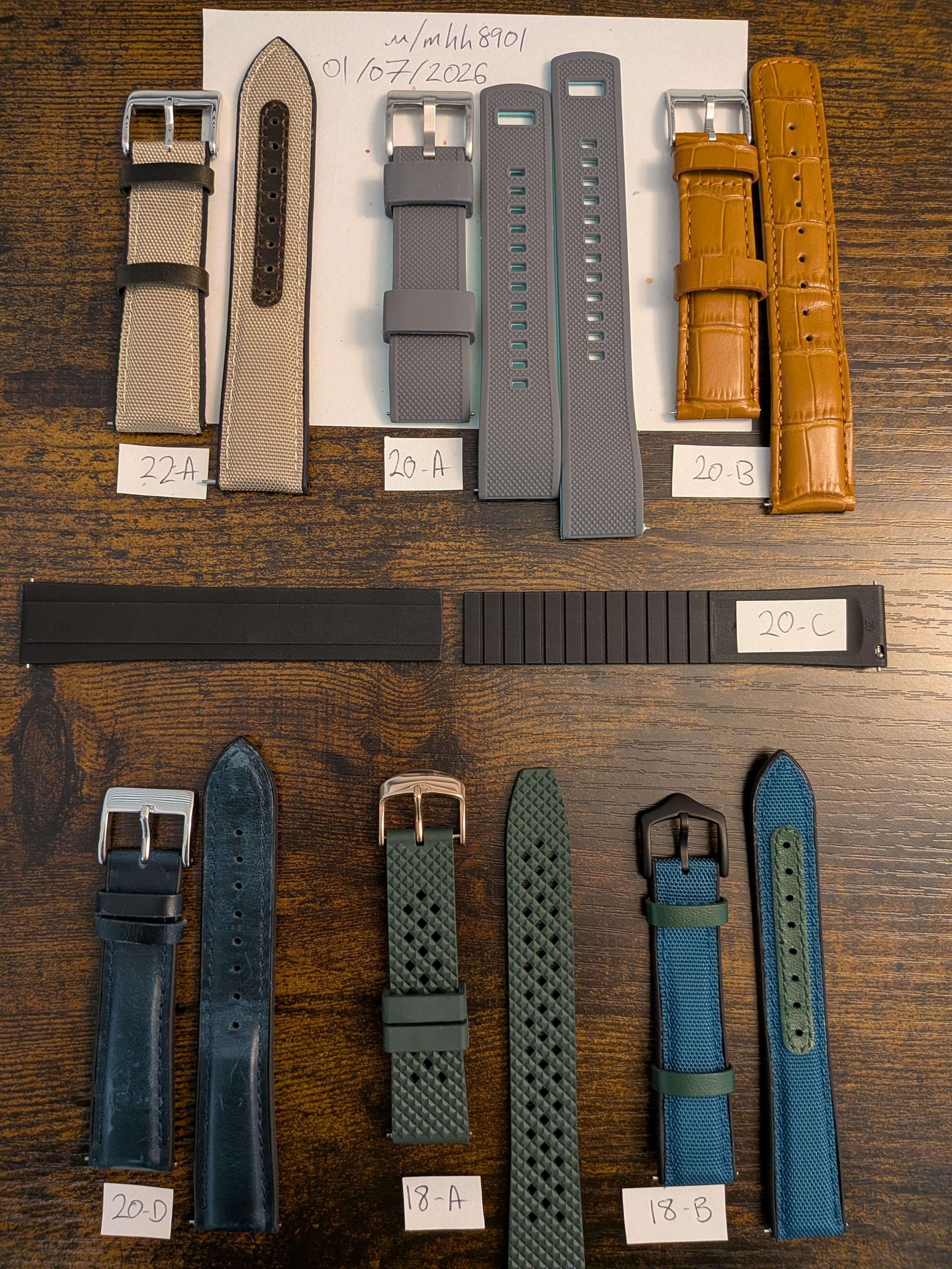For Sale: **22mm, 20mm, 18mm Straps $10 ea. $5 Shipping** 22mm A: SOLD 20mm A: SOLD 20mm B: SOLD 20mm C: SOLD 20mm D: SOLD 18mm A: Green Silicone 18mm B: SOLD **$10 ea.** **$5 Shipping (CONUS)**. Ships from Texas. International Shipping on your label. Accept Zelle, Venmo, PayPal (Buyer pays fees).