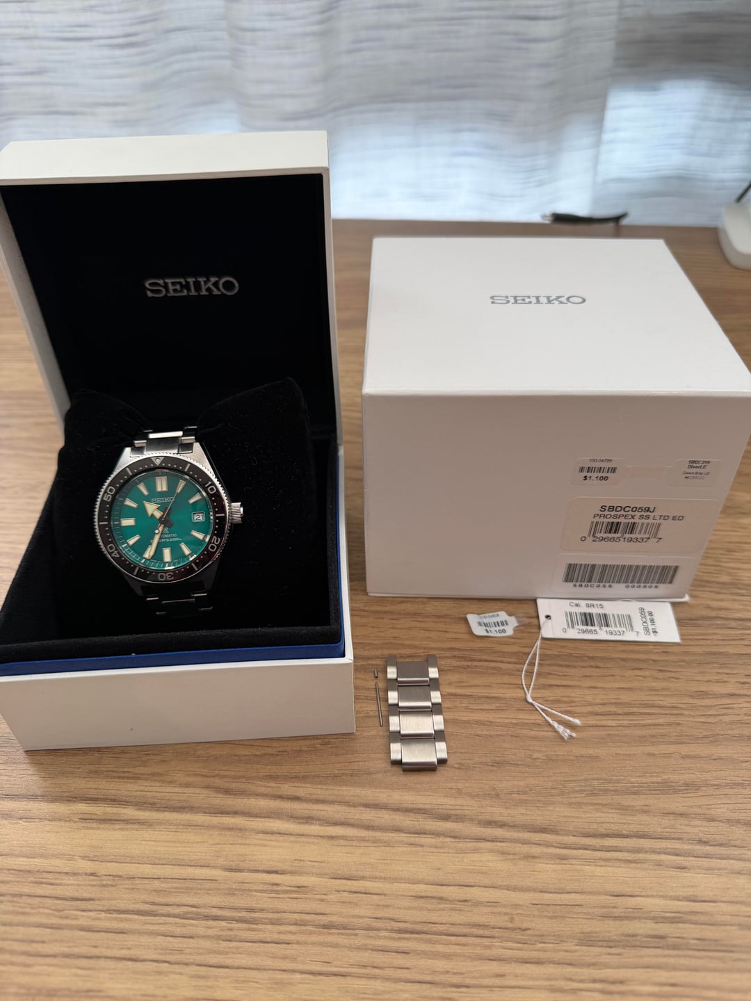 $1,400 shipped CONTUS For sale is a limited edition Seiko Prospex diver. Excellent condition and comes with original box and manuals. Happy to FaceTime to answer any questions or verify ownership! Thanks for looking. Key Specs: * Movement: Seiko 23-Jewel Automatic 6R15 * Case: Stainless steel, 42.6mm x 13.8mm thick. 49.8mm lug-to-lug * Crystal: Anti-Reflective Sapphire * Band: Stainless steel bracelet with DiaShield. Push-button deployant clasp. 20mm lug * Water Resistant: 200 meters Official Description: The new Limited Edition Seiko Prospex Diver SBDC059 is based on the design of the 1965 original Seiko 62Mas (ref. 6217) dive watch, but it has been updated in functions and performance to a thoroughly modern dive watch. Crafted in stainless steel, it now measures 42.6mm in diameter and 13.8mm in height. The dial has large embossed indices filled with strong LumiBrite luminous material. Scratch resistance is enhanced with Seiko’s DiaShield coating on the case and bracelet. DiaShield is about 2-3 times harder than Stainless Steel. And, the slightly domed (anti-reflective) sapphire resists scratching and provides a clear view of the gorgeous dial and hands. Inside the case is an automatic Calibre 6R15 movement which beats at 3Hz and has an ample 50 hours of power reserve when fully wound. Shipping: UPS or USPS, insured & tracked.