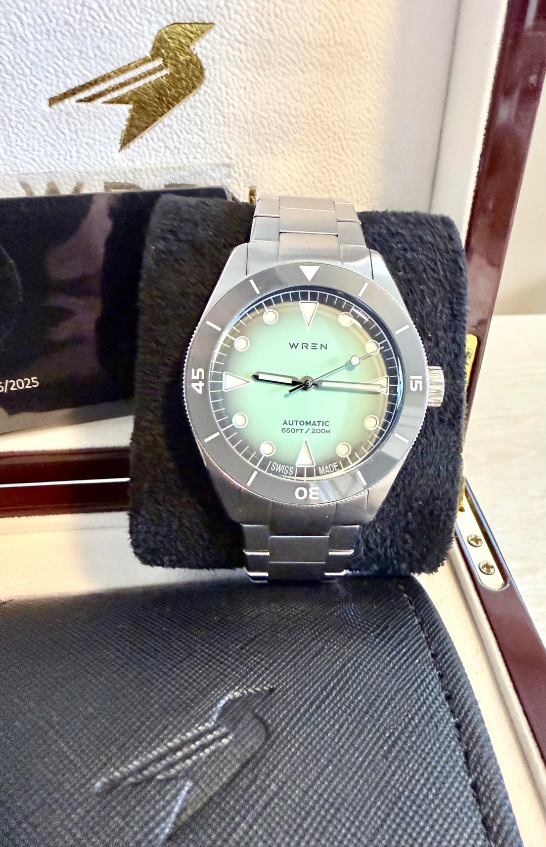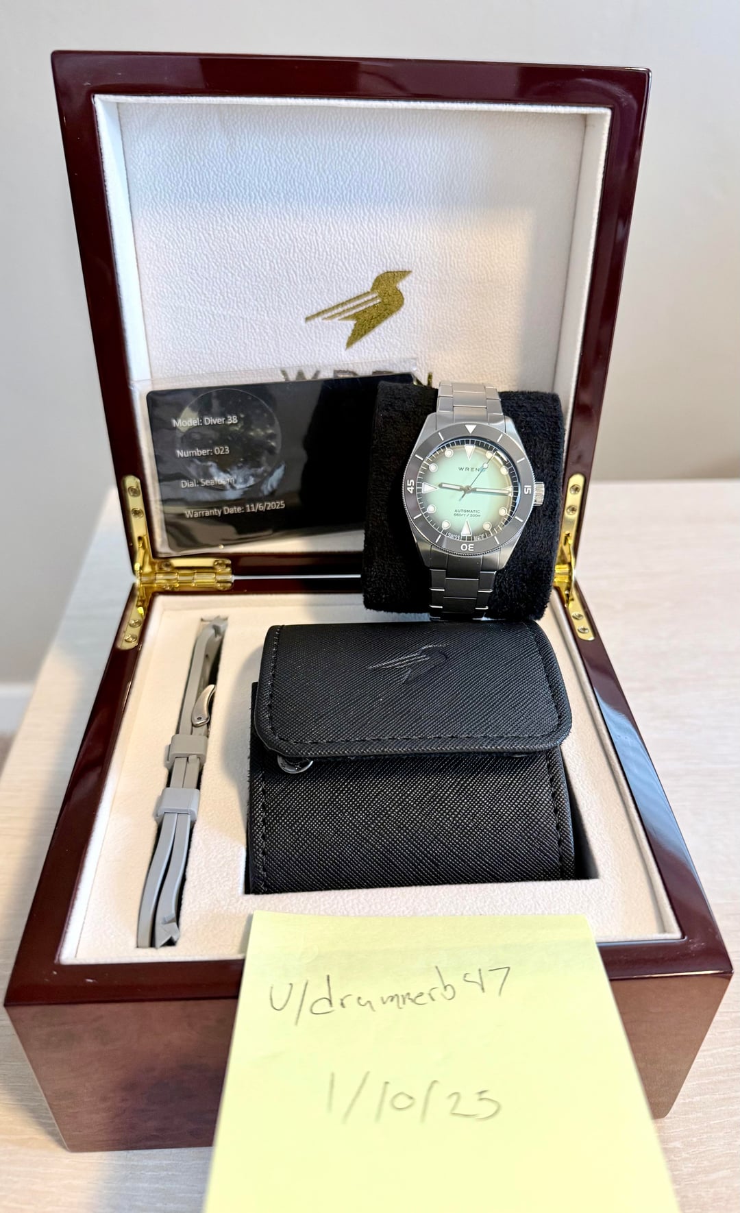 Wren Diver 38 Seafoam full kit as delivered (inner travel case, warranty card #023, unused steel bracelet, rubber strap). The watch is in mint condition. [WTS] Wren Diver 38 “Seafoam” No-Date – Full Kit (Mint) – $1,150 shipped (CONUS) OBO Timestamp & Photos: (See attached images; additional pics available on request.) Description: Up for sale is my Wren Diver 38 Seafoam in excellent, near-mint condition. This is the 38mm Swiss-made dive watch released by Wrist Enthusiast in 2025. It’s a no-date dial version (clean symmetric look, and no ghost crown position). I’m the original owner (purchased August 2025) and have worn it only a handful of times on the rubber strap – the stainless steel bracelet has never been worn. The watch has zero significant marks; bezel, case, and crystal are pristine (see photos). It keeps excellent time with the high-grade ETA movement. • Case: 38mm diameter (slim 10.7mm thick, ~45mm lug-to-lug), 316L stainless steel with brushed finish. Wears very comfortably and true to size – a great “Goldilocks” size diver. • Movement: Swiss ETA 2892-A2 automatic, no-date (21 jewels, 42h power reserve). Hacking and hand-winding. This is an ultra-thin, premium movement – uncommon in microbrand divers. • Dial & Bezel: “Seafoam” fumé dial (gradient mint-green fading to grey) with sandwich markers. Super-LumiNova X1 lume on hands, indices, and fully lumed ceramic bezel insert – it glows like a torch at night. The bezel is 120-click, unidirectional, and color-matched to the dial’s darker edge. Dial has SWISS MADE at 6 and is one of the first 100 numbered (this is #023). • Crystal: Sapphire (boxed with inner AR coating). Clear and free of scratches. • Bracelet & Strap: Comes on the OEM gray rubber strap (quick-release, worn ~5 times) and an unworn OEM stainless steel bracelet with on-the-fly microadjust clasp. The bracelet still has its stickers on – full length, never sized. All original links, spring bars, etc. included. • Water Resistance: 200m / 660ft with screw-down crown and caseback. Perfect for swimming or diving (though it’s only seen desk dives so far). • Caseback: Screw-down display caseback showing off the decorated Wren rotor (shaped like a wren bird) on the ETA 2892. It’s a nice touch for a dive watch at this price point. Includes: Full kit – Wren travel case, outer box, unsigned warranty card, manual/papers, unused bracelet, rubber strap, spring bar tool, hang tag, and even original packaging. (Everything you’d get new from Wren.) Why Sell? Thinning the herd and raising funds. I absolutely love this piece and its slim profile, but it overlaps with another green diver I own, so I have to let one go. Pricing: Asking $1,150 shipped within the U.S. (CONUS). This price is firm but fair, given the condition and complete set. (Retails for $1,610 new and currently sold out/backordered for the no-date version.) I’m open to reasonable offers, but no lowballs please – I’m not in a rush and I know what it’s worth. Payment: PayPal Friends & Family preferred, or Venmo/Zelle. If you prefer PayPal Goods & Services, that’s fine if you cover the fees. Face-to-face cash deal in the Boise, Idaho area also welcome. Shipping: Included for CONUS – USPS Priority Mail insured, with signature confirmation. I ship within 24 hours of payment and will pack securely. Will consider international shipping at buyer’s expense/risk (PM to discuss). References: I have multiple successful transactions on r/WatchExchange (can provide user references). I also have a long history on eBay. Deal with confidence. 😊 Thanks for looking! Feel free to ask any questions or for additional pics. Happy to hop on a video call to showcase the watch live.