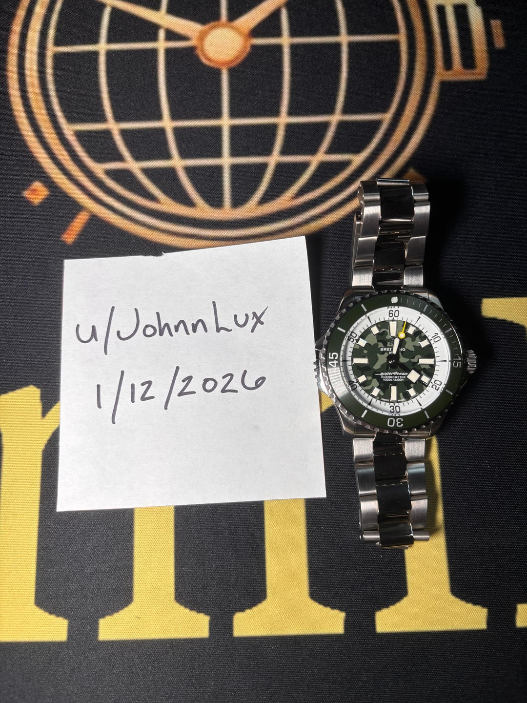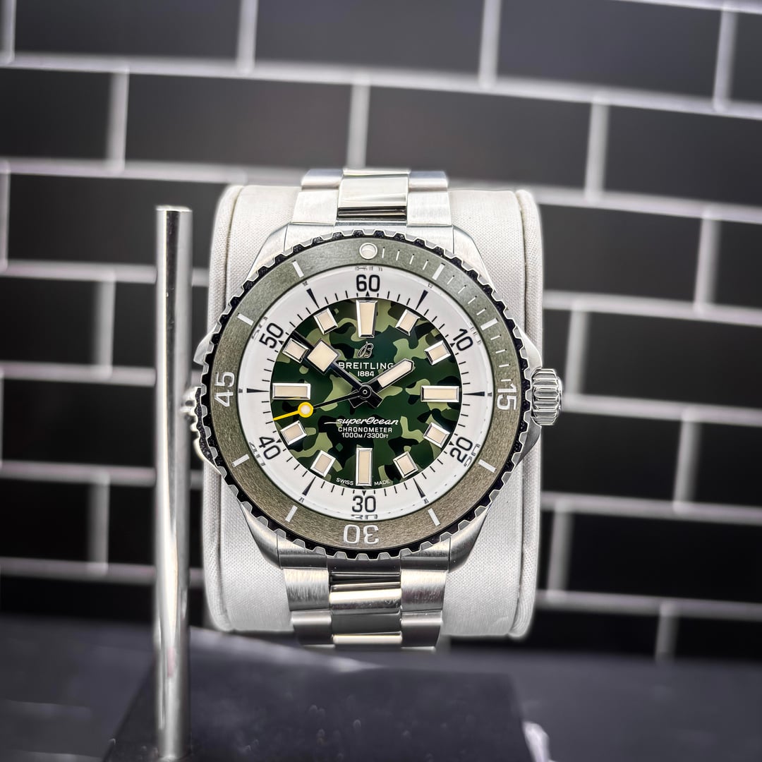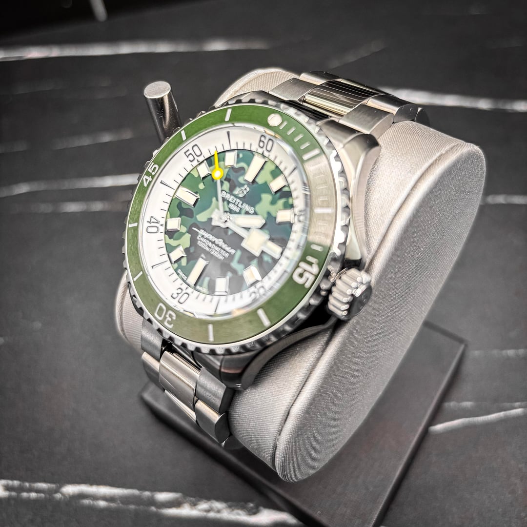 Up for sale is my Breitling SuperOcean 44 Super Diver with the green camo dial, featuring a titanium case paired with the stainless steel bracelet. The watch is pre-owned and in very good condition. Everything functions exactly as it should, and the factory warranty is active through 2027. It comes as a full set, including the box, papers, and all original contents. For security purposes, the serial number has been blurred in the photos. It is fully intact and visible on the watch and documentation. Price: $4,795 shipped and fully insured within the continental United States. I’m open to trades. If proposing a trade, please include clear photos, details on what’s included, and the value you’re placing on your watch so I can evaluate it properly. Any dust visible in the photos is from handling. The camera tends to pick up things the eye doesn’t always notice. Feel free to message me with any questions or if you’d like additional photos or specific angles. Thanks for looking.
