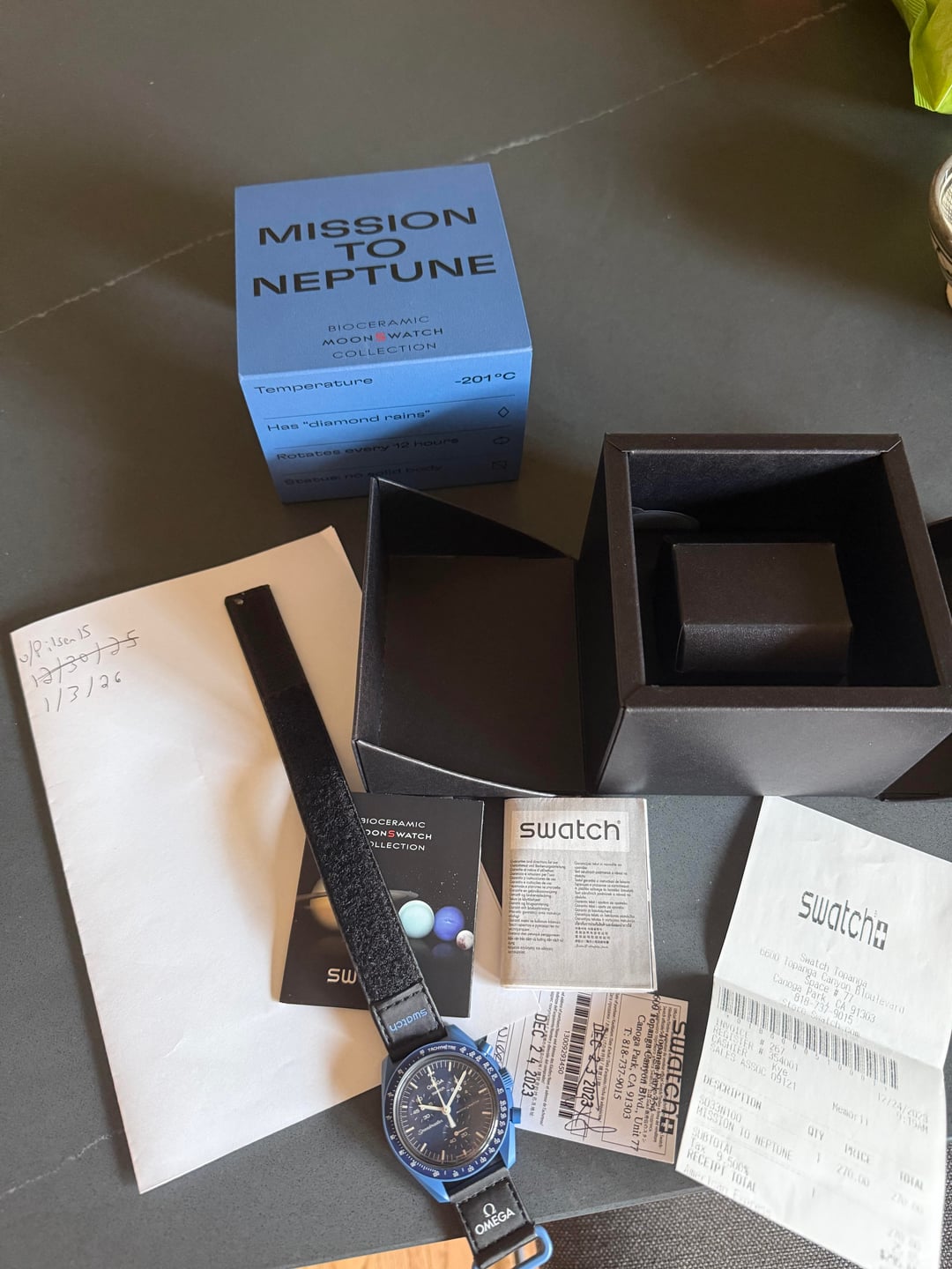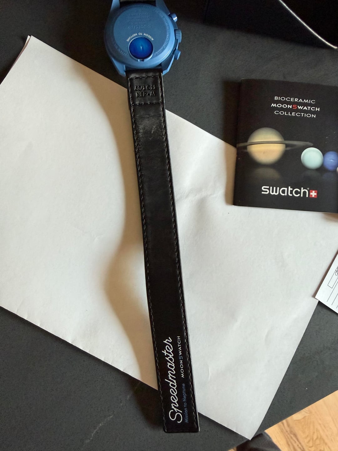 Hi WatchEx, for sale today is my Mission to Neptune moon swatch. Comes as a full set with receipt. I bought this from here and immediately put a plastic screen protector on it and changed the strap. I’ve worn it around ten times in rotation and selling today to make room in the watch box for an unexpected addition. $285 shipped net via Zelle, Venmo, or PayPal FF, GS if you have feedback. Happy to do a face to face transaction in Portland, Oregon, too.