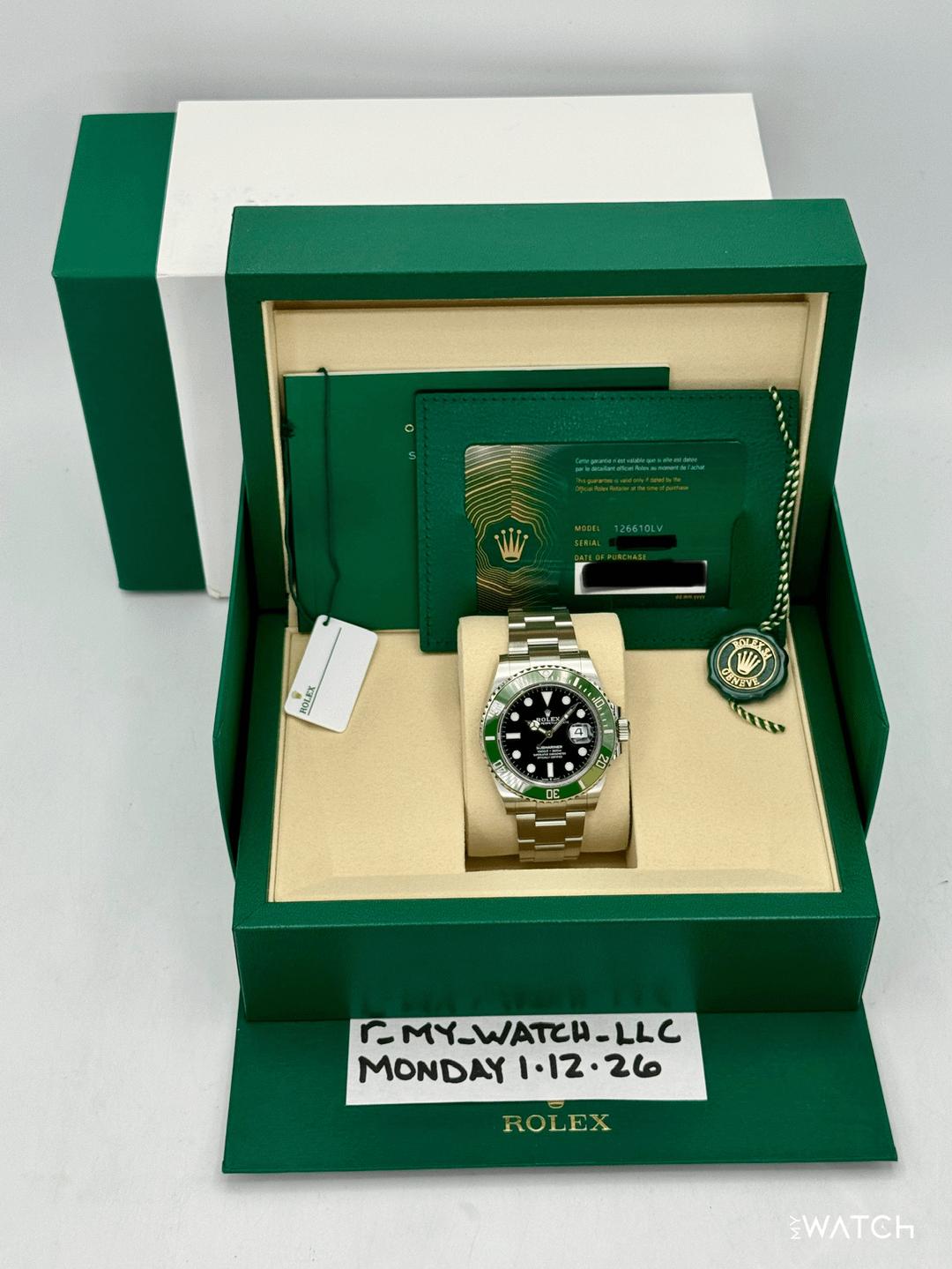 🔵**NEW 2026 Rolex Submariner Date "Starbucks" 41mm 126610LV Stainless Steel Black Dial Oyster Bracelet and Green Ceramic Bezel** 🔵**TRADE or SELL us your luxury watch, all brands considered. Message me details.** **Includes the following:** **✔️BRAND NEW UPDATED ROLEX BOX (DOUBLE BOX)** **✔️Box and Papers - Yes** **✔️Warranty card dated 2026** **✔️5 Year Manufacturer Warranty** **✔️Manual and Warranty booklets** **✔️Green and White Hang Tags included** **✔️Material: Stainless Steel** **✔️Size: 8.25 inch wrist (Full Links)** **✔️Watch is in BRAND NEW/UNWORN** **✔️**[**Trades**](https://mywatchllc.com/pages/sell-rolex-watch) **welcome** Business Name: **My Watch LLC** LOCATION: Oak Park, Michigan ✔️[MyWatchLLC.com](http://mywatchllc.com/) for current inventory ✔️Google Business Listing [https://g.co/kgs/Cmd6FPW](https://g.co/kgs/Cmd6FPW) ✔️Business Hours M-F 9-6 ✔️Facetime/Video chat/calls welcome to view the watch interested. ✔️Contact: 248-422-0909 via text or call for quickest response. 🟢TERMS: Visit [MyWatchLLC.Com](http://mywatchllc.com/) for payments accepted 🟢REFERENCES/REVIEWS: We are well reviewed on all platforms from google, trust pilot, rolexforums, additionally we have 300+ reference in multiple FaceBook watch groups, reference checks welcome. 🟢SHIPPING: If you are not local, we offer Fully Insured FedEx overnight shipping in the USA for a fee. International shipping available. [https://mywatchllc.com/products/new-2026-rolex-submariner-starbucks-41mm-126610lv-black-dial](https://mywatchllc.com/products/new-2026-rolex-submariner-starbucks-41mm-126610lv-black-dial)