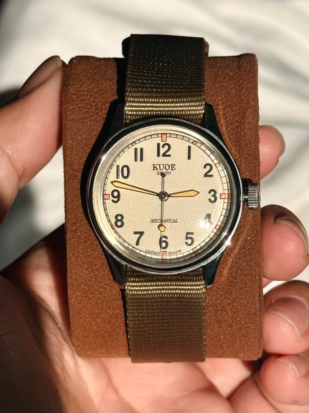 Selling my **35mm** **KUOE Old Smith 90-002** **mechanical** watch. Classic vintage-inspired field/dress styling with Arabic numerals and a clean cream dial. Caseback marked **Old Smith 90-002 / Mechanical / Made in Japan / Water Resistant 10 Bar**. **Price:** **$369 shipped (CONUS)** **Included:** * Watch head + KUOE olive strap * **No box, no papers** **Condition:** Excellent condition with sticker still on caseback. Please refer to photos as I tried to photograph everything clearly under direct light so there are no surprises. **Payment:** Zelle preferred. PayPal F&F accepted. PayPal G&S accepted (% on buyer). **Location:** San Diego, CA (local pickup welcomed) **Trades:** Not looking for trades at this time. **Timestamp**: [https://imgur.com/a/ESNjxyc](https://imgur.com/a/ESNjxyc) Please reach out if you have any questions or would like more photos! Thanks :)