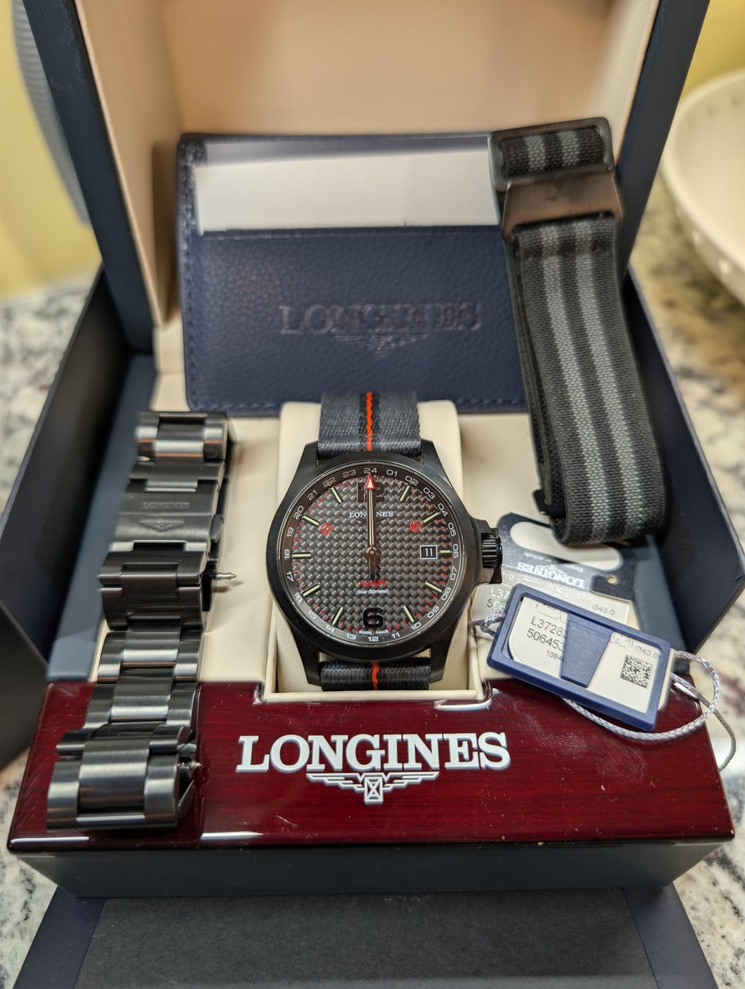 Selling Longines Conquest V.H.P. GMT 43mm Black PVD Ref. L3.728.2.66.6 Super cool black carbon dial with amazing depth that’s hard to capture in a photo. Longines famous V.H.P. movement technology with a second time zone indication that uses a 'Flash Setting' system which allows the watch to be set via a smartphone. Comes on a 22mm Christopher Ward Tide strap along with the unsized, unused OEM bracelet. Will also include an off-brand but decent MN strap too. Inner/outer box, manual, hang tags. Asking $850 shipped CONUS. Timestamp: [https://imgur.com/a/4OxvcwD](https://imgur.com/a/4OxvcwD)
