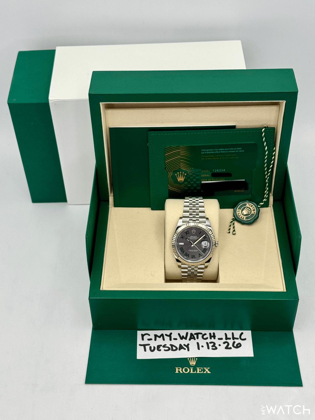 🔵**2025 Rolex Datejust 41mm 126334 Stainless Steel and 18kt White Gold Fluted Bezel Jubilee Bracelet Wimbledon Dial** 🔵**TRADE or SELL us your luxury watch, all brands considered. Message me details.** **Includes the following:** **✔️BRAND NEW 2025 UPDATED ROLEX BOX (Double Boxed)** **✔️Box and Papers - Yes** **✔️Warranty card dated September 2025** **✔️Manual and Warranty booklets** **✔️Green Hang Tag** **✔️Material: Oystersteel and 18K White Gold Fluted Bezel** **✔️Size: 7.75inch Wrist (Full Links)** **✔️Watch is in excellent overall condition. Please see photos for details.** **✔️**[**Trades**](https://mywatchllc.com/pages/sell-rolex-watch) **welcome** Business Name: **My Watch LLC** LOCATION: Oak Park, Michigan ✔️[MyWatchLLC.com](http://mywatchllc.com/) for current inventory ✔️Google Business Listing [https://g.co/kgs/Cmd6FPW](https://g.co/kgs/Cmd6FPW) ✔️Business Hours M-F 9-6 ✔️Facetime/Video chat/calls welcome to view the watch interested. ✔️Contact: 248-422-0909 via text or call for quickest response. 🟢TERMS: Visit [MyWatchLLC.Com](http://mywatchllc.com/) for payments accepted 🟢REFERENCES/REVIEWS: We are well reviewed on all platforms from google, trust pilot, rolexforums, additionally we have 300+ reference in multiple FaceBook watch groups, reference checks welcome. 🟢SHIPPING: If you are not local, we offer Fully Insured FedEx overnight shipping in the USA for a fee. International shipping available. [https://mywatchllc.com/products/2025-rolex-datejust-41mm-126334-jubilee-wimbledon-dial-1](https://mywatchllc.com/products/2025-rolex-datejust-41mm-126334-jubilee-wimbledon-dial-1)