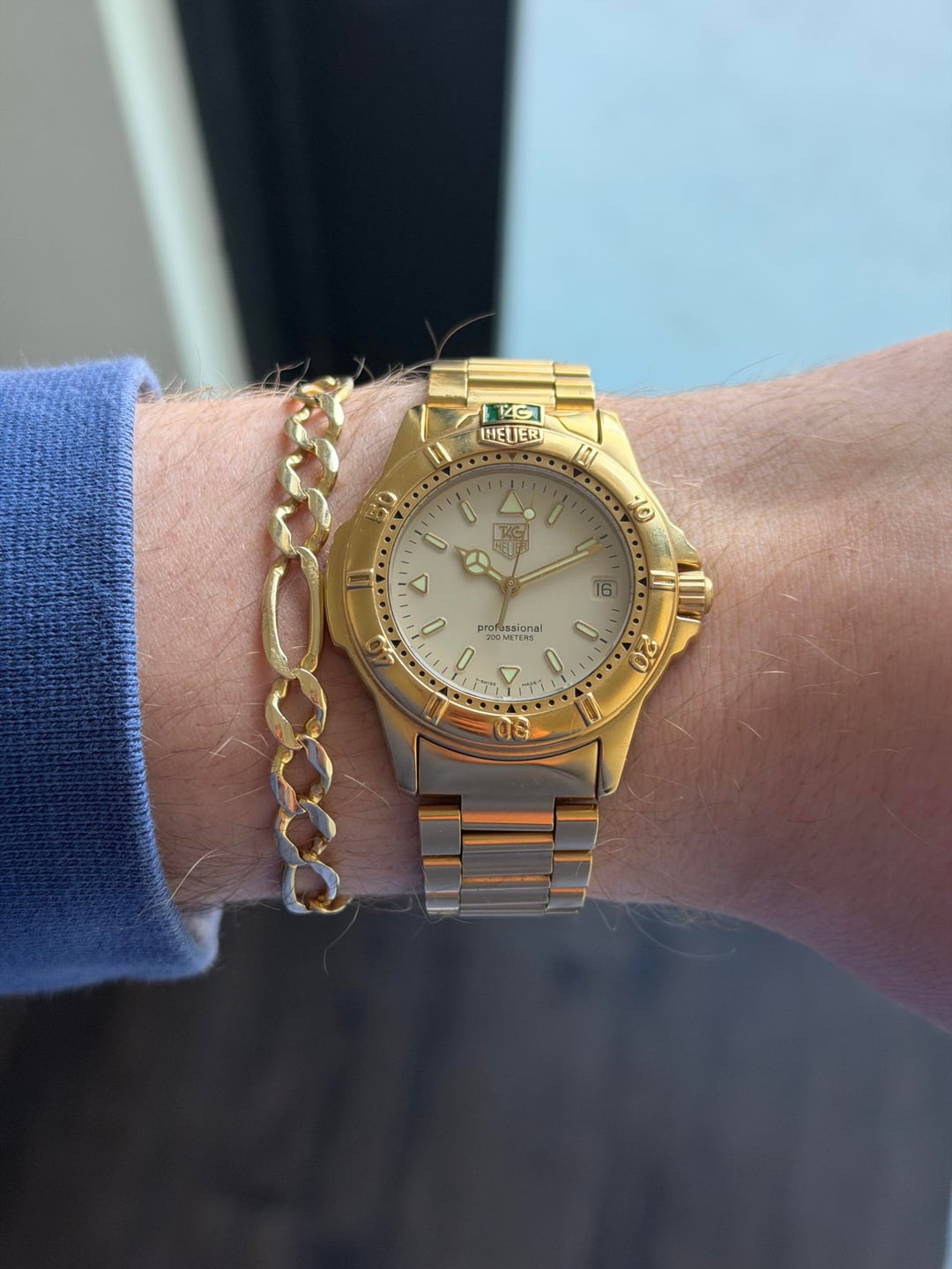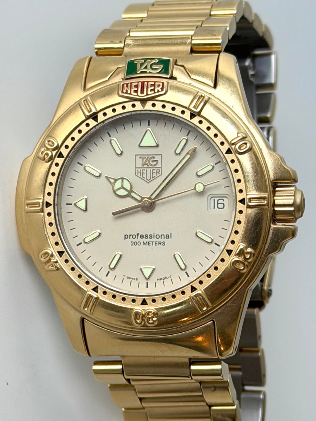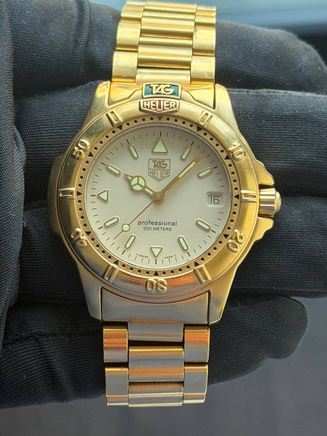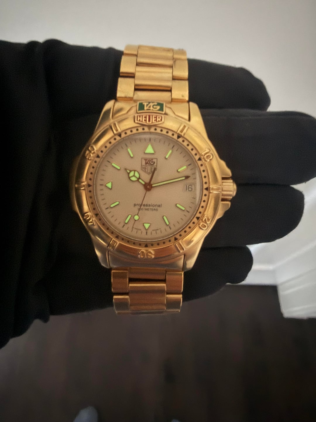 Tag Heuer Professional 4000 Gold Major Wolf of Wall Street vibes! 💸 994.706. Watch only. 7.75” bracelet. Movement and crown function perfectly. Bezel turns but is stiff. Strong lume **$499** / Zelle, PayPal, or WU accepted. Timestamp: https://imgur.com/a/a78WN9c I have **tons** of references on multiple platforms including WatchExchange. I am more than happy to show these.