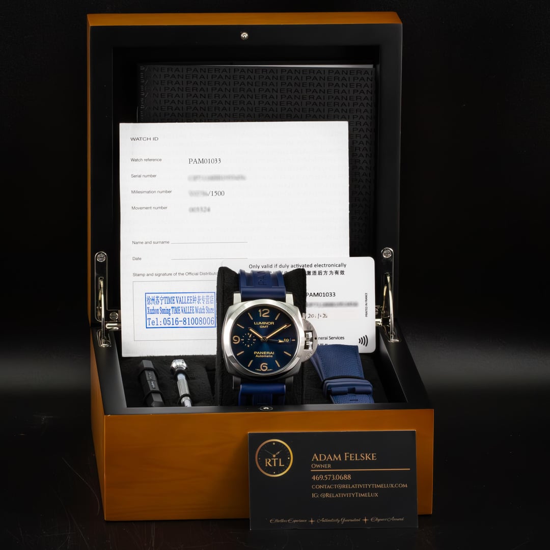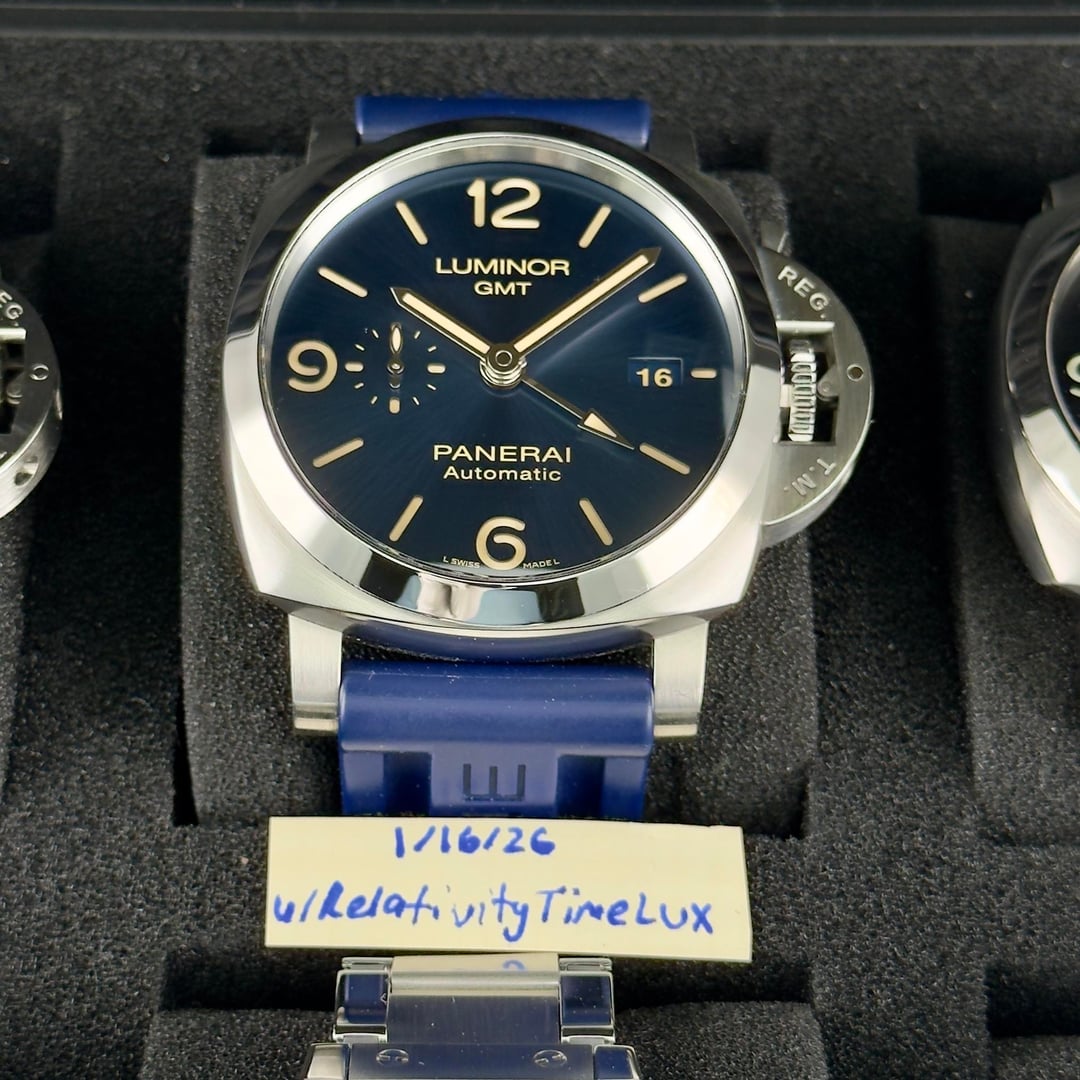 **Key Details:** * **Condition**: Very good condition, rated at 9.5/10, with minimal handling marks. See detailed photos for full transparency. * **Included**: Inner Panerai box, booklet, extra AM RubberB strap, and warranty card (dated 2020). * Reference: PAM01033 **Asking**: 5950 **Trades Welcome** RelativityTimeLux All pics -> [https://imgur.com/a/YiNMMvF](https://imgur.com/a/YiNMMvF) Timestamp -> [https://imgur.com/k9wdT0l](https://imgur.com/k9wdT0l)