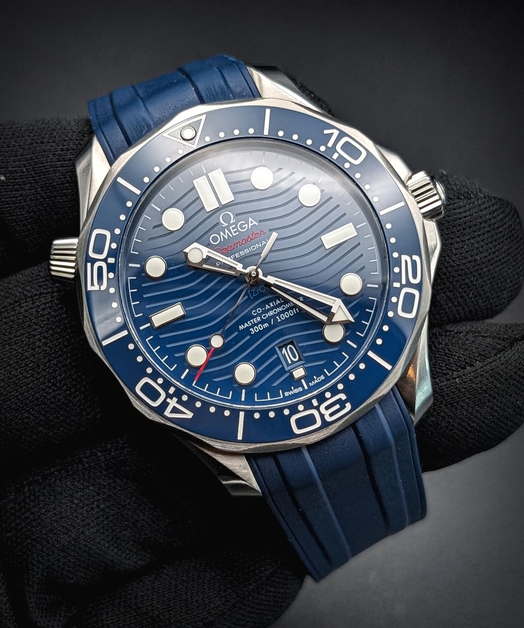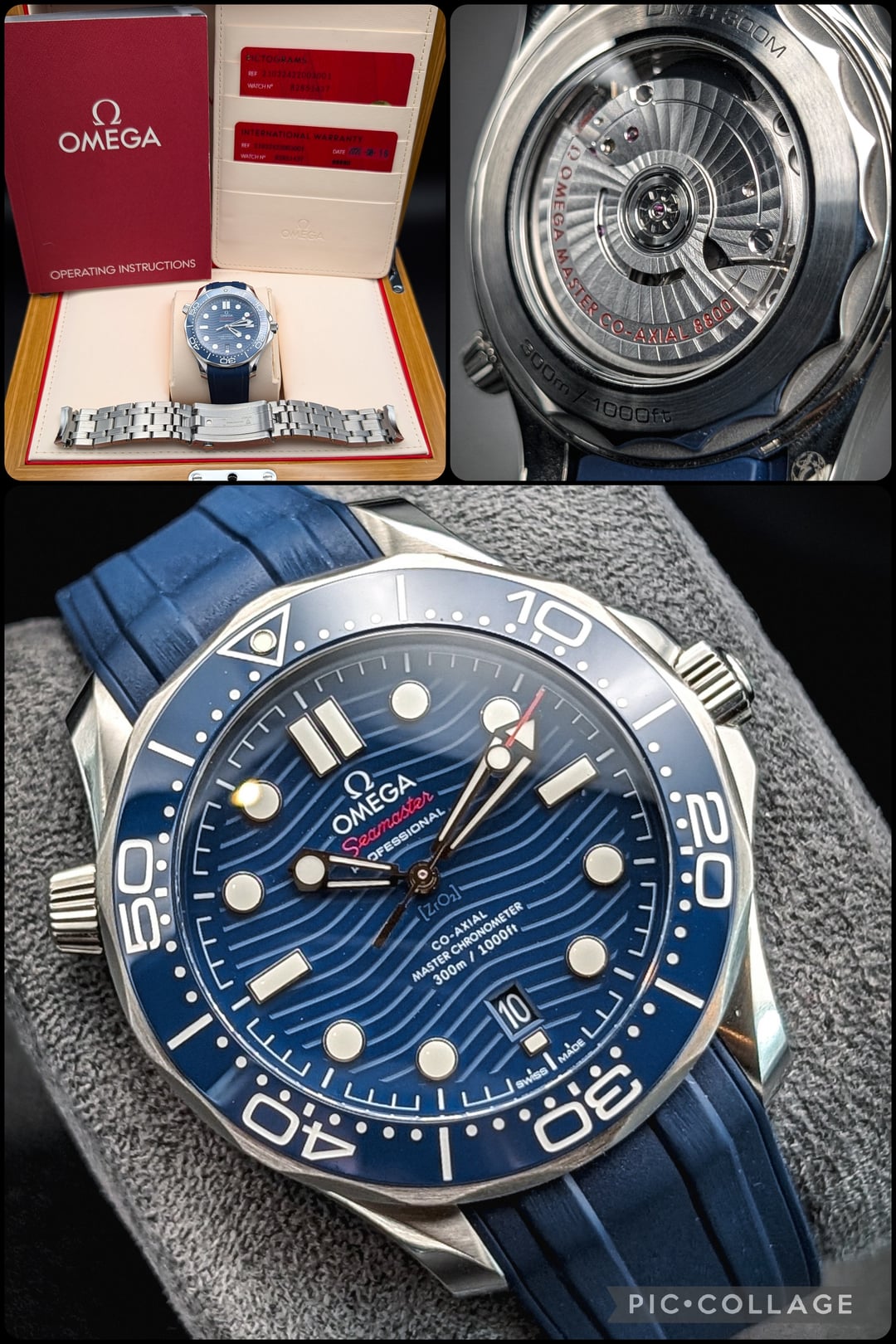 Selling a classic Seamaster Professional 300 blue wave dial in excellent condition, running well and as a near full set. This is the updated and refined version of the Bond Seamaster, the one we saw Pierce Brosnan wear, but offered now with a beautiful deep blue dial and high accuracy movement certified by Metas. This one is packed with all the most modern tech from Omega and runs and wears amazing. It comes with both the OEM rubber strap and an aftermarket bracelet. Pick this up as an excellent condition full set at a steep discount here for $4150 shipped to your door. Brand: Omega Model: SMP Seamaster Pro 300 Blue Wave Dial Full Set w/ Extras Reference: 210.30.42.20.04.001 Case Size: 42mm Year: 2020 Comes as: Set with Watch, OEM strap, high quality aftermarket bracelet, outer and inner boxes, warranty card, pictogram card , manual . Missing chronometer card, but this is inconsequential. Condition: Excellent condition with only very minor wear from normal use 9/10. Runs excellent on timegrapher (pic in album) Price:$4,150 Image Gallery: [https://postimg.cc/gallery/GLbPw7z](https://postimg.cc/gallery/GLbPw7z) Timestamp: [https://postimg.cc/9zZ1GGzR](https://postimg.cc/9zZ1GGzR) Open to trades or purchase of: Modern Rolex, Tudor, Omega, Cartier, Breitling, Grand Seiko, IWC, Zenith. Payment Methods: Zelle or Wire. Paypal FF, Venmo and stable currency crypto available for established buyers
