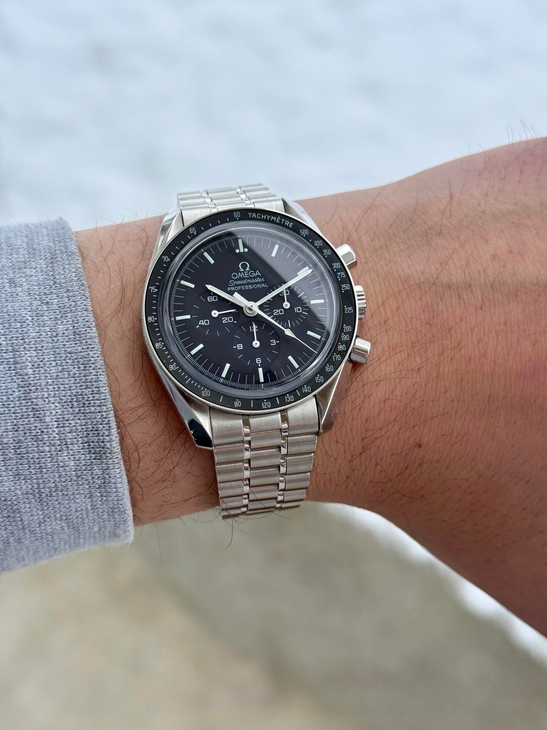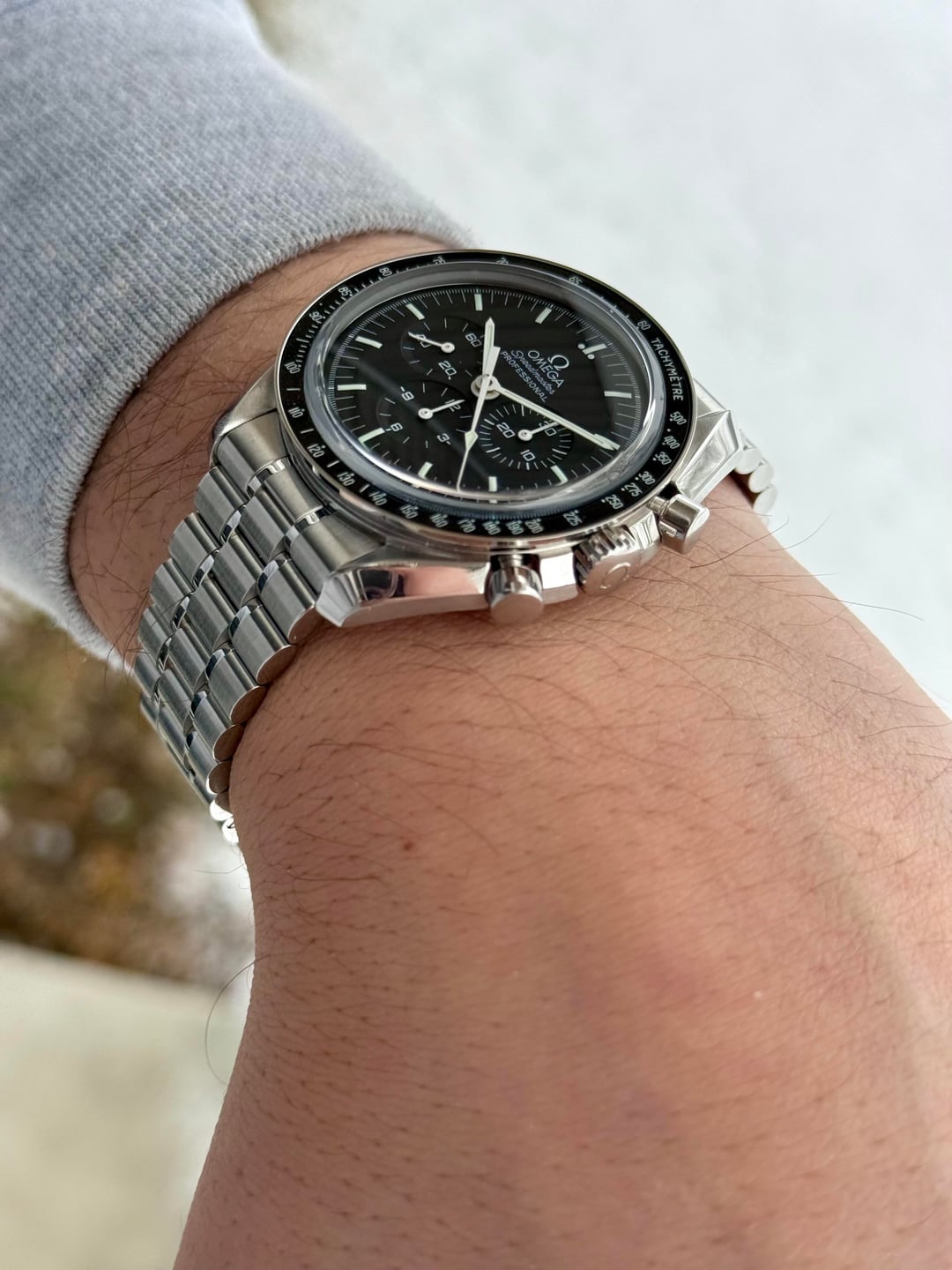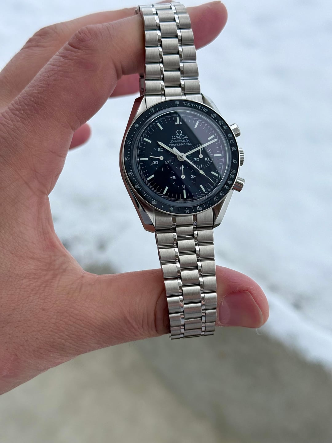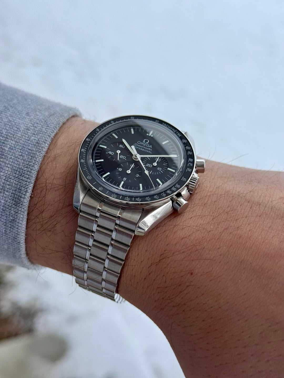 Hello WatchEx, Selling my Omega Speedmaster Professional Sapphire Sandwich powered by the highly regarded caliber 1863. This is a watch-only sale, upgraded with the latest Omega OEM 3861 bracelet, installed yesterday at the Omega Boutique along with fresh OEM spring bars. Timestamp / video: https://imgur.com/a/5bvvM2O Price: $5,600 shipped CONUS (net to me) Payment: PayPal F&F, Zelle, Wire Trades: Not at this time Included: • ✅ Watch head • ✅ New Omega OEM 3861 bracelet • ❌ No box • ❌ No papers or service history, but running very strong and passed pressure test at Omega • ❌ No original bracelet or bezel Details • Model: Omega Speedmaster Professional Sapphire Sandwich • Movement: Cal. 1863 (display caseback) • Crystal: Sapphire front & back • Bezel: Spiralwinder Ceramic DON (Dot Over Ninety) tachymètre bezel • Bracelet: New OEM 3861 bracelet (boutique installed with fresh OEM spring bars - ready to wear for many years!) • Condition: Excellent; runs strong and keeps excellent time, chrono functions flawlessly, winds smooth. Has some scratches on the polished bits of the case (see photo - can buff easy), otherwise fantastic condition and lines are crisp. Why the 1863? The 1863 is widely considered one of the most livable Moonwatch movements: • Proven Lemania-based architecture • Easier and less expensive to service long-term than the co-axial 3861 • No Master Chronometer magnetism considerations • Display caseback while retaining classic Moonwatch character Bracelet Upgrade The current-generation 3861 bracelet is a major improvement over older Speedmaster bracelets: • Better taper, slimmer feel, and excellent comfort • Improved balance on wrist • Installed by Omega Boutique yesterday • $1,000 retail, reflected in the price Pricing $5,600 shipped CONUS, net to me, priced to reflect: • Watch-only status • Excellent condition • Spiralwinder Ceramic DON bezel ($250 upgrade - makes this watch contemporary) • Recent $1,000 OEM 3861 bracelet upgrade Not in a rush to sell. Happy to answer questions or provide additional photos/videos for serious buyers. Plenty of references available. Thanks for looking