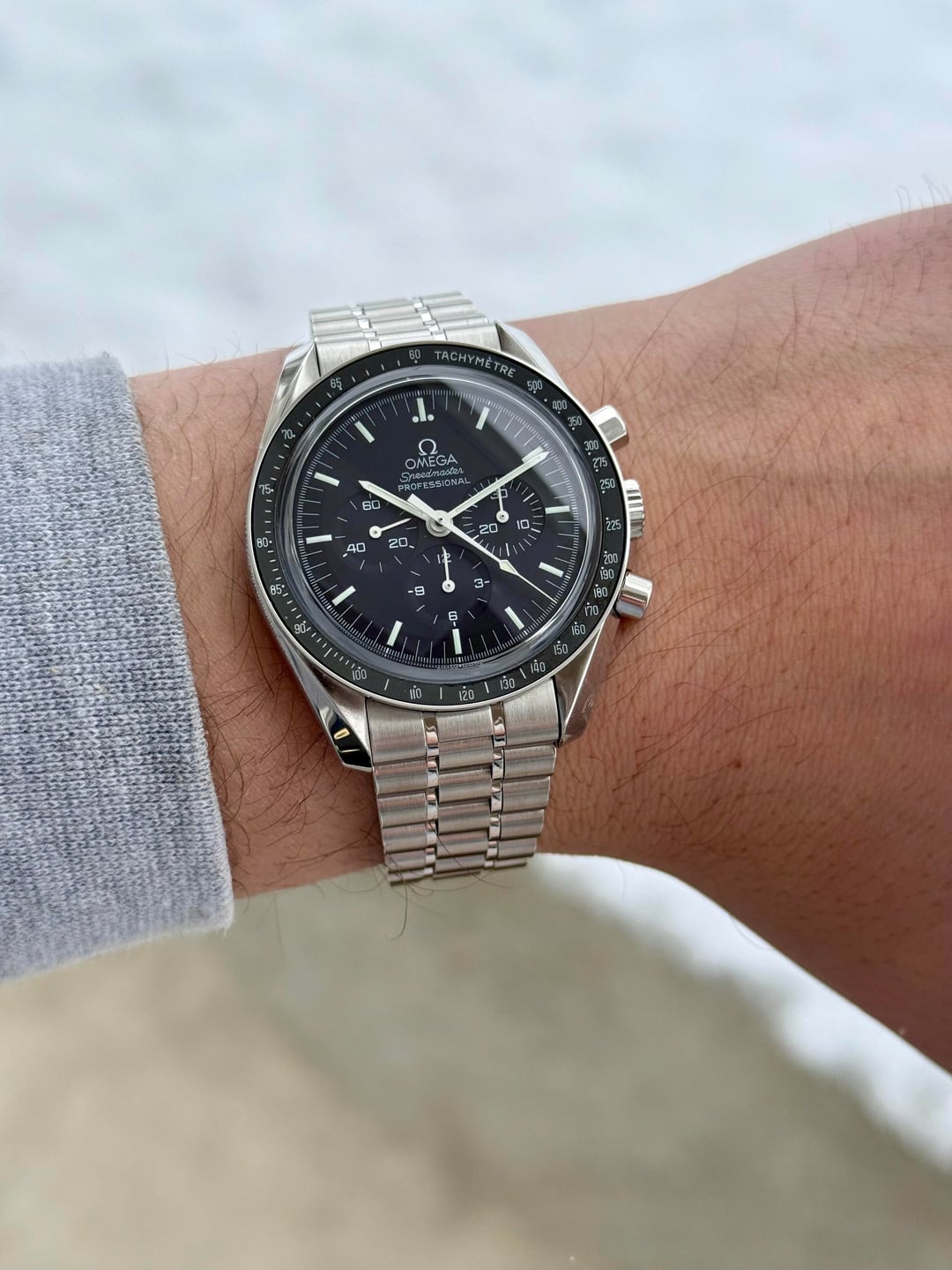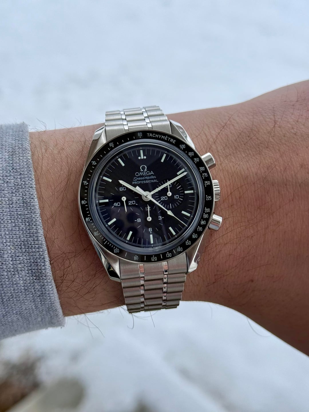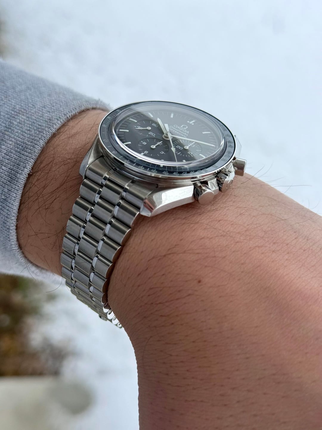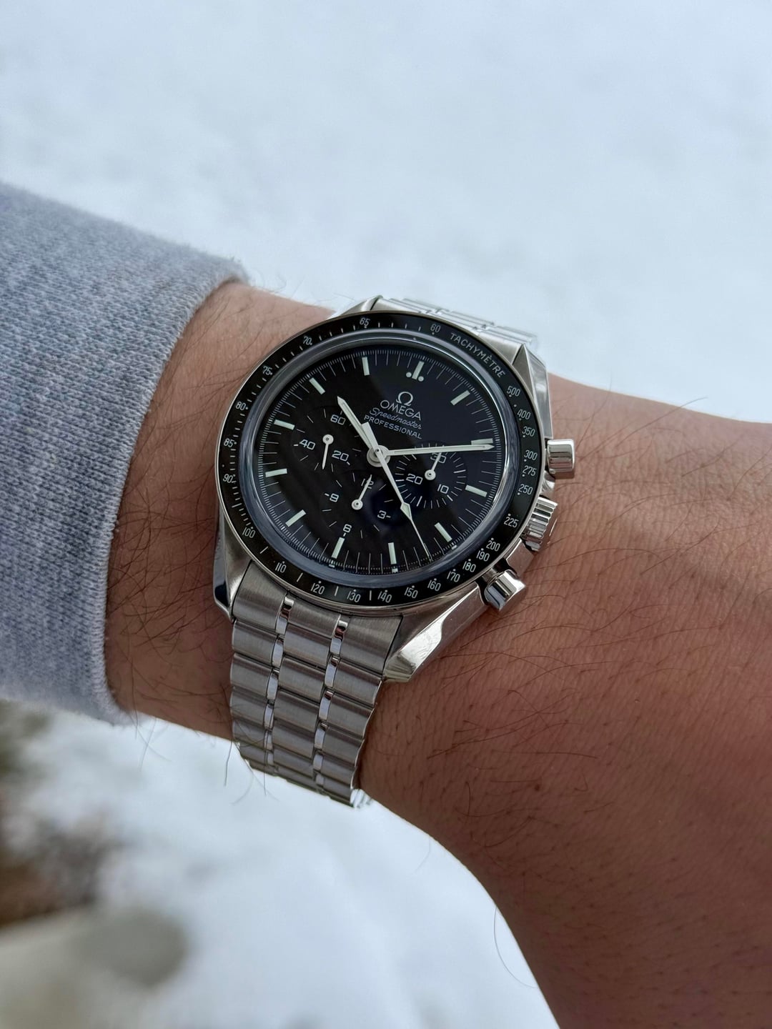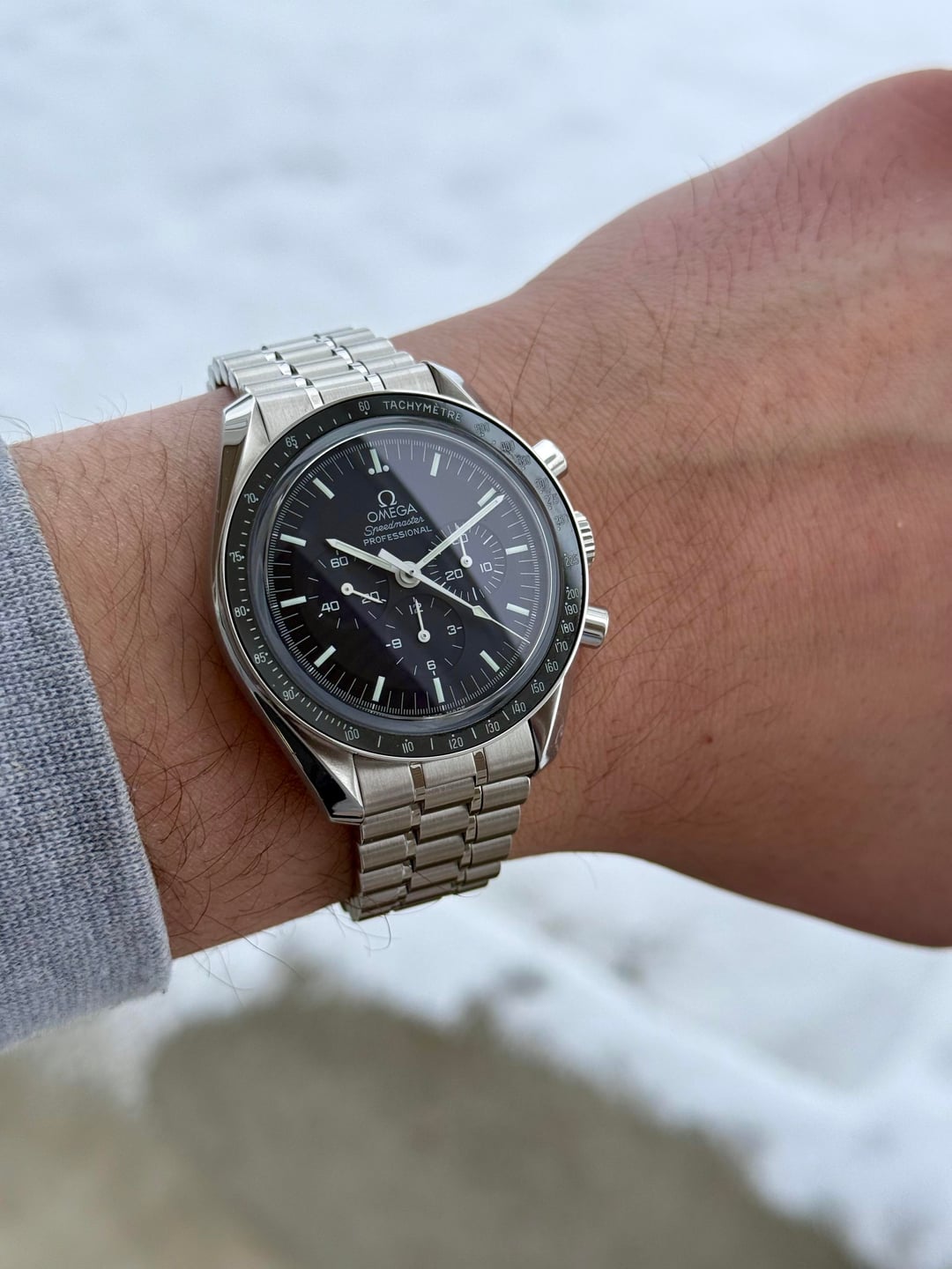 Hello WatchEx, Selling my Omega Speedmaster Professional Sapphire Sandwich powered by the highly regarded caliber 1863. This is a watch-only sale, upgraded with the latest Omega OEM 3861 bracelet, installed yesterday at the Omega Boutique along with fresh OEM spring bars. Timestamp / video: https://imgur.com/a/5bvvM2O Price: $5,600 shipped CONUS (net to me) Payment: PayPal F&F, Zelle, Wire Trades: Not at this time Included: • ✅ Watch head • ✅ New Omega OEM 3861 bracelet • ❌ No box • ❌ No papers or service history, but running very strong and passed pressure test at Omega • ❌ No original bracelet or bezel Details • Model: Omega Speedmaster Professional Sapphire Sandwich • Movement: Cal. 1863 (display caseback) • Crystal: Sapphire front & back • Bezel: Spiralwinder Ceramic DON (Dot Over Ninety) tachymètre bezel • Bracelet: New OEM 3861 bracelet (boutique installed with fresh OEM spring bars - ready to wear for many years!) • Condition: Excellent; runs strong and keeps excellent time, chrono functions flawlessly, winds smooth. Has some scratches on the polished bits of the case (see photo - can buff easy), otherwise fantastic condition and lines are crisp. Why the 1863? The 1863 is widely considered one of the most livable Moonwatch movements: • Proven Lemania-based architecture • Easier and less expensive to service long-term than the co-axial 3861 • No Master Chronometer magnetism considerations • Display caseback while retaining classic Moonwatch character Bracelet Upgrade The current-generation 3861 bracelet is a major improvement over older Speedmaster bracelets: • Better taper, slimmer feel, and excellent comfort • Improved balance on wrist • Installed by Omega Boutique yesterday • $1,000 retail, reflected in the price Pricing $5,600 shipped CONUS, net to me, priced to reflect: • Watch-only status • Excellent condition • Spiralwinder Ceramic DON bezel ($250 upgrade - makes this watch contemporary) • Recent $1,000 OEM 3861 bracelet upgrade Not in a rush to sell. Happy to answer questions or provide additional photos/videos for serious buyers. Plenty of references available. Thanks for looking