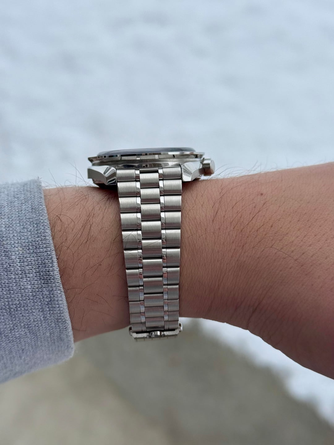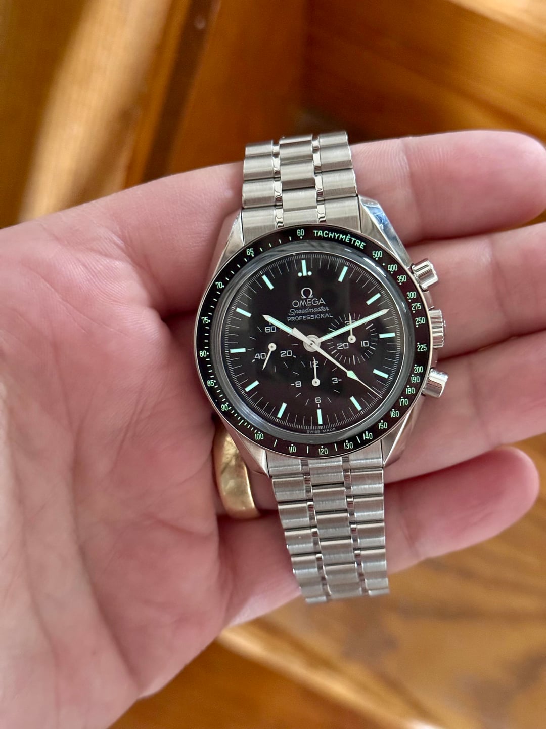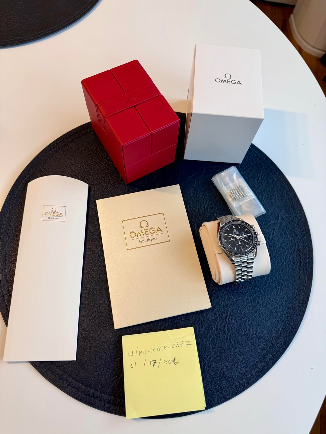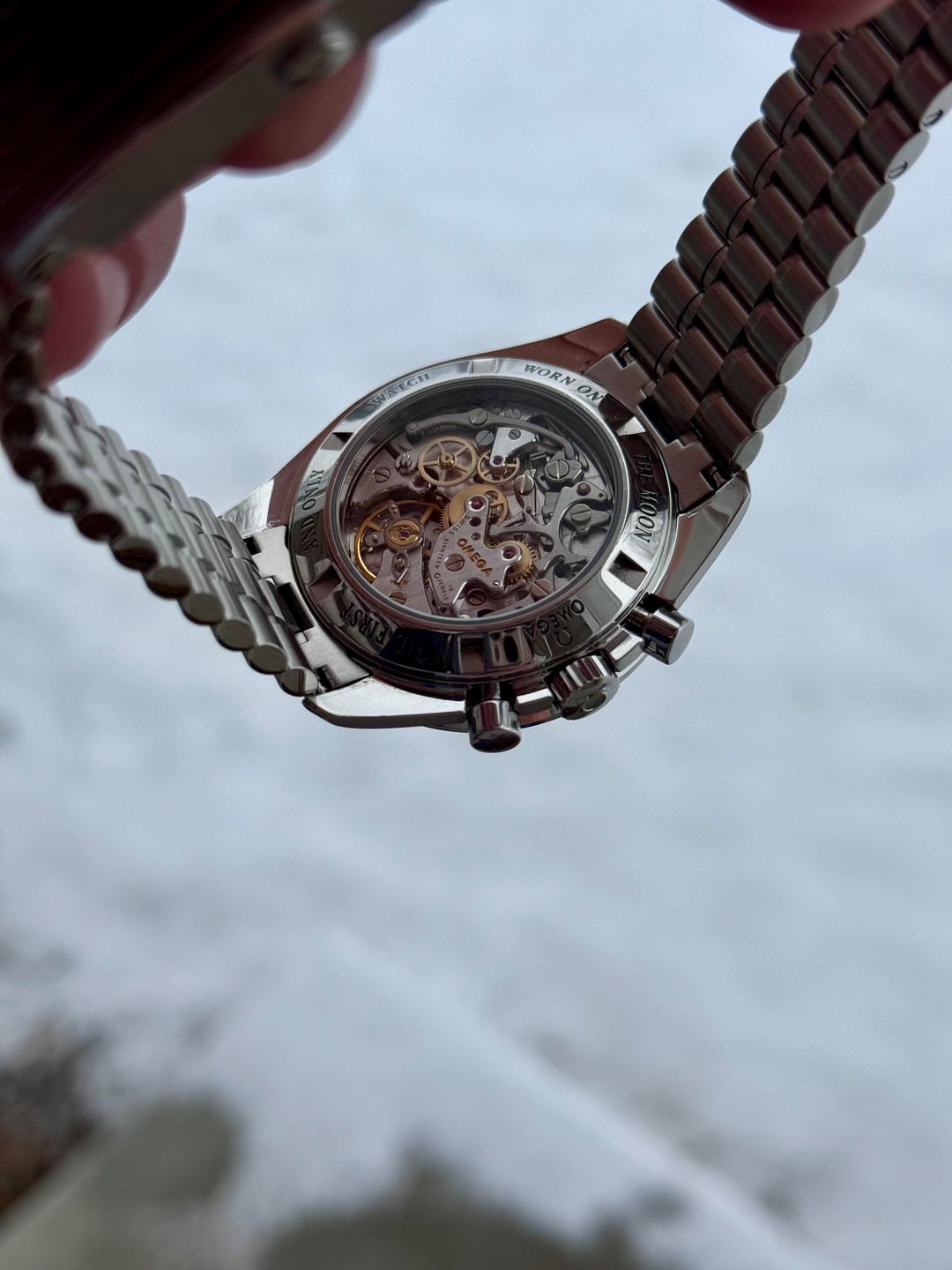 Hello WatchEx, Selling my Omega Speedmaster Professional Sapphire Sandwich powered by the highly regarded caliber 1863. This is a watch-only sale, upgraded with the latest Omega OEM 3861 bracelet, installed yesterday at the Omega Boutique along with fresh OEM spring bars. Timestamp / video: https://imgur.com/a/5bvvM2O Price: $5,600 shipped CONUS (net to me) Payment: PayPal F&F, Zelle, Wire Trades: Not at this time Included: • ✅ Watch head • ✅ New Omega OEM 3861 bracelet • ❌ No box • ❌ No papers or service history, but running very strong and passed pressure test at Omega • ❌ No original bracelet or bezel Details • Model: Omega Speedmaster Professional Sapphire Sandwich • Movement: Cal. 1863 (display caseback) • Crystal: Sapphire front & back • Bezel: Spiralwinder Ceramic DON (Dot Over Ninety) tachymètre bezel • Bracelet: New OEM 3861 bracelet (boutique installed with fresh OEM spring bars - ready to wear for many years!) • Condition: Excellent; runs strong and keeps excellent time, chrono functions flawlessly, winds smooth. Has some scratches on the polished bits of the case (see photo - can buff easy), otherwise fantastic condition and lines are crisp. Why the 1863? The 1863 is widely considered one of the most livable Moonwatch movements: • Proven Lemania-based architecture • Easier and less expensive to service long-term than the co-axial 3861 • No Master Chronometer magnetism considerations • Display caseback while retaining classic Moonwatch character Bracelet Upgrade The current-generation 3861 bracelet is a major improvement over older Speedmaster bracelets: • Better taper, slimmer feel, and excellent comfort • Improved balance on wrist • Installed by Omega Boutique yesterday • $1,000 retail, reflected in the price Pricing $5,600 shipped CONUS, net to me, priced to reflect: • Watch-only status • Excellent condition • Spiralwinder Ceramic DON bezel ($250 upgrade - makes this watch contemporary) • Recent $1,000 OEM 3861 bracelet upgrade Not in a rush to sell. Happy to answer questions or provide additional photos/videos for serious buyers. Plenty of references available. Thanks for looking