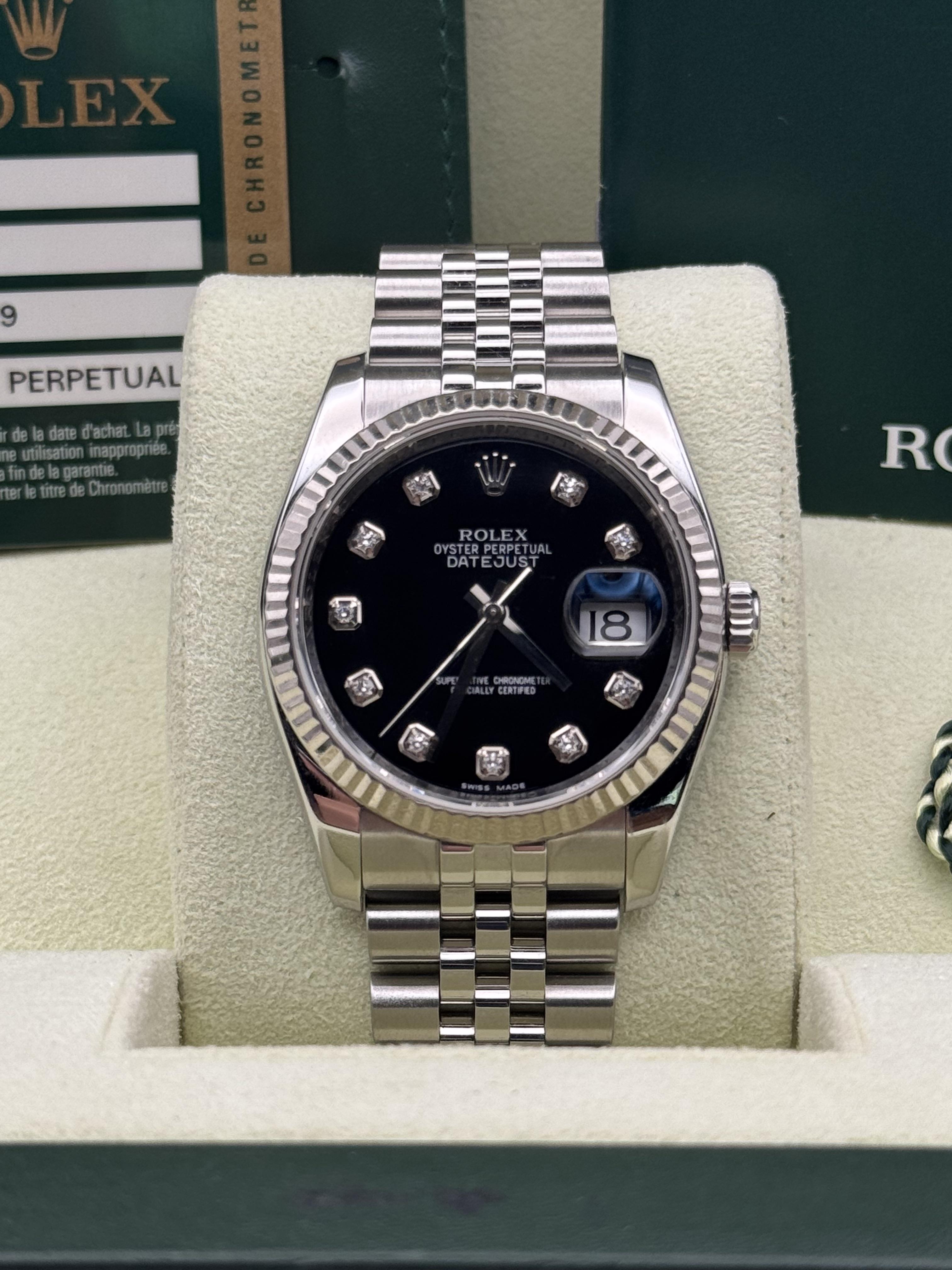 \*\*\*Please refer to photos showcasing the condition and signs of wear throughout the case, bezel and bracelet of the watch as previously mentioned in 'pre-owned condition'. This 116234 datejust features a stunning original black diamond dial, and comes on a hidden clasp jubilee bracelet with 5 removable screw links. It also has the original case back sticker. Watch is running and setting amazing. Bracelet fits up to approximately a 7 inch wrist size.\*\*\* Brand: ROLEX Model: DATEJUST Reference Number: 116234 Case Size: 36MM Box: YES Card/Papers: YES Year: OPEN DATE CARD & M-Serial Condition: PRE-OWNED Price: $8499+Shipping Timestamp & Additional Photos: [https://imgur.com/a/VkBtr7i](https://imgur.com/a/VkBtr7i) \*\*\*Accepted Payment Methods\*\*\* Zelle, Wire, Wise & Paypal F&F \*\*\*Shipping & Handling\*\*\* We offer FedEx Overnight, 2-Day & Ground shipping options. (Feel free to reach out to us about freight rates.) \*\*\*Offers & Negotiations\*\*\* While offers may be an option, we may not accept them on certain pieces. We price many of our most popular models as competitively as possible to stay in line with the market. However, we always consider reasonable offers when there is room for additional discounts. \*\*\*Contact Us\*\*\* If you have any questions or need additional details, don’t hesitate to contact us. We are happy to provide more photos, answer any inquiries, or discuss offers. Customer satisfaction is our priority, and we strive to ensure a smooth and transparent transaction.