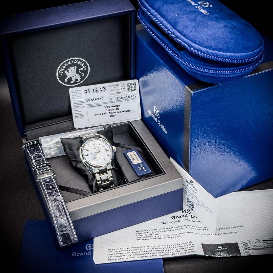 **Grand Seiko “Soko Frost” SBGA471G Full AD Set Dec 2023 Excellent Condition Unpolished Under Warranty through 2028 1 Owner.** 40.2mm Titanium Case | Spring Drive Caliber 9R65 | 72-Hour Power Reserve | Textured “Skyflake” Blue Dial | Sapphire Crystal | 100m Water Resistance | Titanium Bracelet + Blue Alligator Strap **Pricing** **Asking: $5195 + Ship** **Trades Always Considered** **Description** Housed in a 40.2mm high-intensity titanium case and powered by the ultra-smooth Spring Drive 9R65, this reference blends precision, elegance, and lightness in one unmistakable design. This single-owner 2023 example comes unpolished, in Excellent condition, and includes a complete set from the AD including both the original bracelet with all links and factory blue alligator strap with deployant clasp. **Condition** Excellent Pre-Owned – Light wear from careful use, minor surface marks. Unpolished with sharp lines. Running smoothly with accurate Spring Drive glide. 5Y transferable warranty from date of purchase. One Owner. **Complete Set Includes** * Grand Seiko Inner and Outer Boxes * Warranty Card (5Y Transferrable Warranty from Date of Purchase, Dec 23, 2023) * Operating instructions & Booklet * Bracelet with All Links * Blue Alligator Strap with Deployant Clasp * Blue Factory Travel Case **Shipping** Ships from Scottsdale, AZ – Priority Overnight via FedEx **Hundreds of Deals, References, Reviews, etc. Buy with confidence.** **Find me on IG Cactusluxecollective**