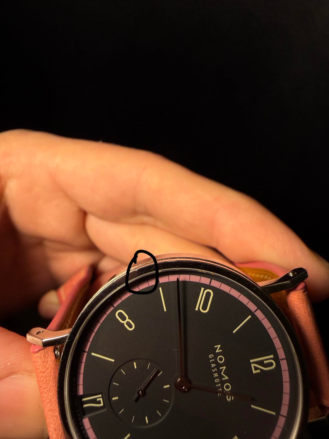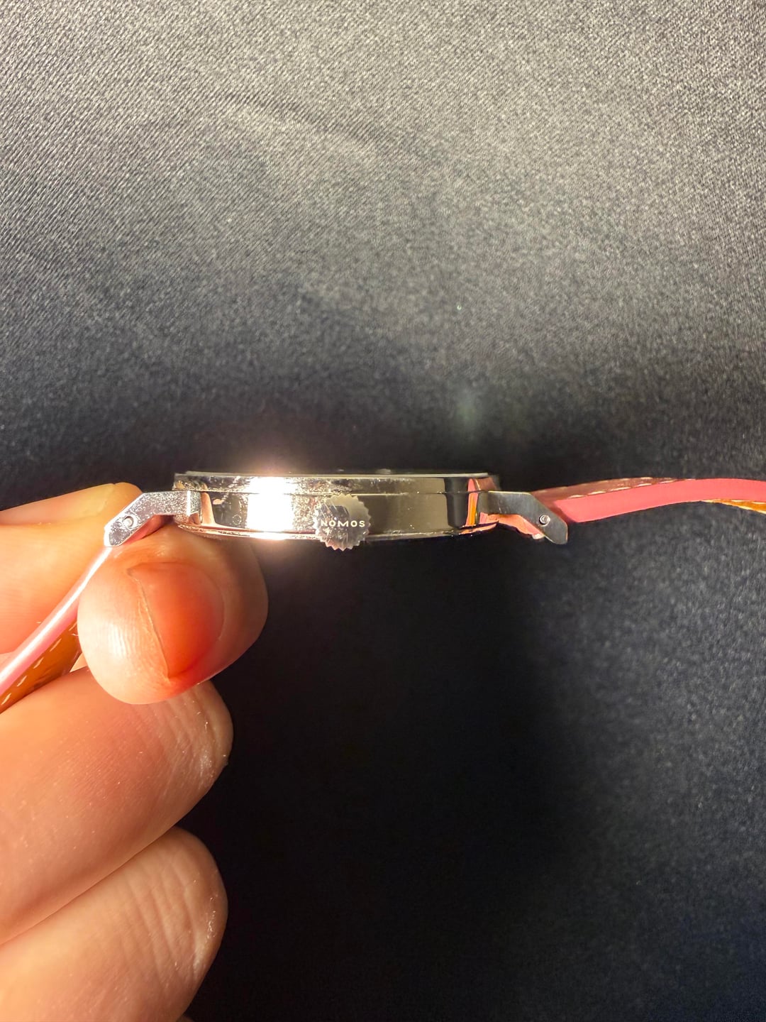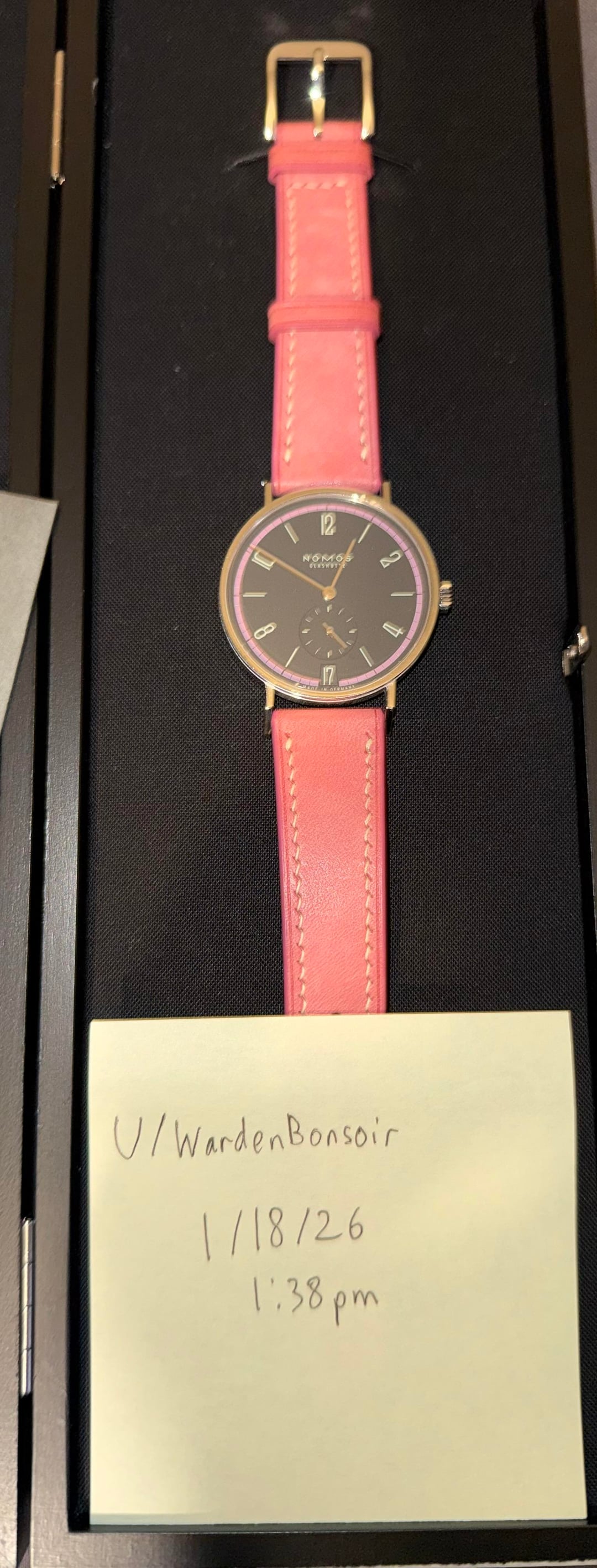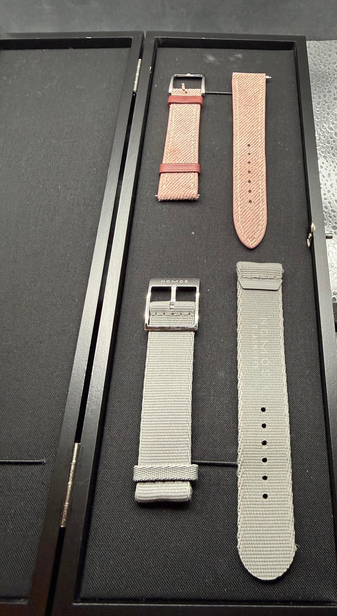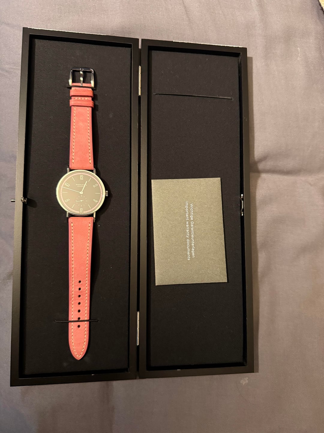 Hello WatchEX! Looking to sell Nomos Tangente 38 Date TIefseegrau Limited Edition. I purchased this in September 2025, just four months ago, from Burdeen's Jewelry in Chicago. This ended up just not being the watch for me. It comes with original box, warranty card and two extra straps. There's one minor ding on the case that I've been told would be easy to fix for someone who knows how to do it. It is circled in one of the pictures. It is currently pictured in the Sakura strap from Has No Bounds. It will also come with the original Nomos gray utility strap and the Denim strap from Has No Bounds. Looking for sure $2,500, insured CONUS, shipping included. I am open to offers, but not looking to trade. I prefer PayPal or Venmo. Buyer's protection at buyer's expense. I have one transaction from this sub that is not noted. I purchased a watch from u/topherkohl Happy to get on a video call to prove ownership or answer questions. Any other information available upon request.