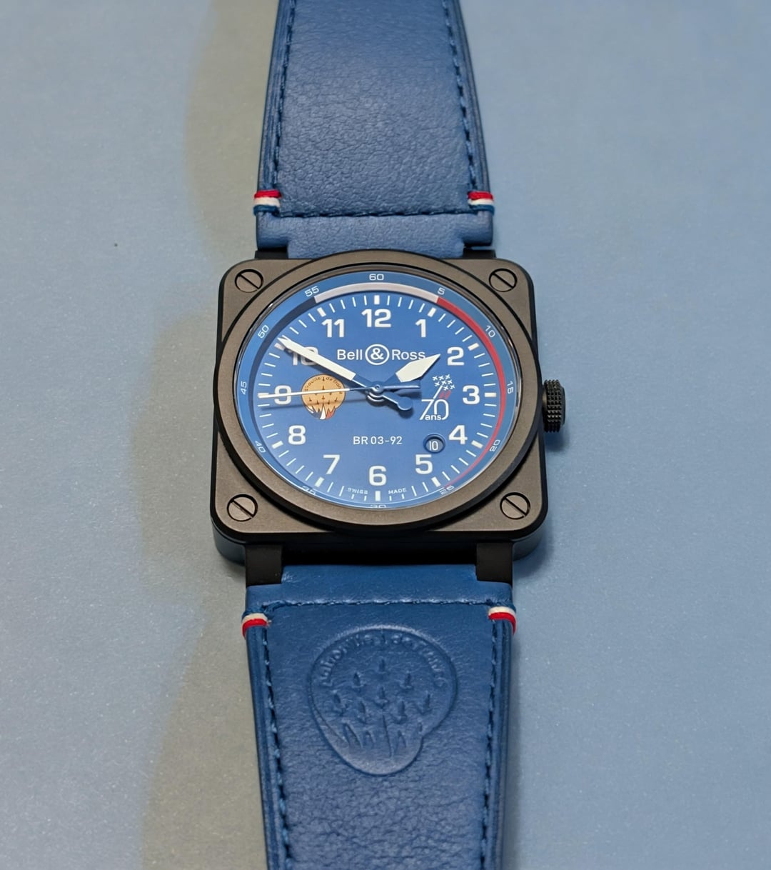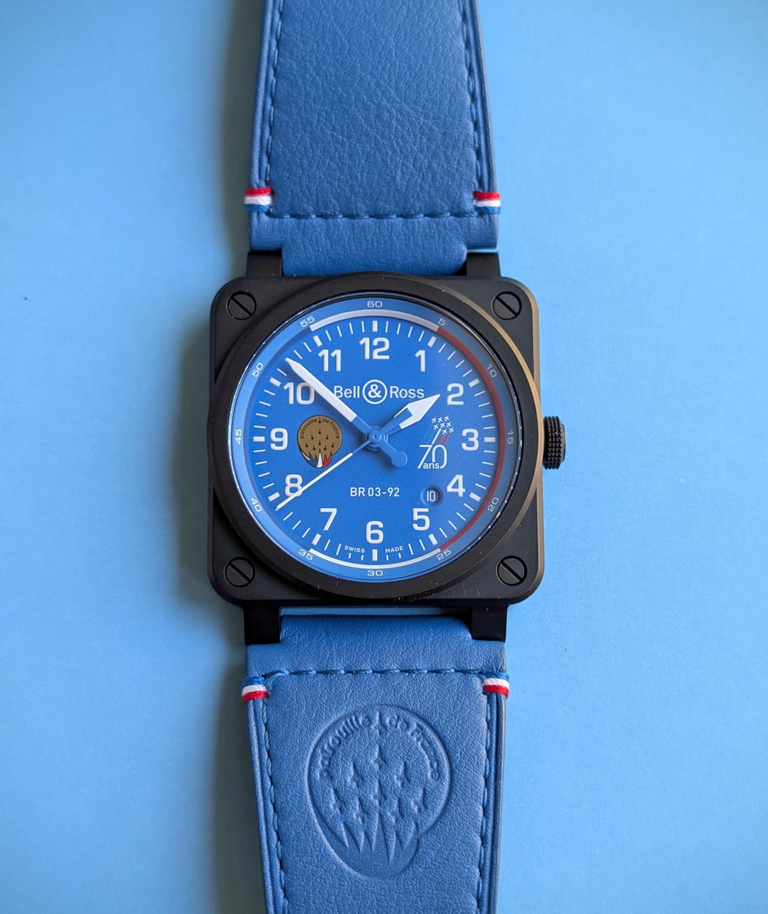 **Bell & Ross BR 03-92 Patrouille de France - 70th Anniversary - Limited Edition** The BR 03 platform is a modern cockpit instrument turned wristwatch — square case, ultra-legible dial, matte finishes. This release celebrates both the spirit of aviation as well as French Air and Space Force’s Patrouille de France. 42mm microblasted black ceramic case on blue leather strap, also includes a factory black synthetic canvas strap. B&R Caliber BR-CAL.302 automatic movement. Complete with boxes, booklets and papers. Reference: BR0392-PAF7-CE/SCA More images: [https://imgur.com/a/V8NYWdx](https://imgur.com/a/V8NYWdx) $2,600 plus shipping 🛫 Watches shipped FedEx fully insured. Local pickup available in Los Angeles area 🤝 💬Positive feedback from hundreds of successful transactions across the watch community, including WUS, Chrono24, eBay, Facebook, and Reddit. I’m always happy to connect by phone or video call to answer questions or verify details. 💸 Zelle, Venmo and wire accepted. ⭐150+ five-star reviews on Chrono24 — buy with confidence.⭐ ⌚I have a wide range of exceptional watches available, with new pieces added every week.⌚
