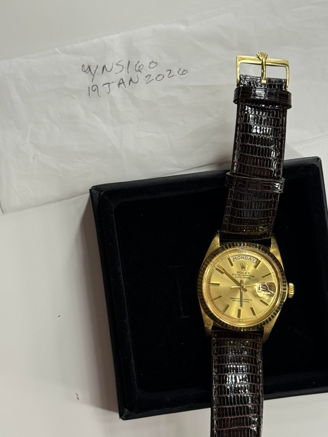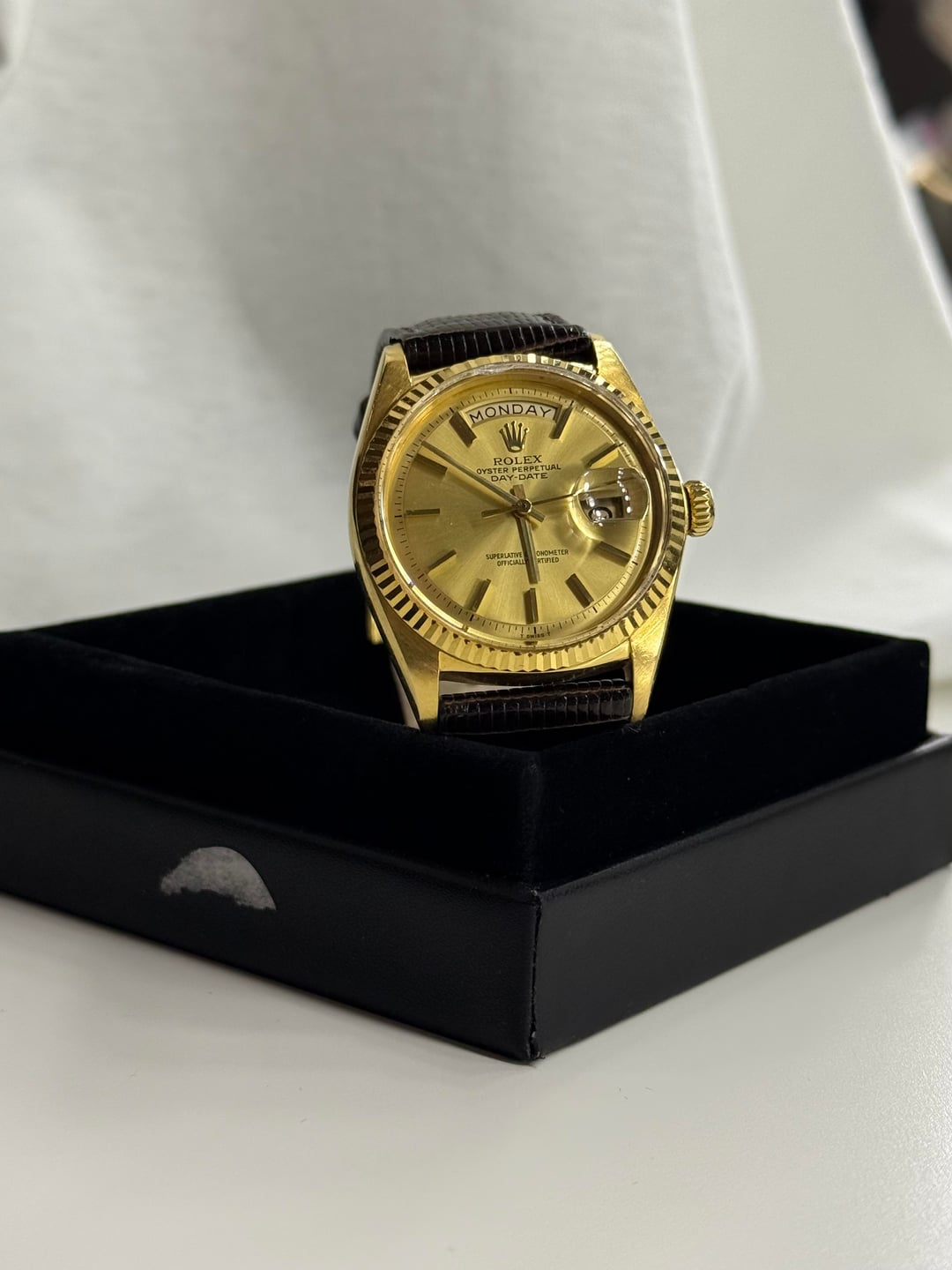 Up for sale is a classic Rolex Day-Date ref. 1803 in 18k yellow gold, featuring a champagne dial, fluted bezel, and acrylic crystal with Cyclops. This is the iconic 36 mm Day-Date that defines vintage Rolex. The watch is paired with a genuine tobacco-colored lizard strap with 18kt Rolex buckle that complements the gold beautifully and wears comfortably. A timeless, elegant piece that works equally well dressed up or casually. Details: • Reference: 1803 • Case: 18k Yellow Gold, fluted bezel • Dial: Champagne • Crystal: Acrylic + extra crystal included • Movement: Automatic • Case Size: 36 mm • Strap: Genuine lizard strap w Rolex 18k buckle. • Includes: Watch only ⸻ Condition: • Case shows honest vintage wear consistent with age, no deep gouges. Acrylic crystal is chipped but will include a new crystal as well. • Dial is clean and attractive with great warmth • Day and date function properly and change when they should. • Winds, sets, and runs as expected for a vintage piece Looking to sell at ask or trade down for a medium santos full set. Thank you for looking. Asking for $8,550 via Zelle or wire + L anywhere in CONUS.