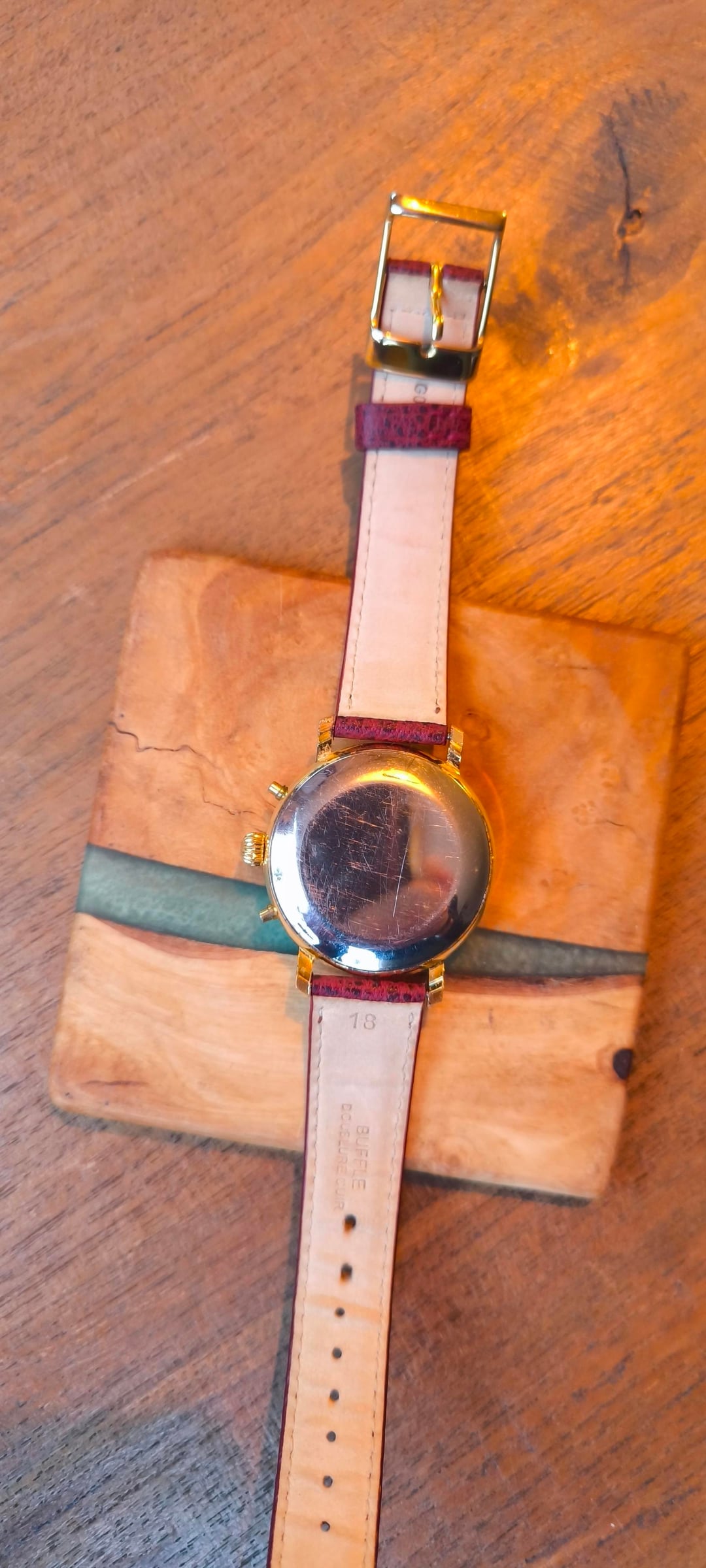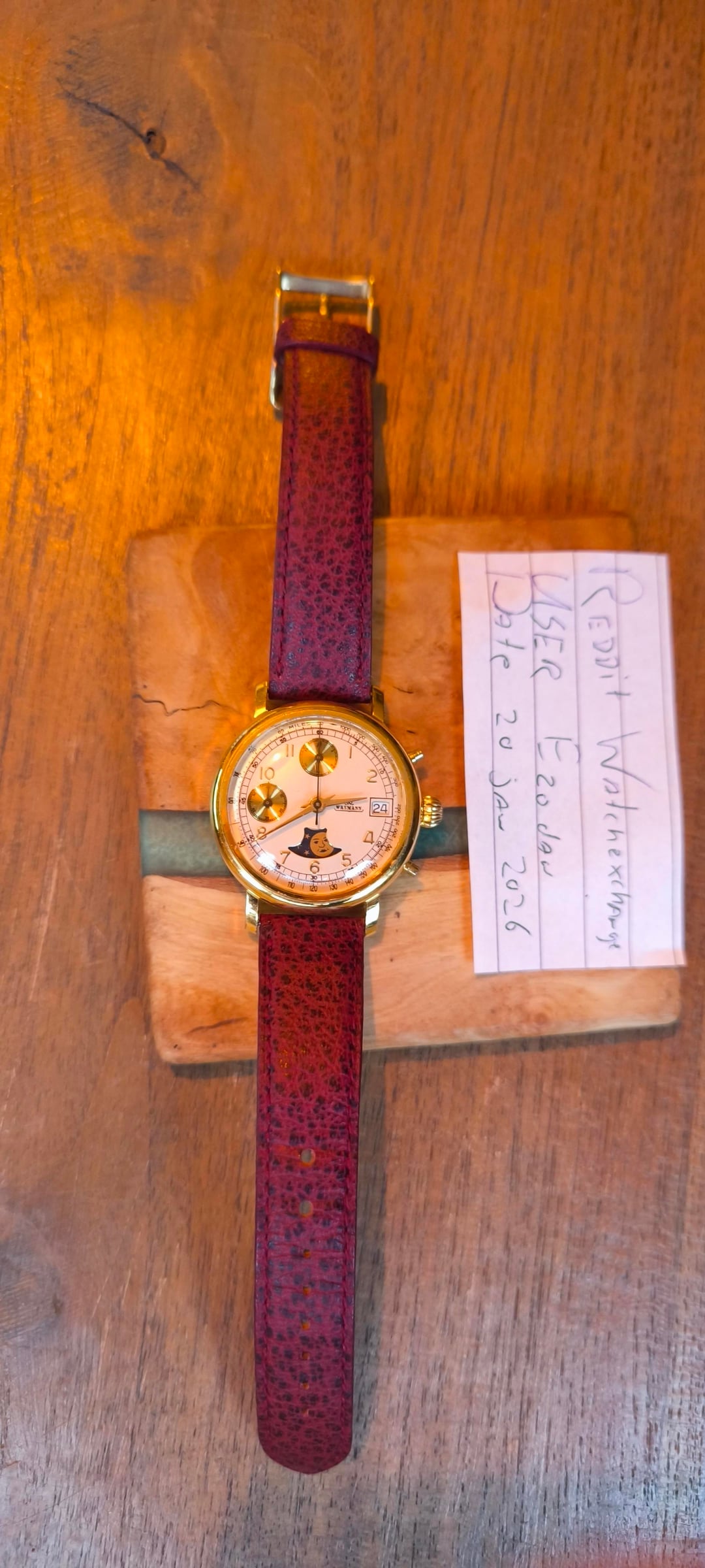 For sale: Wasmann moonphase Chronograph (Swiss Valjoux 7768) Condition: The watch remains in very good condition and only had some slight user markings but no deep scratches or dents. Also the gold remains crisp and I dont see any discoloration of the gold. Details: 38mm case excluding crown, manual wind, chronograph and Moonphase complication. Swiss Valjoux 7768 movement. The dial has beautiful gold tones in the form of spiral patterns in the subdials and raised numerals on the dial. Includes: Watch + strap. Price:$375 + shipping (approx $45 to the US) Payment: PayPal F&F or G&S for anyone with at least 1 transaction/reference on watchexchange (+4,3% fee for the buyer). Shipping: Worldwide with tracking, signature for delivery and insurance (FedEx to the US). Location: The Netherlands, Europe.