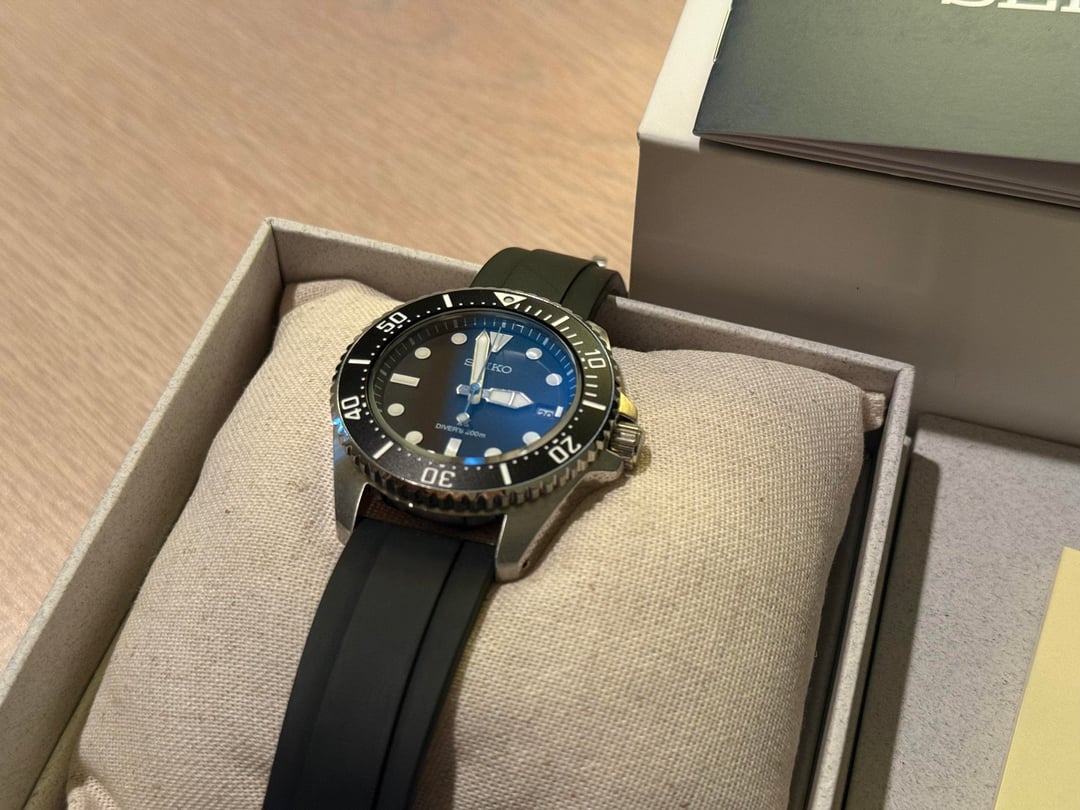 First time seller, second time posting here so be gentle. Selling on my very lightly used SNE597 I bought from [Long Island](https://longislandwatch.com/seiko-41mm-prospex-black-dial-solar-dive-watch-sne597/) just before Christmas. Wore it a few times before deciding I wanted something a bit different. No visible scratches or wear. Includes box, oem bracelet, uncle Seiko blue strap, and an amazon black rubber strap. Asking ~~$395~~ $375 shipped from WA to CONUS. Since this is my first sale here I will stick with PayPal G&S and I will eat the fee.