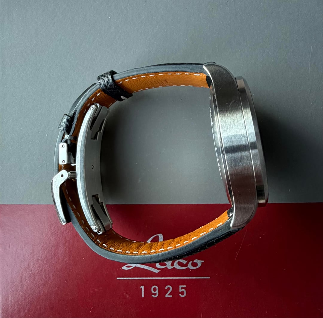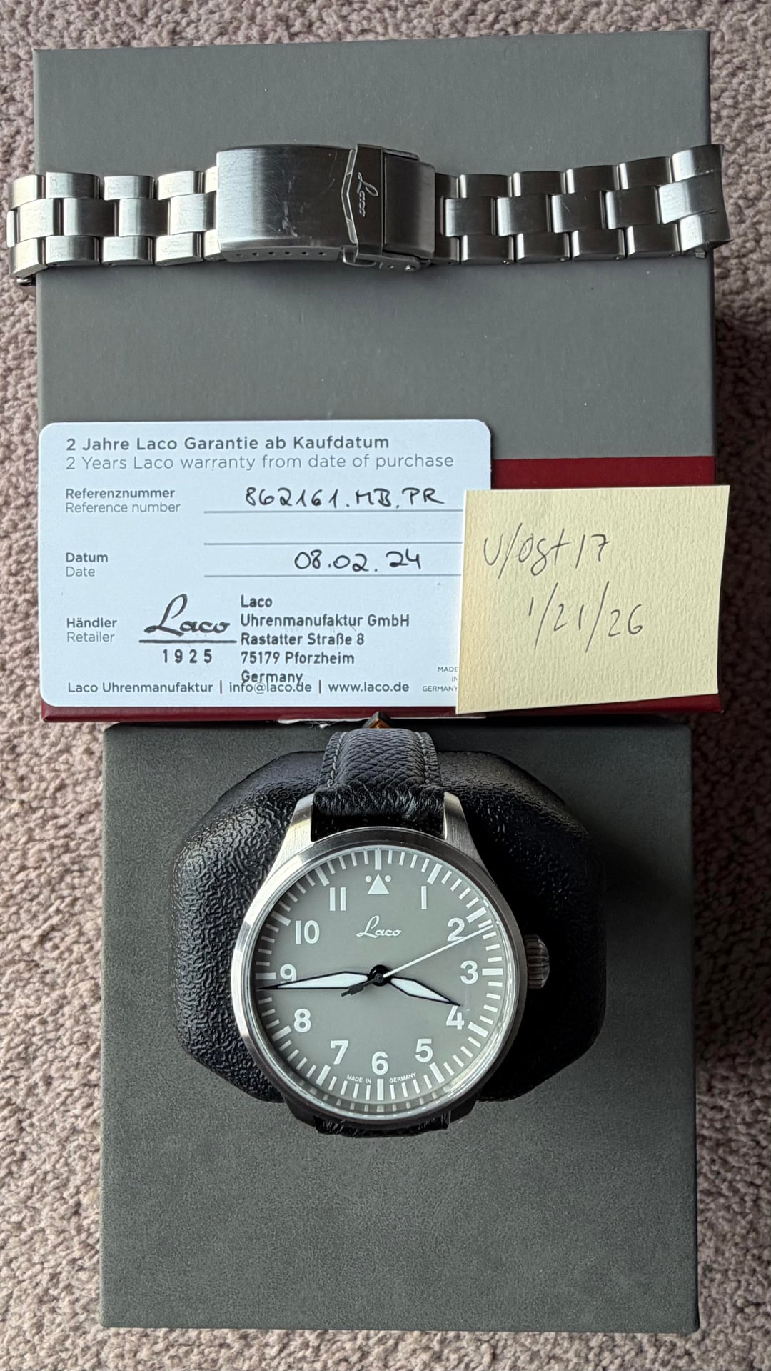 Selling a Laco Pilot Augsburg Grau 39mm * Great condition (see pictures) * Has an upgraded movement Laco 31 * Comes with a Tüns strap with Dlugs deployant clasp * Original bracelet * Full set - dated 8/2/24 * Does have a small engraving on the rotor Price $350 Fixed CONUS only Zelle preferred No trades