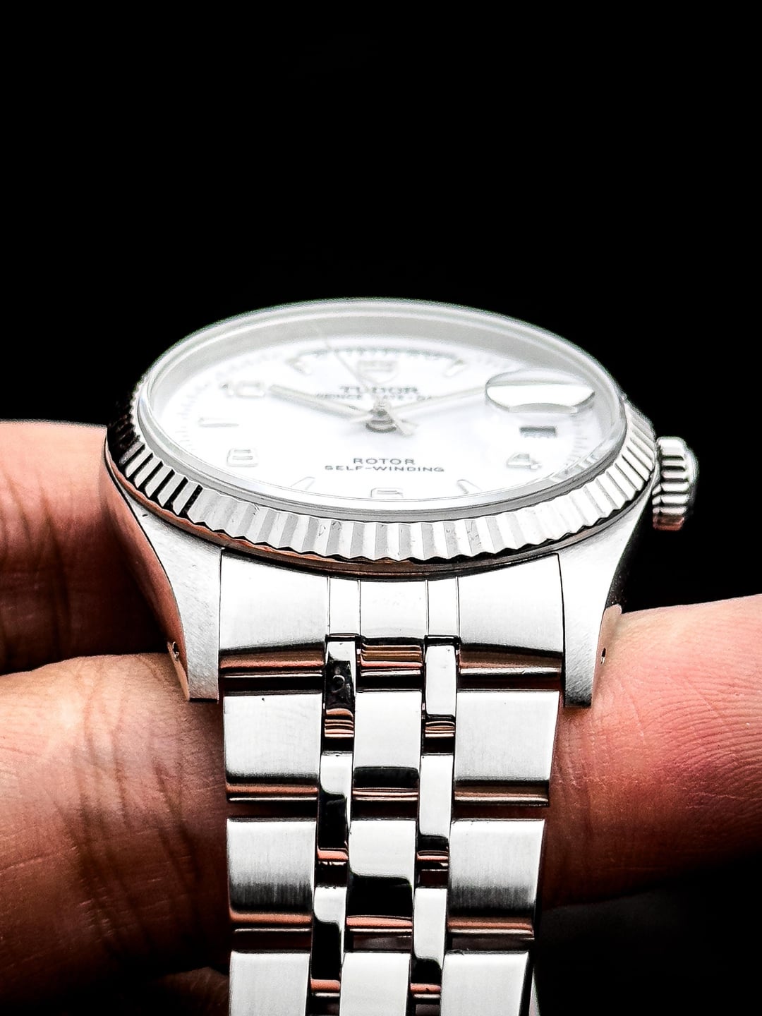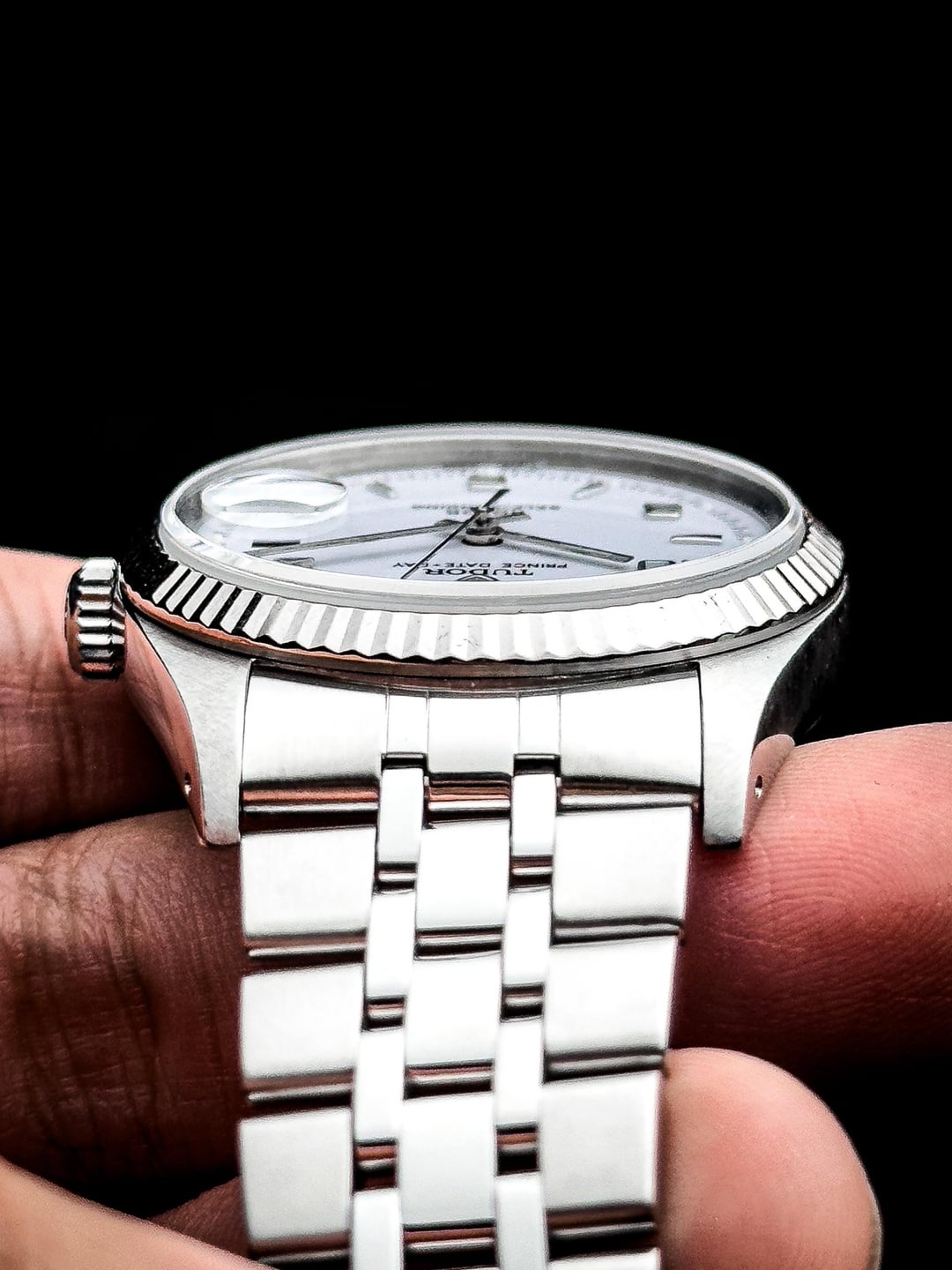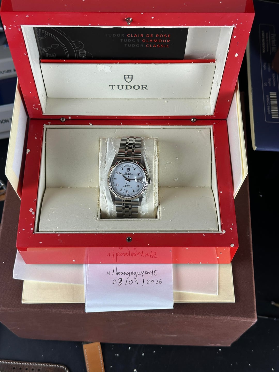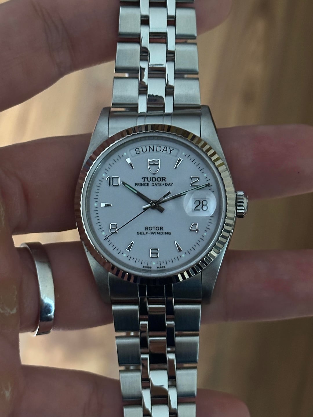 Up for sale is the Tudor Prince Date-Day 76214 18k White Gold Fluted Bezel Enamel Dial in excellent condition. Images: https://drive.google.com/drive/folders/1pjA9b_OTs1LUoNIY986H3jZRlNXH2mVF Video: https://drive.google.com/file/d/1ZSXXIpBlUK2t1GPB5KxFyxiD0jjFAdvz/view?usp=drivesdk Timestamp: https://drive.google.com/file/d/1yl-LPFKqCg8AtvBguxSiVuydVDGtkVnA/view?usp=drivesdk This reference sits at the crossroads of the classic Tudor design language and the more accessible, everyday interpretation of the Rolex Day-Date. If you’re after something that doesn’t take itself too seriously but still delivers heritage and versatility, this one is worth a look. The real standout here is the enamel dial. The white porcelain-like dial with silver numerals is a masterclass in understated elegance. The typography is refined, clear, and striking against the bright dial surface. It’s a dial that evokes vintage luxury, perfect for formal occasions or smart casual styling. Specs wise, you get a 36mm case, 43mm lug-to-lug, 10.2mm thick (11.3mm including the cyclops), and 100m water resistance with a screw-down crown. Inside is the tried-and-true ETA 2834-2 automatic movement, which is more reliable in the long run. This watch is in excellent condition, showing almost no scratches at all. Crystal is nice and clean. Watch comes fit on the OEM bracelet that fits up to 20cm (8 inches). The watch has been serviced recently so it keeps great time. It comes with original Tudor box and booklet. Price: $3000 + $60 flat shipping (via FedEx/UPS express — fully insured with duty imports/tariff covered). Payment via PayPal F&F or G&S (+4.6% fee paid by buyer). No trades please Feel free to message me with any questions or if you're interested. Have a great day! Check out my other watches on Instagram: @jasonswatchcorner