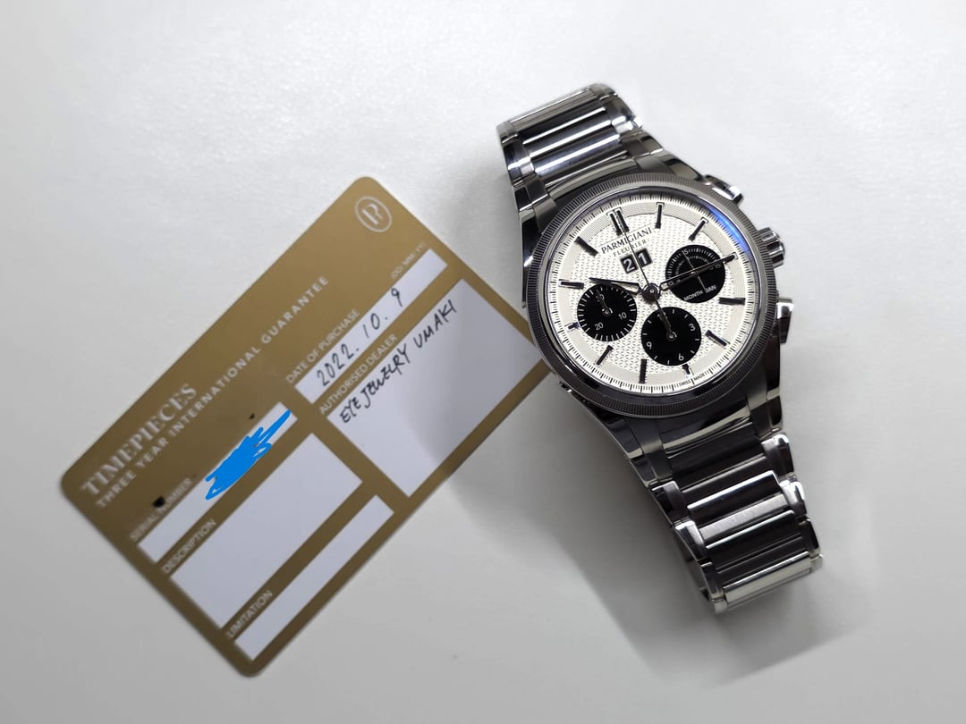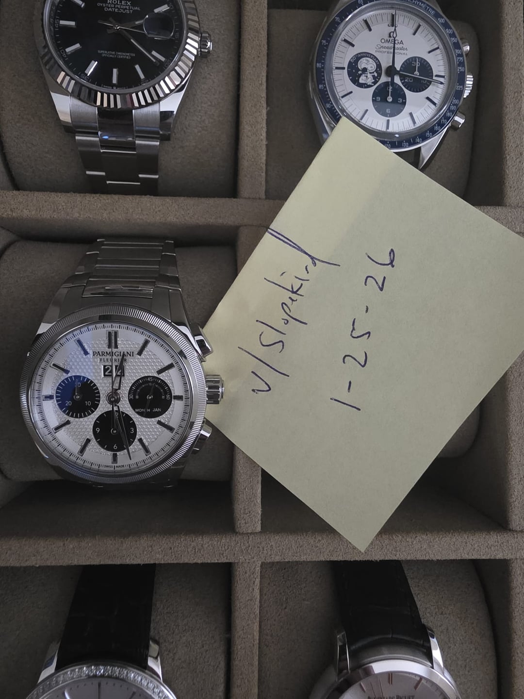 **Parmigiani Fleurier Tonda GT Chronograph – Panda Dial** **Reference:** PFC906-0000140-B00182 This Tonda GT Chronograph is in excellent overall condition with very limited signs of wear. The watch is running strong and checks out well on the timegrapher. Features the highly desirable panda dial, giving the watch a sporty yet refined presence that Parmigiani is known for. Includes the watch and warranty card only, with the card dated **10/9/2022**. The stainless steel bracelet comes with full links plus one extra and should comfortably fit up to an **8-inch wrist**. A fantastic opportunity to own a high-end integrated chronograph from Parmigiani Fleurier. Price = $13,799 shipped Pics & Timestamp - [https://imgur.com/a/qu0jDqN](https://imgur.com/a/qu0jDqN) IG = watchfornia Cheers, Adam