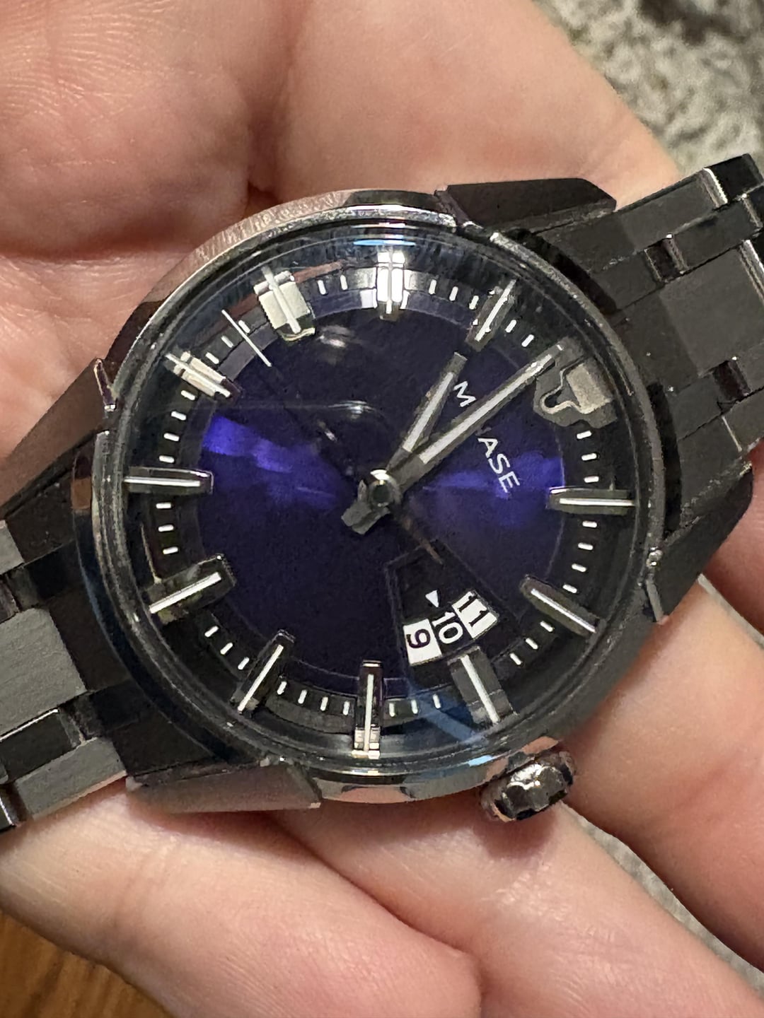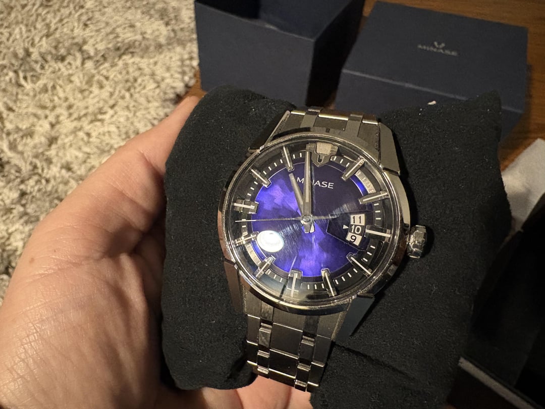 Trying once again—apologies for my poor photography skills. Hi folks — It’s a new year, and a new excuse for me to rampage through my collection a bit. Today I am offering up my Minase Divido 2.0, a watch I have happily worn for two years. This is the deep blue/purple variant. It comes with its original box and all its original links. This is a beautiful if unusual watch. The dial is really impressive (in any light), and the bracelet is both comfortable and mesmerizing. I really have no specific complaint about the watch other than I tend to outgrow my timepieces after owning them for a few years. (I wish that weren’t the case.) That said, the single thing for which I would consider trading is another Minase piece. I am asking $2300 — CONUS only. I’m happy to meet in person, too, if you’re in the Chicago area. Thanks.