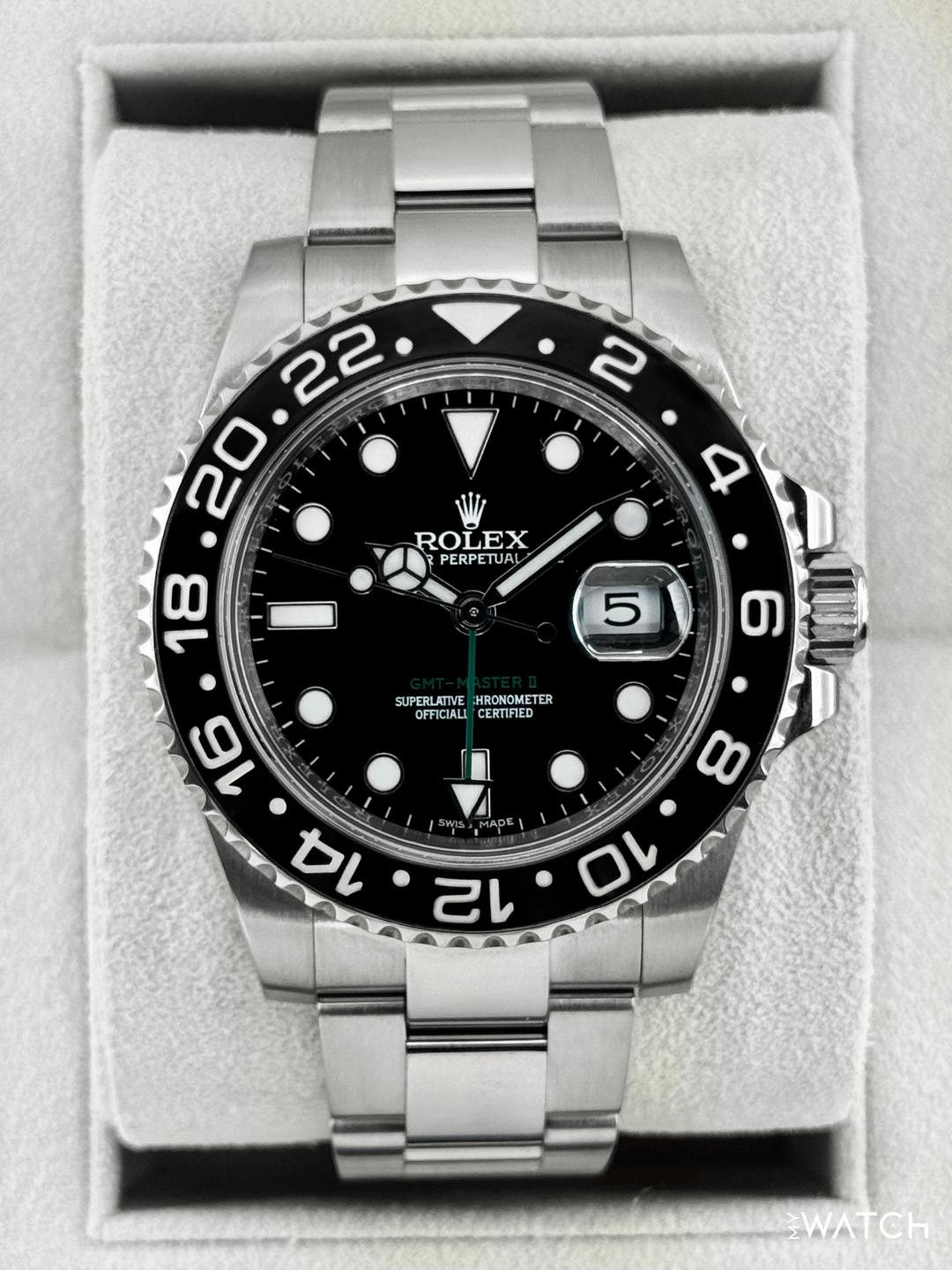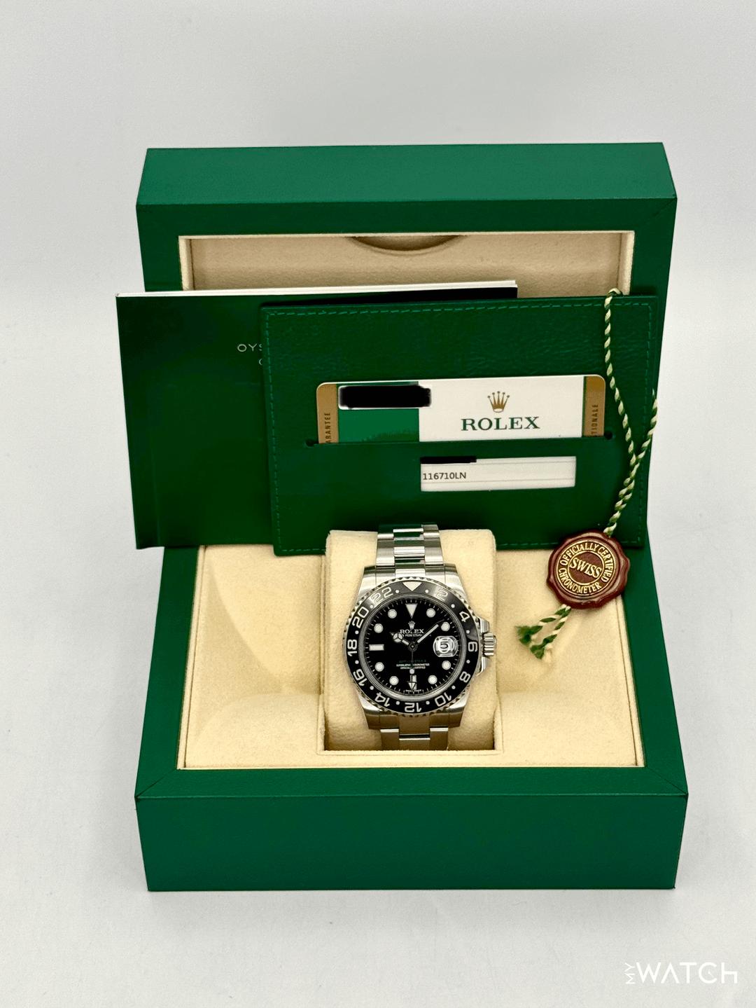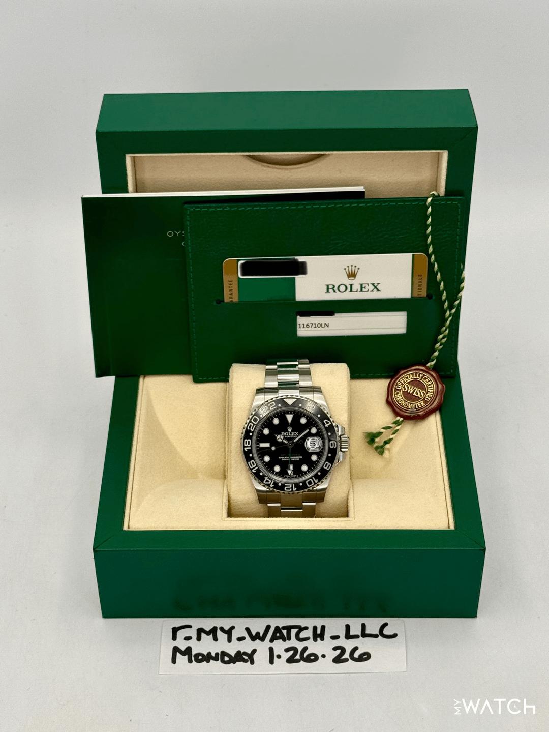 🔵**2014 Rolex GMT-Master II 40mm 116710LN Stainless Steel Oyster Bracelet Black Dial** 🔵**TRADE or SELL us your luxury watch, all brands considered. Message me details.** **Includes the following:** **✔️Original Rolex Box** **✔️Box and Papers - Yes** **✔️Warranty card dated 2014** **✔️Manual and Warranty booklets** **✔️Red Hang Tag included** **✔️Size: 8.0inch wrist (Full Links)** **✔️Watch is in excellent overall condition. Please see photos for details.** **✔️**[**Trades**](https://mywatchllc.com/pages/sell-rolex-watch) **welcome** Business Name: **My Watch LLC** LOCATION: Oak Park, Michigan ✔️[MyWatchLLC.com](http://mywatchllc.com/) for current inventory ✔️Google Business Listing [https://g.co/kgs/Cmd6FPW](https://g.co/kgs/Cmd6FPW) ✔️Business Hours M-F 9-6 ✔️Facetime/Video chat/calls welcome to view the watch interested. ✔️Contact: 248-422-0909 via text or call for quickest response. 🟢TERMS: Visit [MyWatchLLC.Com](http://mywatchllc.com/) for payments accepted 🟢REFERENCES/REVIEWS: We are well reviewed on all platforms from google, trust pilot, rolexforums, additionally we have 300+ reference in multiple FaceBook watch groups, reference checks welcome. 🟢SHIPPING: If you are not local, we offer Fully Insured FedEx overnight shipping in the USA for a fee. International shipping available. [https://mywatchllc.com/products/2014-rolex-gmt-master-ii-40mm-116710ln-stainless-steel-black-dial-6](https://mywatchllc.com/products/2014-rolex-gmt-master-ii-40mm-116710ln-stainless-steel-black-dial-6)