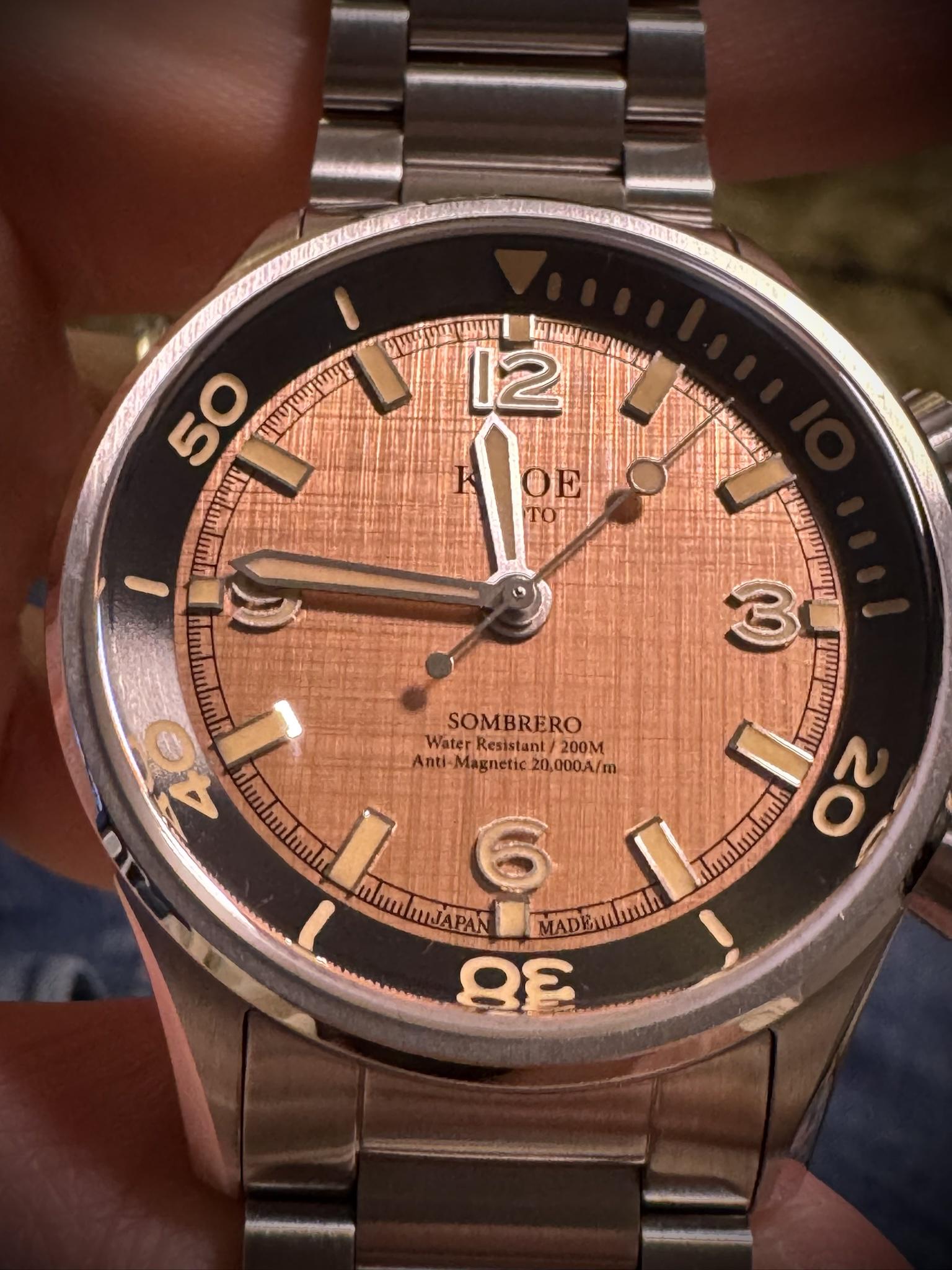 [Pics, video, timestamp](https://imgur.com/a/rllLDcy) \- see album for notes Kuoe Sombrero in the salmon dial with the flat link bracelet. Full set. Excellent condition, gently used. Full detail and specs available [here](https://www.kuoe-en.com/product-page/sombrero-90-011-salmon-pink-linen-dial-20-bar-water-resistant) $750 shipped US through PayPal G&S