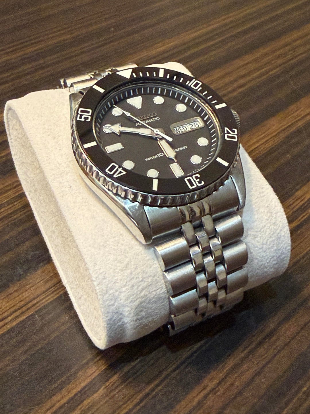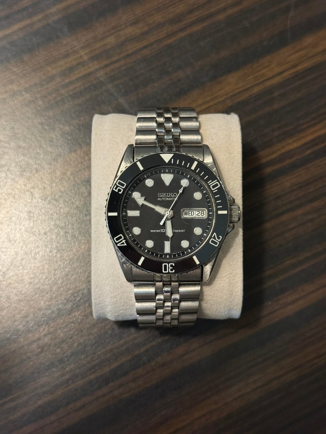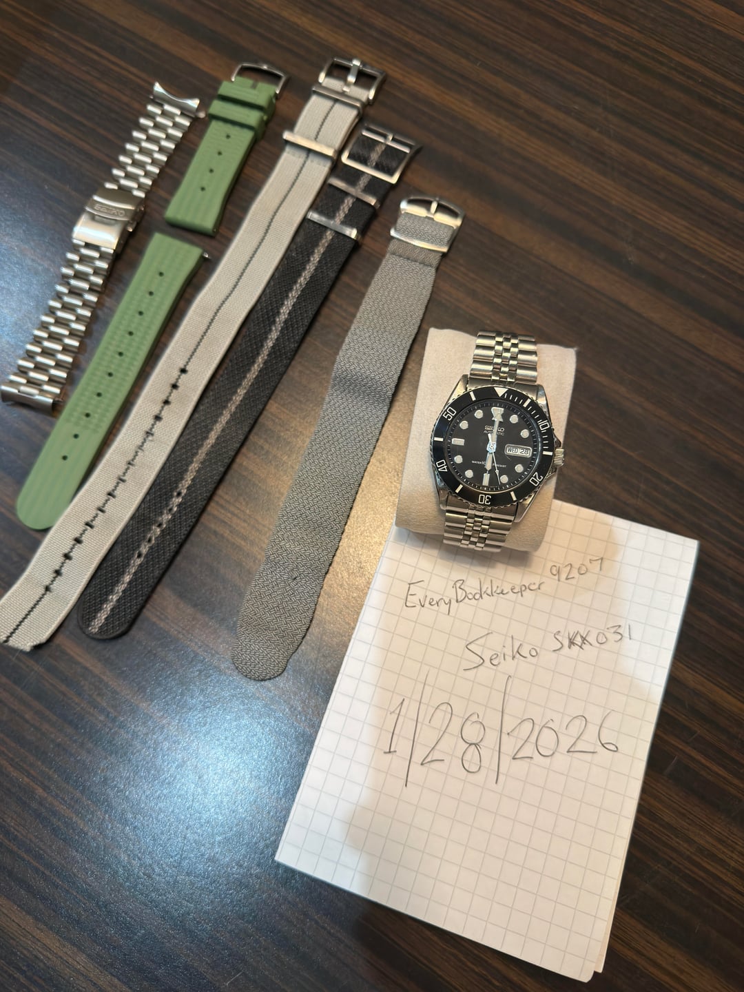 Seiko SKX031 – Ref. 7S26-0040 Price: $350 CONUS only. Shipping via USPS Priority (or similar) with tracking and insurance. Shipping included. No international shipping. Classic midsize SKX that wears incredibly well. Purchased by me on Chrono24 in February 2021 and rarely worn since. 39mm case, 22mm lug width, ~12mm thickness, 100m water resistance (screw-down crown), Seiko 7S26 automatic movement (43hr power reserve) - Upgraded ceramic bezel insert - Bezel currently rotates bi-directionally and without clicks due to a missing or worn bezel click ball and spring - Water resistance is not guaranteed and the watch may benefit from a service and fresh gaskets - Small scratch on the Hardlex crystal - Overall very attractive, honest condition Included: - Jubilee bracelet - President-style bracelet - Green rubber strap - Multiple high-quality NATO straps Great foundation for a mod project or an easy wear as-is. Happy to provide more photos or answer questions.