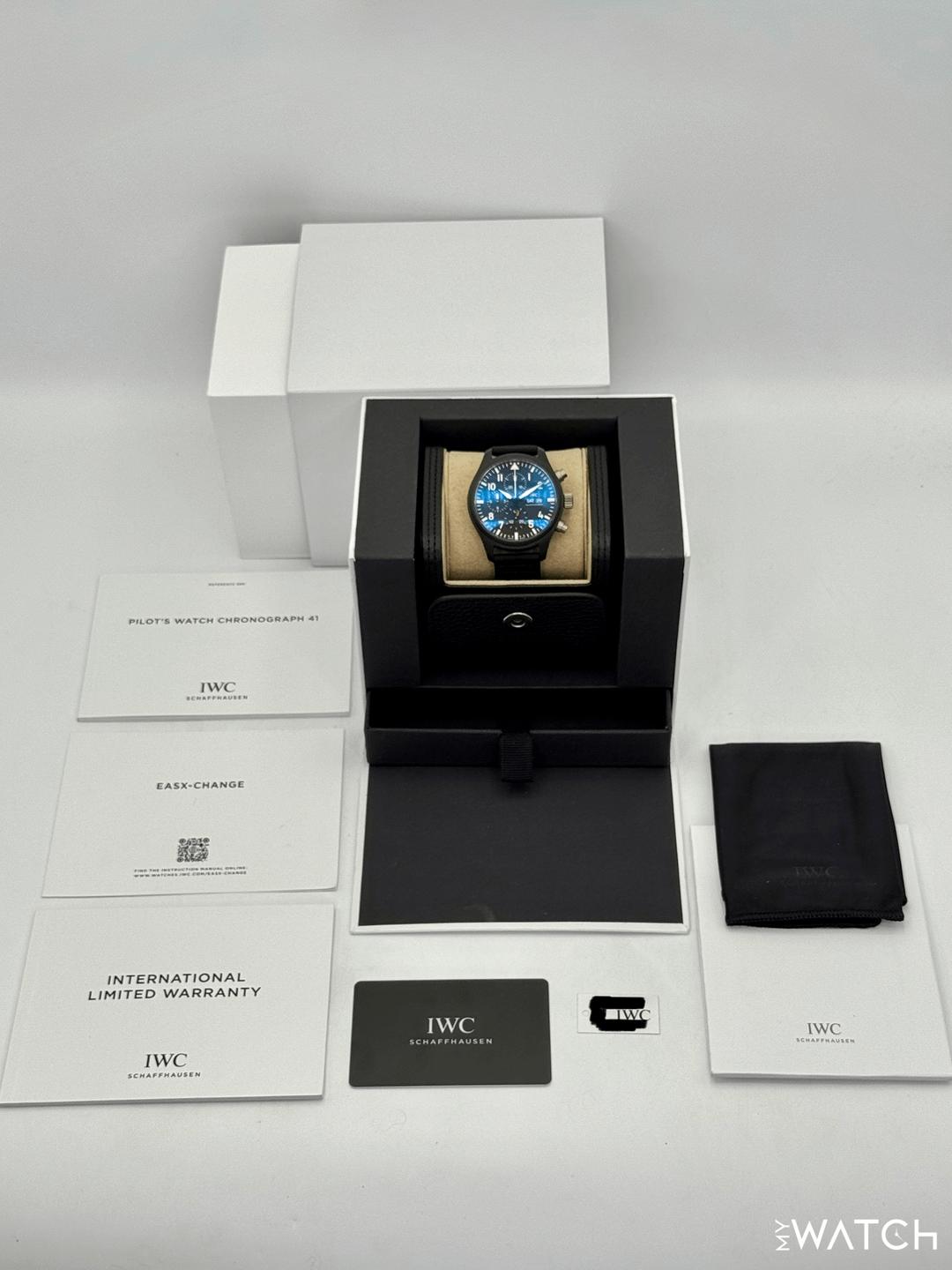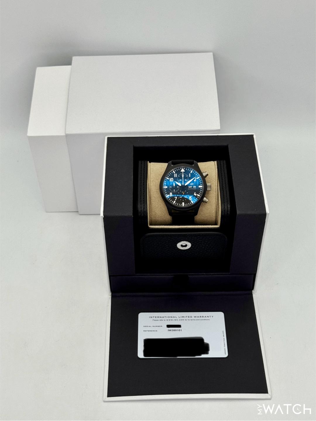 🔵**2024 IWC Pilot’s Watch Chronograph "Top Gun" 44.5mm IW389101 Black Ceramic Black Dial** 🔵**TRADE or SELL us your luxury watch, all brands considered. Message me details.** **Includes the following:** **✔️Original IWC Double boxed** **✔️Box and Papers - Yes** **✔️Warranty card dated December 2024** **✔️Manual and Warranty booklets** **✔️White Hang Tag included** **✔️Cleaning Cloth** **✔️Size: Adjustable Black Textile Strap** **✔️Watch is in excellent overall condition. Please see photos for details.** **✔️**[**Trades**](https://mywatchllc.com/pages/sell-rolex-watch) **welcome** Business Name: **My Watch LLC** LOCATION: Oak Park, Michigan ✔️[MyWatchLLC.com](http://mywatchllc.com/) for current inventory ✔️Google Business Listing [https://g.co/kgs/Cmd6FPW](https://g.co/kgs/Cmd6FPW) ✔️Business Hours M-F 9-6 ✔️Facetime/Video chat/calls welcome to view the watch interested. ✔️Contact: 248-422-0909 via text or call for quickest response. 🟢TERMS: Visit [MyWatchLLC.Com](http://mywatchllc.com/) for payments accepted 🟢REFERENCES/REVIEWS: We are well reviewed on all platforms from google, trust pilot, rolexforums, additionally we have 300+ reference in multiple FaceBook watch groups, reference checks welcome. 🟢SHIPPING: If you are not local, we offer Fully Insured FedEx overnight shipping in the USA for a fee. International shipping available. [https://mywatchllc.com/products/2024-iwc-pilot-s-watch-chronograph-top-gun-44-5mm-iw389101-ceramic-black-dial](https://mywatchllc.com/products/2024-iwc-pilot-s-watch-chronograph-top-gun-44-5mm-iw389101-ceramic-black-dial)