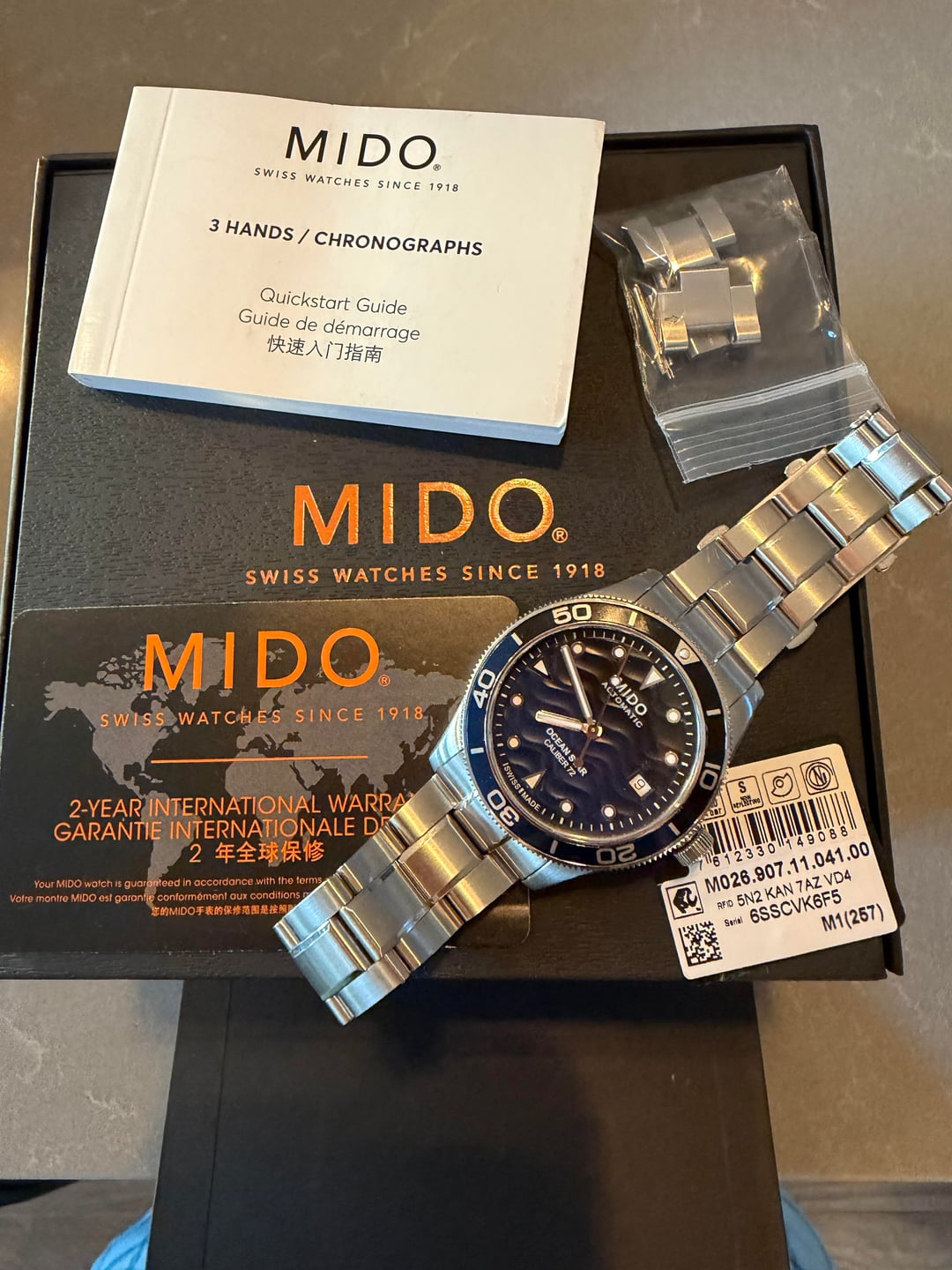 Hi Watchex, Listing a very clean conditon Mido Oceanstar this morning. I had the opportunity to own it for a while and enjoyed wearing it due to its size. The case feels very much like longines spirit zulu 39 and fit is very similar if you have owned that watch in the past. MSRP: $1250 My Price: $750 shipped ground Condition: used condition with a few light blemishes on the clasp and micro hard to see ones on the bracelet. Overall great condition. Runs great Includes: all links, hangtag, warranty card (not dated), Booklet, double box 📍 Plano, TX Payment: Paypal, vemo, zelle, ff Please feel free to reach out any questions at all about The watch prior to purchasing as I’m selling all the watches as is in the pictures have been taken right before I list The watch on Reddit