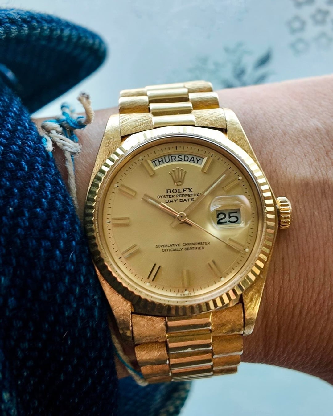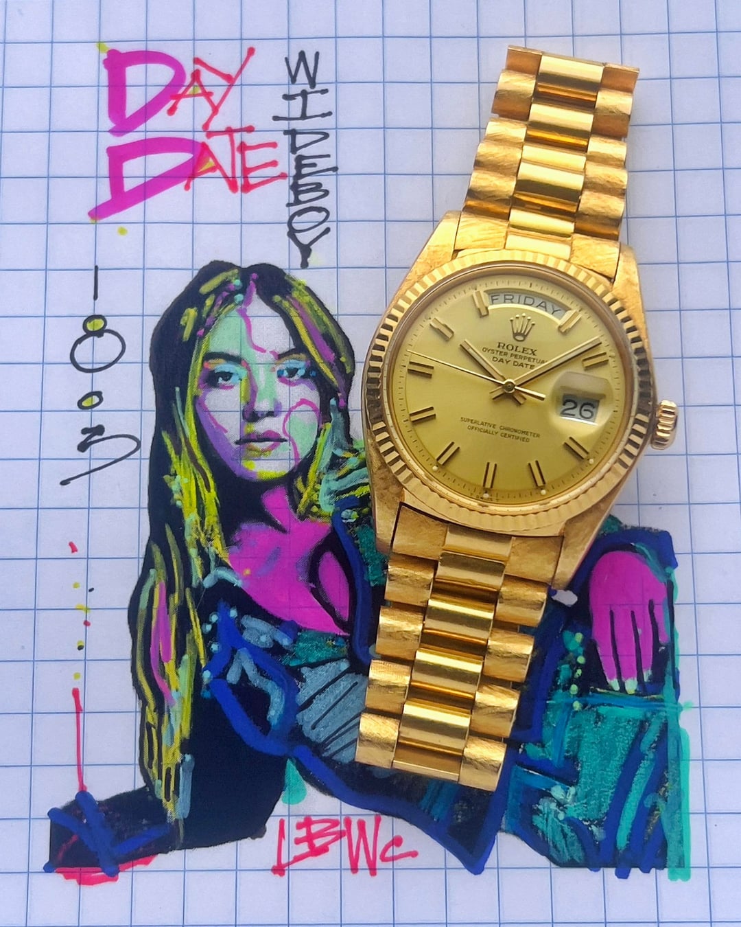 https://www.instagram.com/longbeachwatchclub/ Rolex Day Date ref. 1803 President 18k gold circa 1976 Day Date President was always the type of watch that appeared in the imagination when the word “Rolex” was ever mentioned: solid gold treasure. Well, here it is with a crisp gold “Wide Boy” pie-pan dial paired with solid gold hidden clasp presidential 18k bracelet. The Wide Boy refers to the featuring distinctly wider, block-like hour markers and handscompared to the standard, slimmer stick hand versions of the era. This design was intended to enhance legibility now highly sought after by collectors today. Since it is 2026, we must address the precious metal market. The total weight of the watch is 126 grams—the bracelet alone is 70 grams. Scale pix in album Overall, this is in very good condition with no notable damage or signs of over polish—there are darker patina spots with can be cleaned with a polish cloth but be opted to leave alone. While no service history, the automatic movement is healthy and looking strong on timegrapher—your experience may vary. _________________________________________________ Timestamps pix Videos and timegrapher: https://drive.google.com/drive/folders/1-I6gD6H8v0ueErAoO3FucMA4jI7HjgCF?usp=sharing Specifications: 36mm case X 20mm lug width X 44.4h (lug to lug) X 12cc with acrylic crystal Box and papers: period correct inner and outer presidential box; no papers Bracelet: solid18k gold weighting 70 grams and total length with head is 7.7in ______________________ ______________________ * video is the best way to view the watch if in-person test drive is not available. Due to the different characteristic of the cameras and gadgets used, the color of the watch you purchase may not be the same as shown on this website or on our Instagram. * will consider trades that make sense but please consider time, shipping, and trade value—not market. * local special: can possibly accommodate at ButterScotch in Downtown Long Beach by appointment * All sales final unless the watch is misrepresented or lost in transit (always fully insured) * Link to [feedback here](https://www.reddit.com/r/WatchExchangeFeedback/search?q=soycowboy&restrict_sr=1&sort=new) & [watchcharts here](https://watchcharts.com/repcheck/user/soycowboy?source=reddit&type=feedback) * Asking a *negotiable* **$20k** via Zelle, venmo, or possibly PayPal Friends & Family with super strong references or if I know you. Price includes fully insured Fedex shipping in the USA— hand delivery in most of the Los Angeles or Orange County areas with drinks or coffee on me ;). Cheers, Stephen
