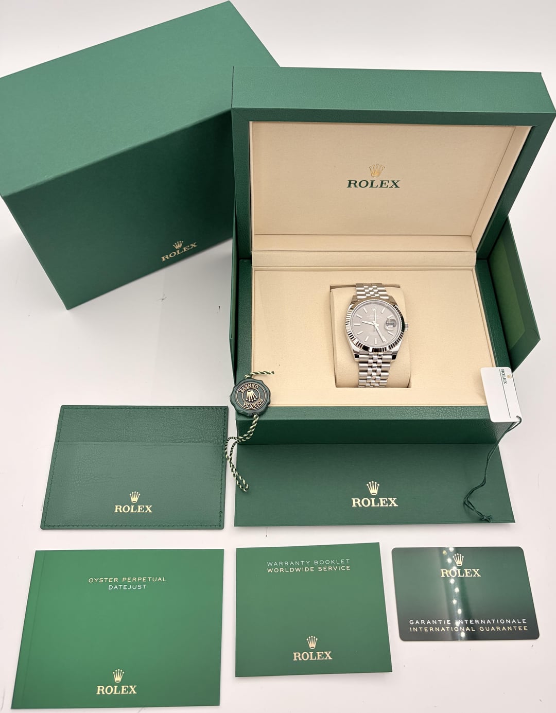 **\[WTS\]** Rolex Datejust 41mm Slate Dial 126334 Stainless Steel BOXES/PAPERS! **Location**: U.S.A. / South Carolina **Condition**:This beautiful timepiece comes complete with the outer green box, inner green wave box, all manuals, both hangtags, all links, and original warranty card (Dated in October 2025). The watch was worn a handful of times and is overall excellent condition. Pay close attention to the pictures as they accurately describe the condition. Mechanically the watch is functioning as it should. Serial numbers and names are blurred in photos only for privacy reasons. We are happy to answer all questions about the watch. Just reach out to us via messages. We are happy to answer all questions about the watch. Just reach out to us via messages. **Price: $15,000** **Payment Method: Bank Wire Transfer** **Shipping:** I ship fully insured Fedex overnight after clearing of the wire transfer. International buyers please reach out and we can discuss options. **Details** * Reference Number: 126334 * • Bezel: Fixed Fluted 18K White Gold * • Band: Stainless Steel * • Case: Stainless Steel * • Case Diameter: 41mm * • Movement: Automatic * • Crystal: Sapphire * • Dial Color: Slate * • Functions: Hours, Minutes, Second, Date * • Year: 2025 Pictures:[https://imgur.com/a/nb18InW](https://imgur.com/a/nb18InW) Timestamp:[https://imgur.com/a/1ETSkYS](https://imgur.com/a/1ETSkYS)
