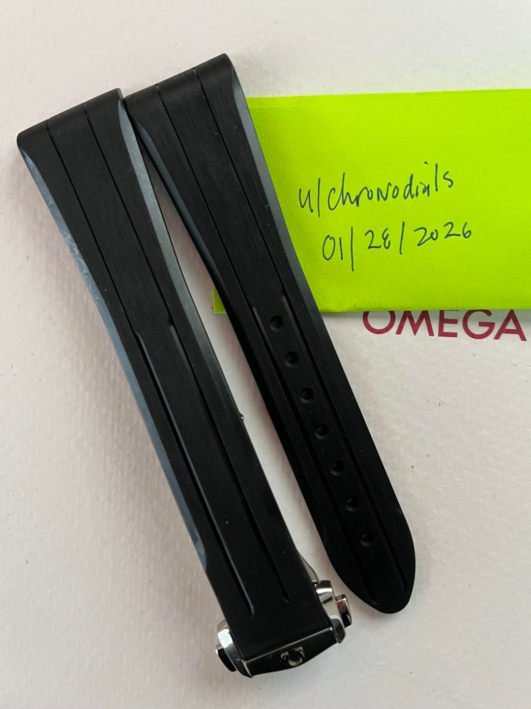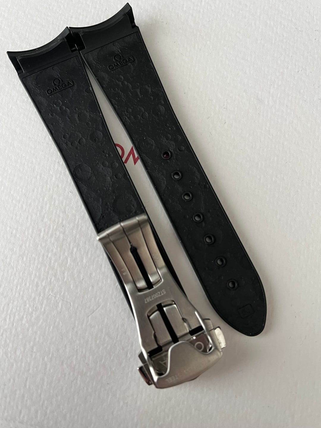 20mm Omega OEM **Integrated Speedmaster Rubber Strap** Ref: 032Z017245 (Black Rubber, curved ends, 20mm/16mm) Clasp Ref: STZ007387 (Omega OEM Stainless Steel Deployant / 16mm) Fitment: Speedmaster Professional (20mm lug) - **Sold Out** Model [https://www.omegawatches.com/en-us/omega-two-piece-strap-speedmaster-moonwatch-professional-black-rubber-strap-032z017245w](https://www.omegawatches.com/en-us/omega-two-piece-strap-speedmaster-moonwatch-professional-black-rubber-strap-032z017245w) **$575 Shipped** \- Firm Price Pics & timestamp in listing. Zelle or Venmo FF