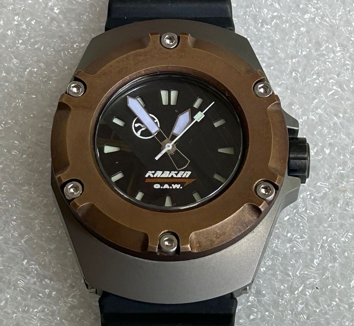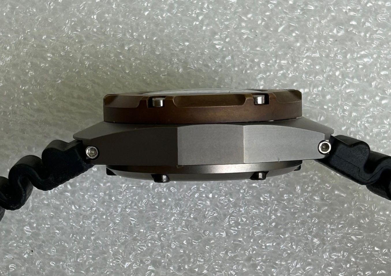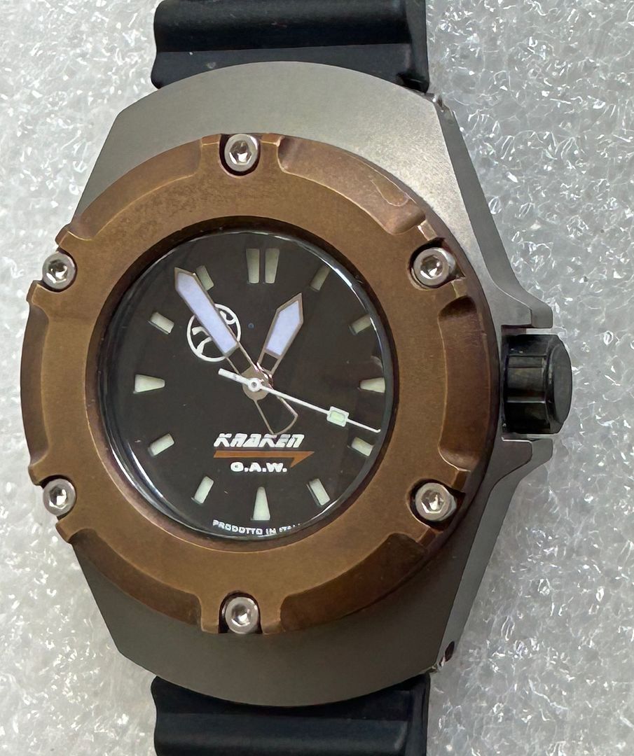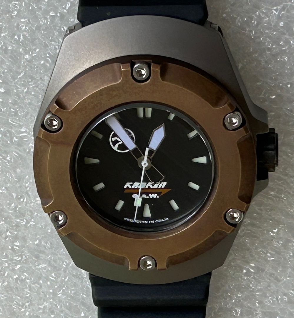 Up for sale is a Gruppo Ardito Kraken watch, made with grade 5 titanium with a solid bronze alloy bezel. There were a total of 10 made with some various options available. The lug width is 24mm, and the articulated rubber strap is equipped with a roller buckle. Has the OceanicTime diver icon between the 10 and 11 o’clock on the dial. This watch is made in Italy and comes as a complete set. The water resistance is 5000m and is a very tough and durable diving watch.