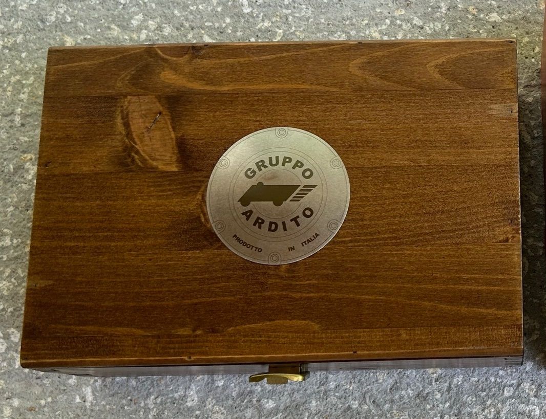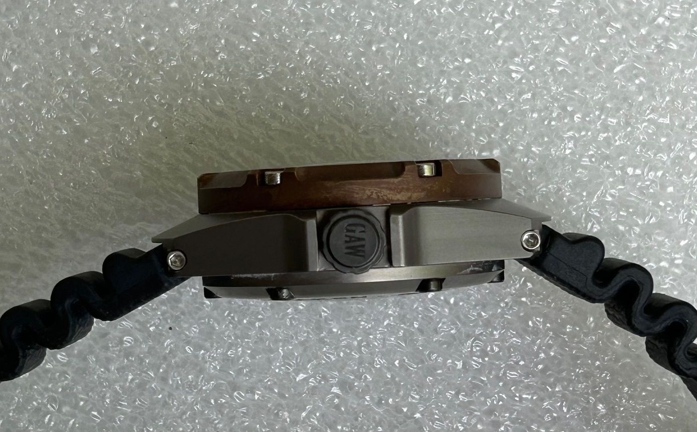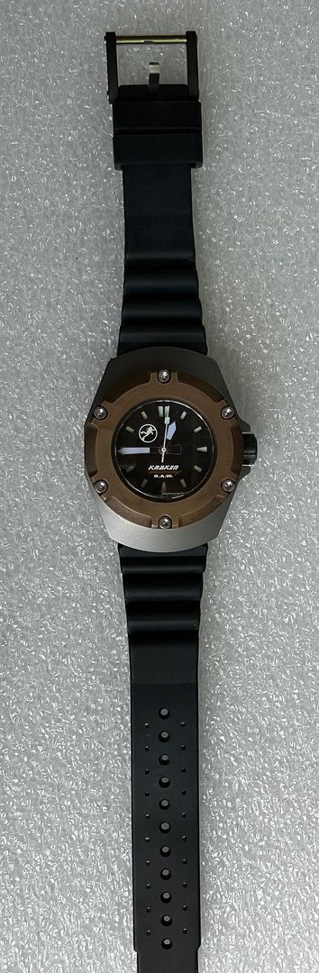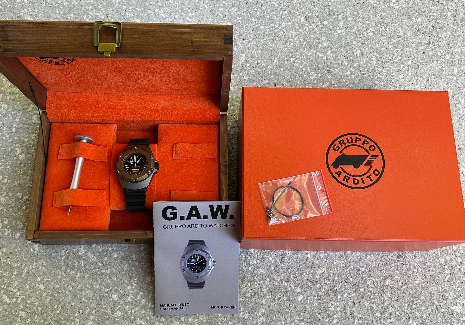 Up for sale is a Gruppo Ardito Kraken watch, made with grade 5 titanium with a solid bronze alloy bezel. There were a total of 10 made with some various options available. The lug width is 24mm, and the articulated rubber strap is equipped with a roller buckle. Has the OceanicTime diver icon between the 10 and 11 o’clock on the dial. This watch is made in Italy and comes as a complete set. The water resistance is 5000m and is a very tough and durable diving watch.