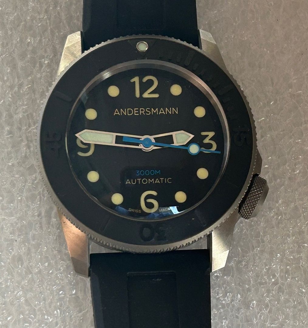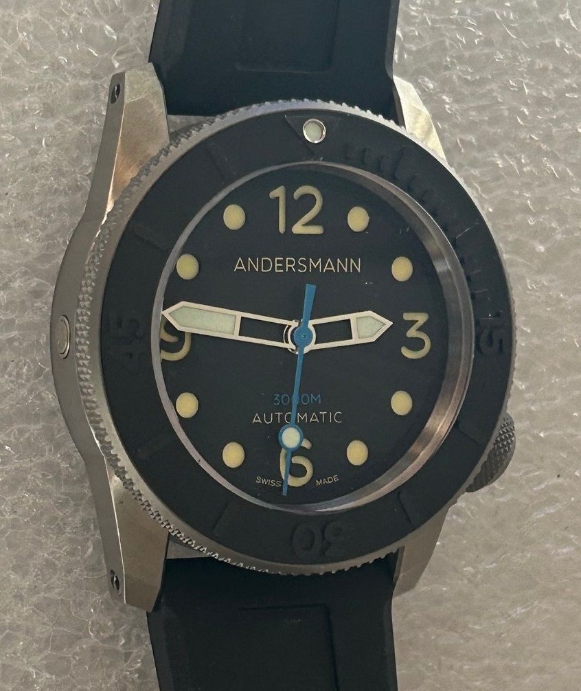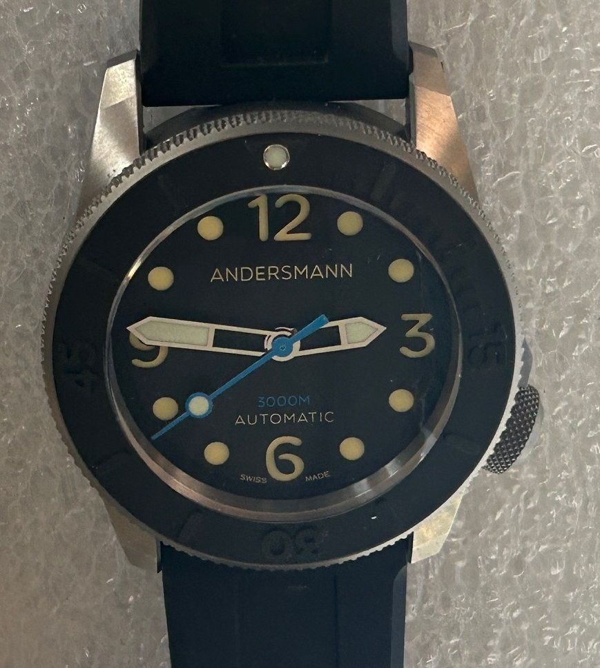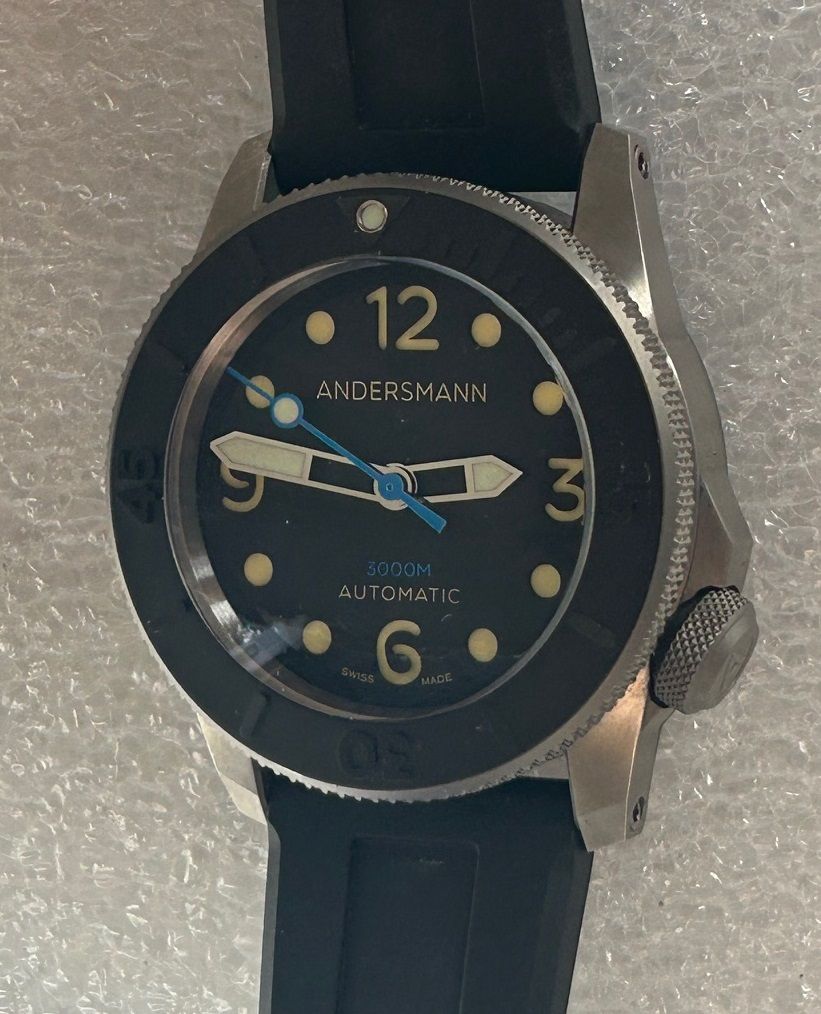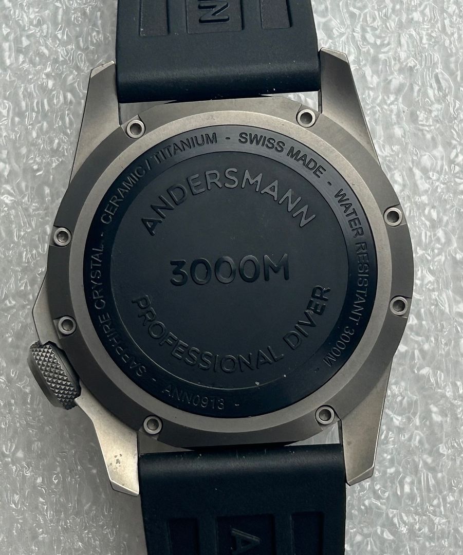Up for sale is an Andersmann Deep Ocean 3000m dive watch, 100 piece limited edition. The watch is mint and comes with the pelican case, tools and card. The case is made of grade 5 titanium, the bezel 120 clicks and is made of titanium with a ceramic inlay. There is a helium escape valve for deeper diving. This model is sold out.