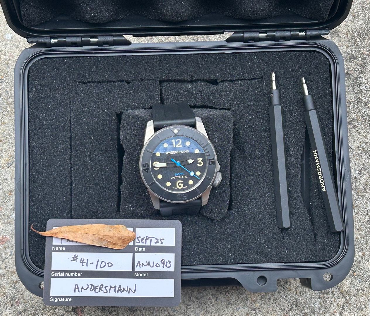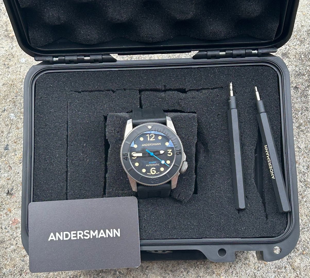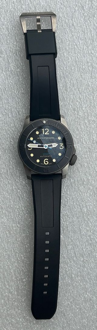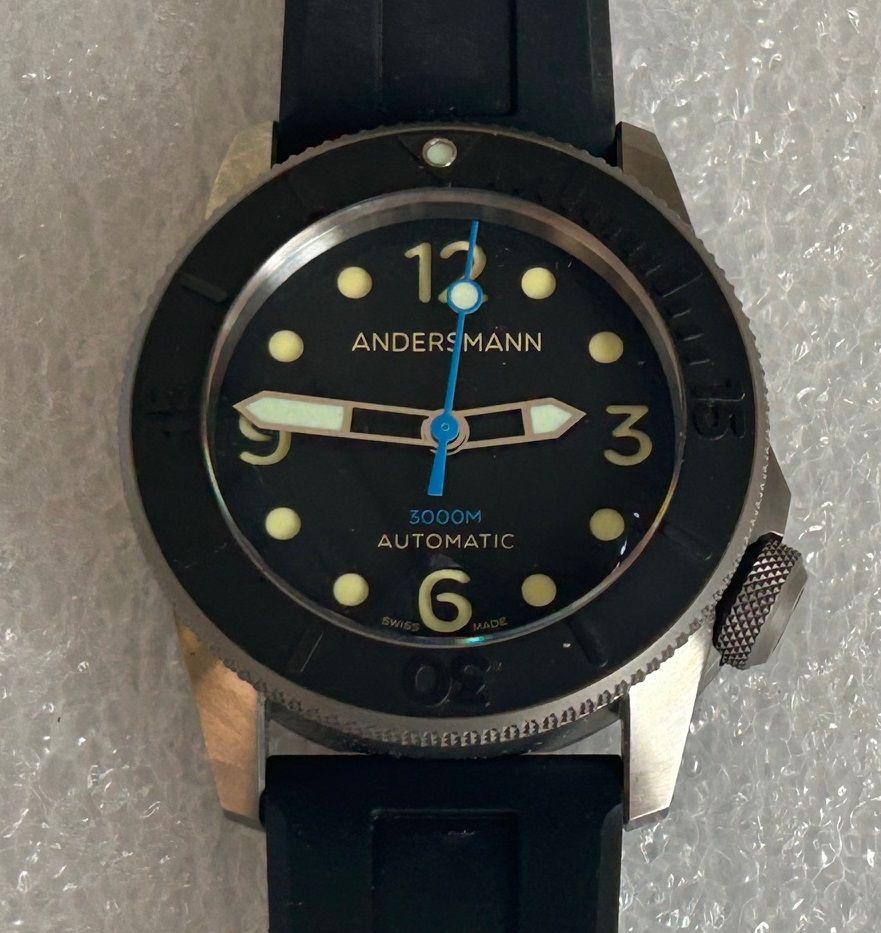 Up for sale is an Andersmann Deep Ocean 3000m dive watch, 100 piece limited edition. The watch is mint and comes with the pelican case, tools and card. The case is made of grade 5 titanium, the bezel 120 clicks and is made of titanium with a ceramic inlay. There is a helium escape valve for deeper diving. This model is sold out.