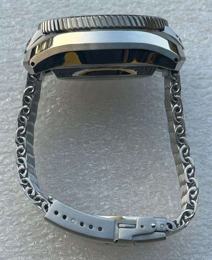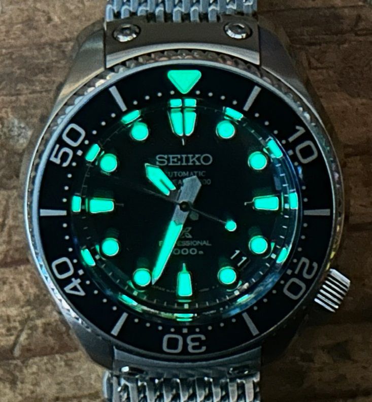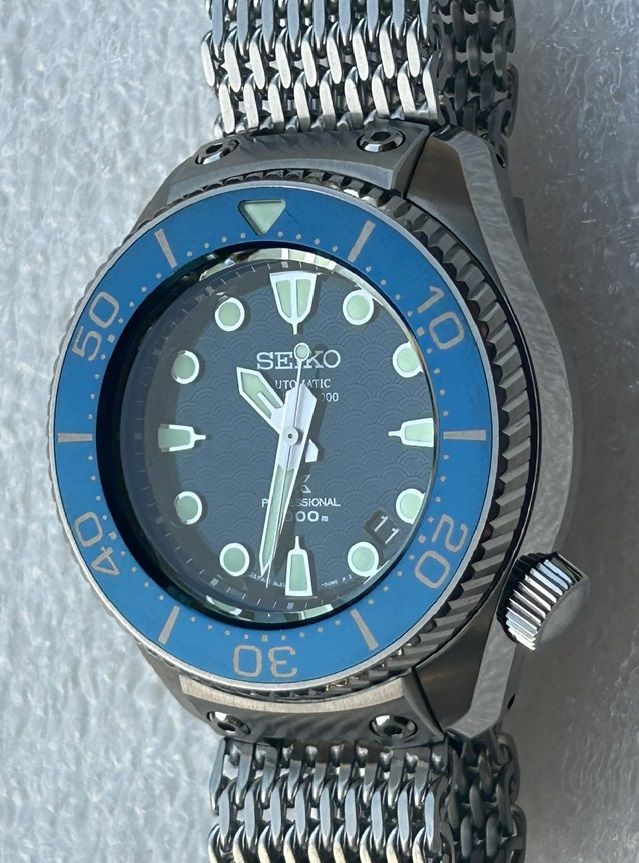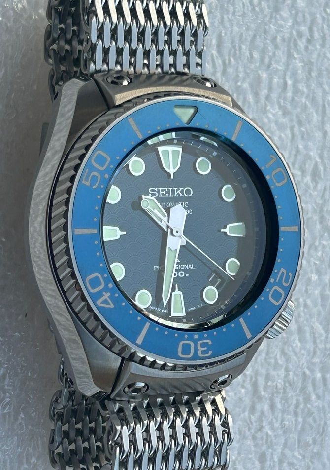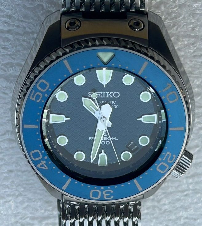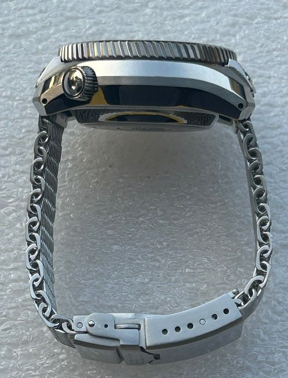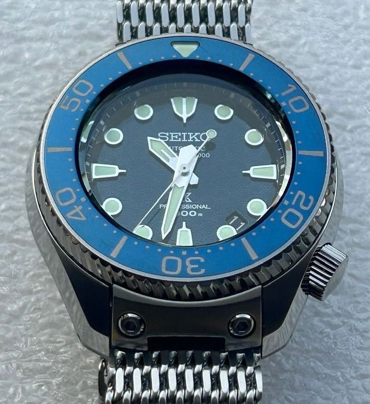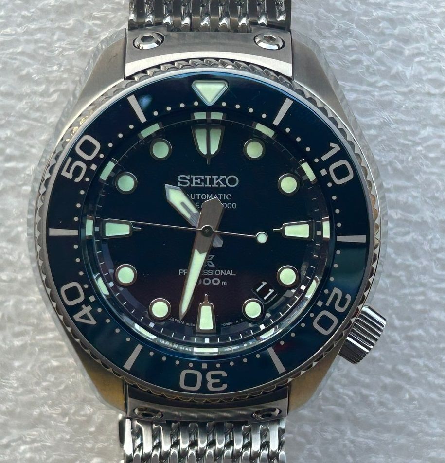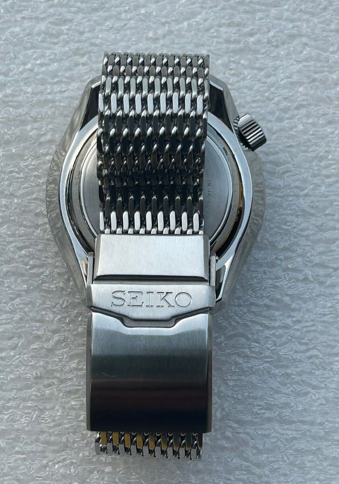 This watch is absolute beast of a tool watch and a professional grade dive watch with features which make it easy to use and compliment it. The dial is blue in color and has an ocean inspired pattern. These watches are really hard to find as this might be the very few for sale at the moment. Comes on Seiko shark mesh bracelet, included are a new Seiko bracelet and a Seiko rubber strap.