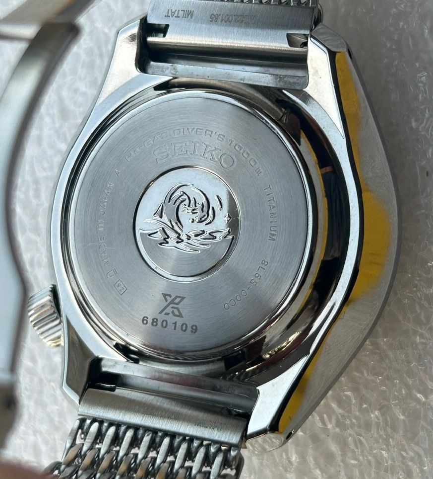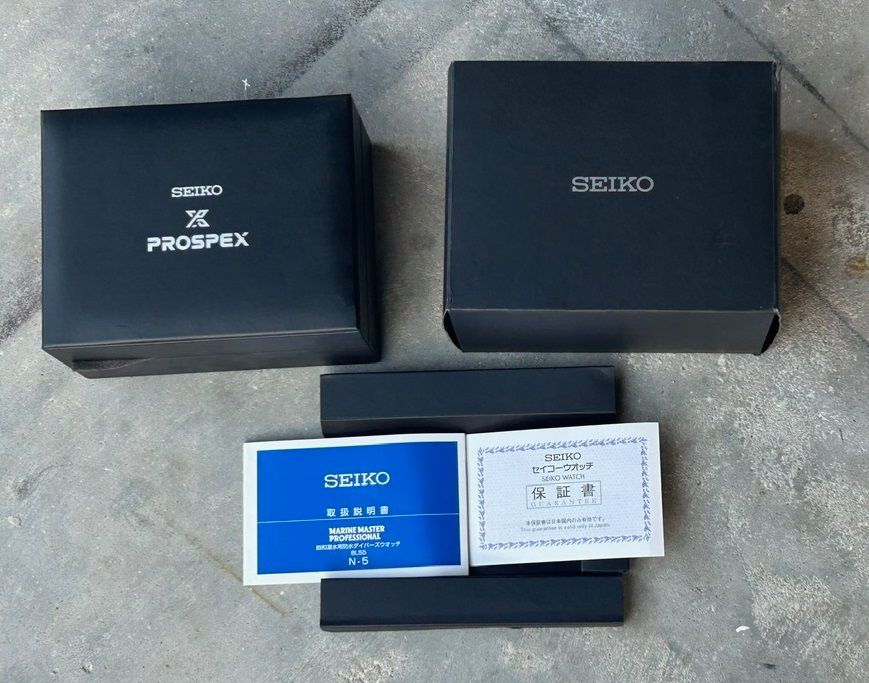 Up for sale is a Seiko Prospex Hi Beat Marinemaster Pro on a titanium bracelet. The set is complete including the boxes, manual, hang tag and warranty card. Comes with the rubber strap and the shark mesh bracelet. The watch is in excellent condition, only worn by original owner only a few times.