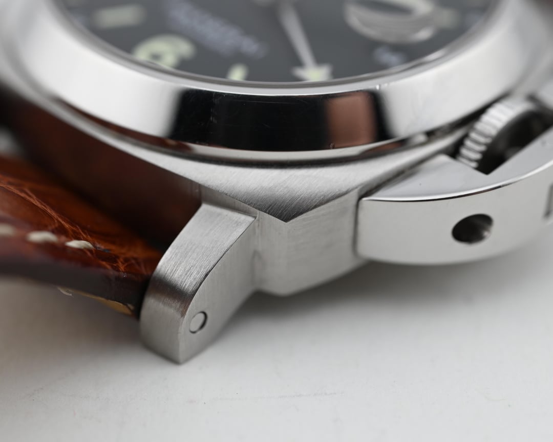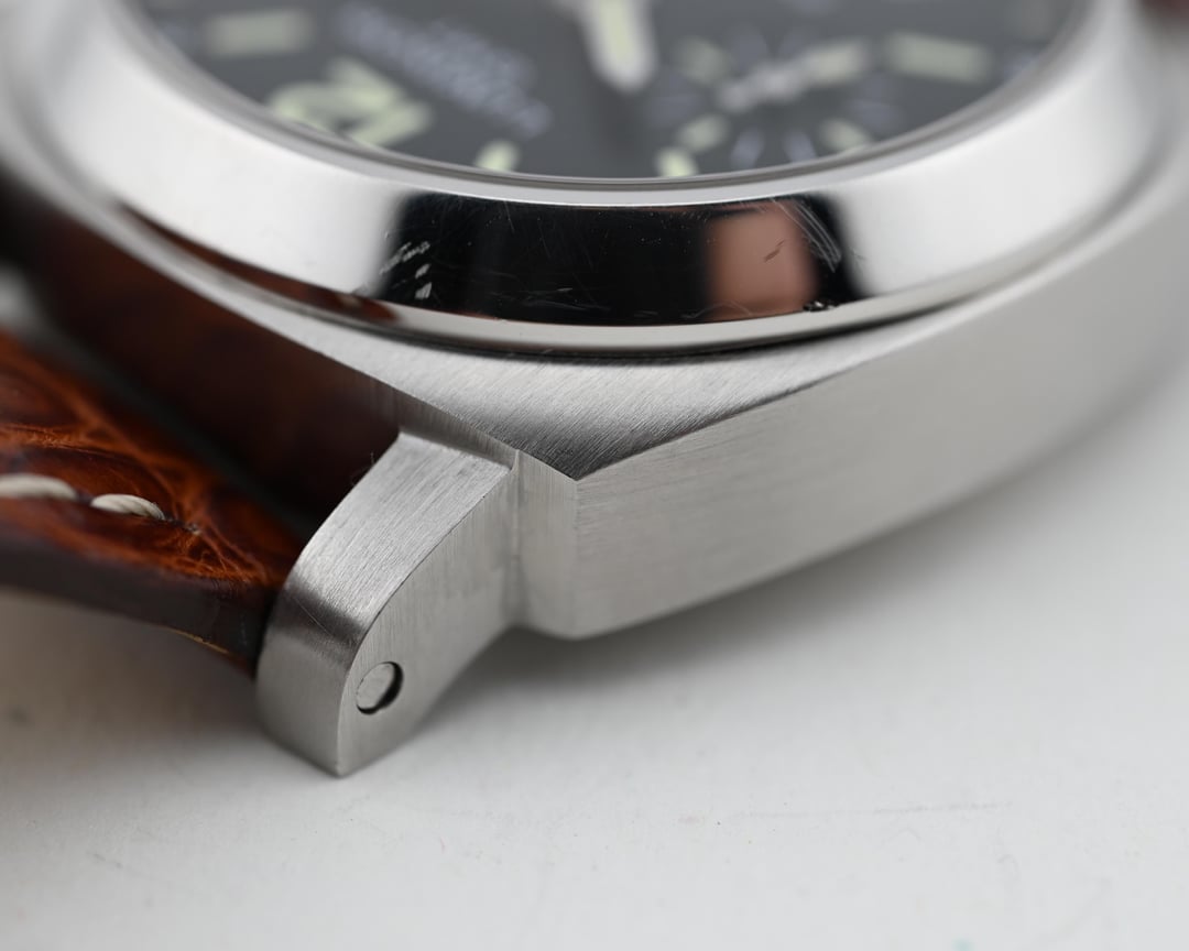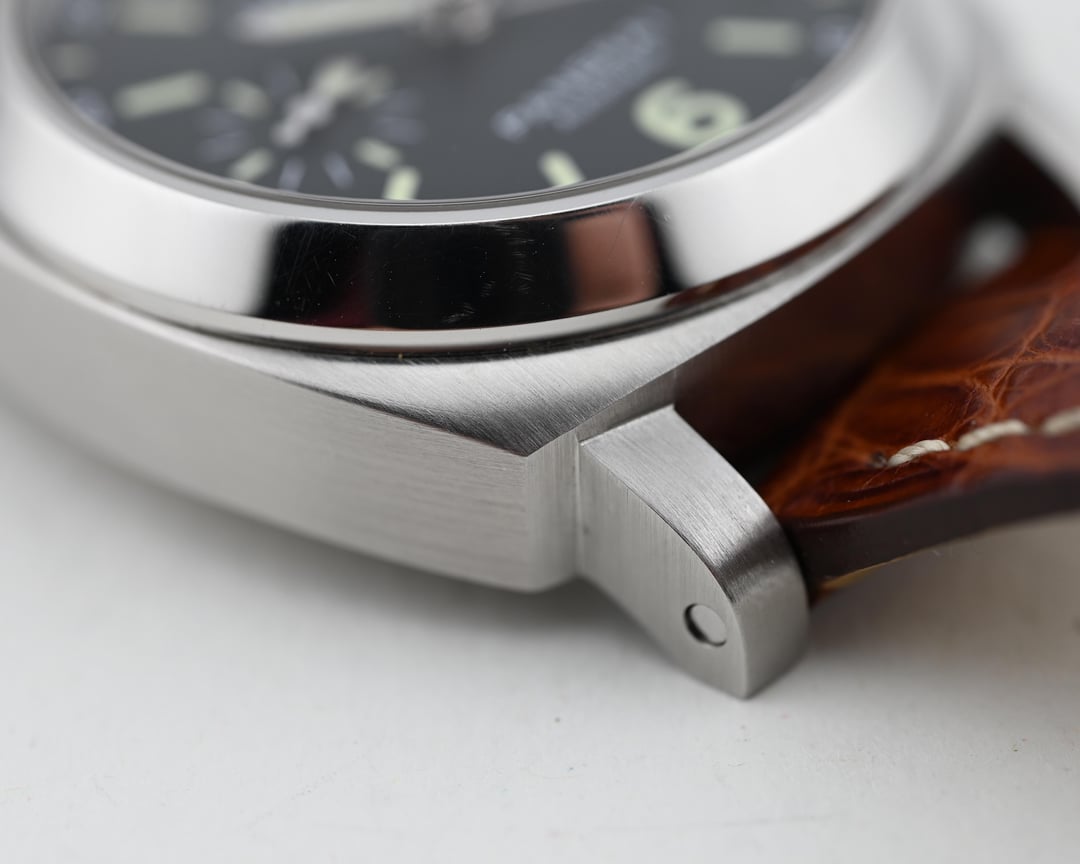 Dial: The matte black dial is very saturated, providing a lovely backdrop to the serious nature of Panerai’s distinct styling. The internally magnified date window is a nice touch, and I’ve always had a soft spot for the purpose driven running seconds at 9.The dial is free from defects with a lovely tritium yellow color to the lume.