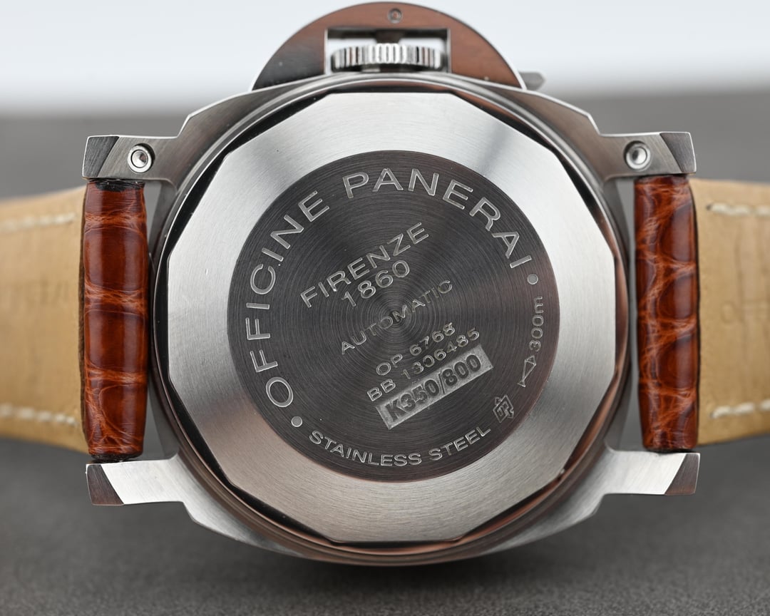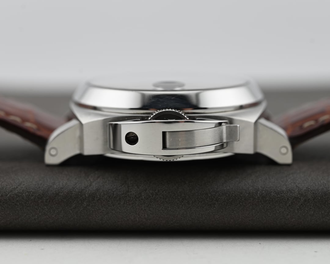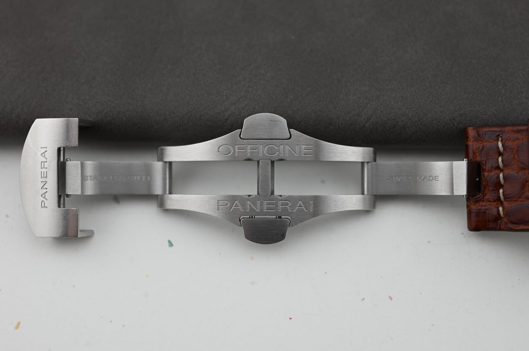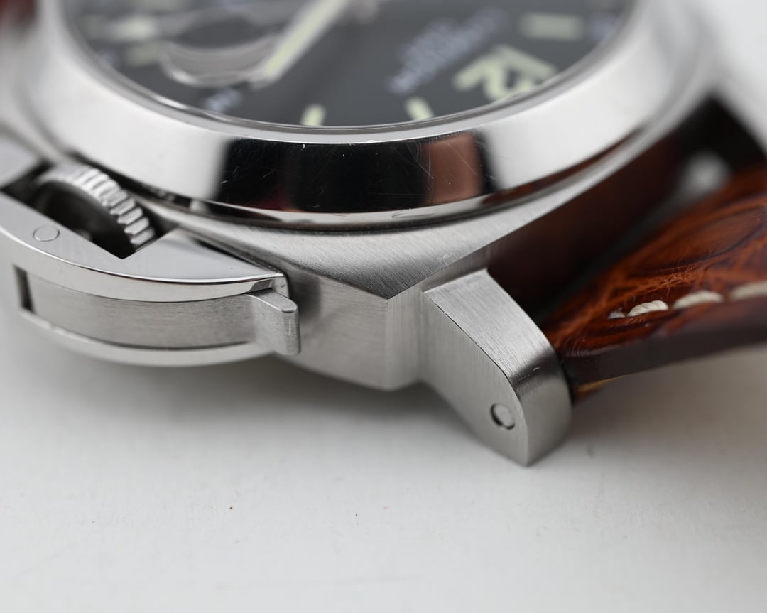 Dial: The matte black dial is very saturated, providing a lovely backdrop to the serious nature of Panerai’s distinct styling. The internally magnified date window is a nice touch, and I’ve always had a soft spot for the purpose driven running seconds at 9.The dial is free from defects with a lovely tritium yellow color to the lume.