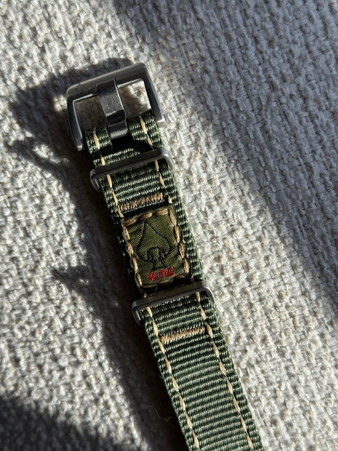 For sale is a W.O.E. × Z.A. Strap Company Single Pass Strap 1.0, 20mm. • Brand: Watches of Espionage × Z.A. Strap Company • Model: Single Pass W.O.E.–Z.A Strap 1.0 • Lug width: 20mm • Construction: Single-pass nylon • Hardware: Brushed steel • Condition: Excellent / lightly worn • Status: Sold out / limited release • Original retail: $110