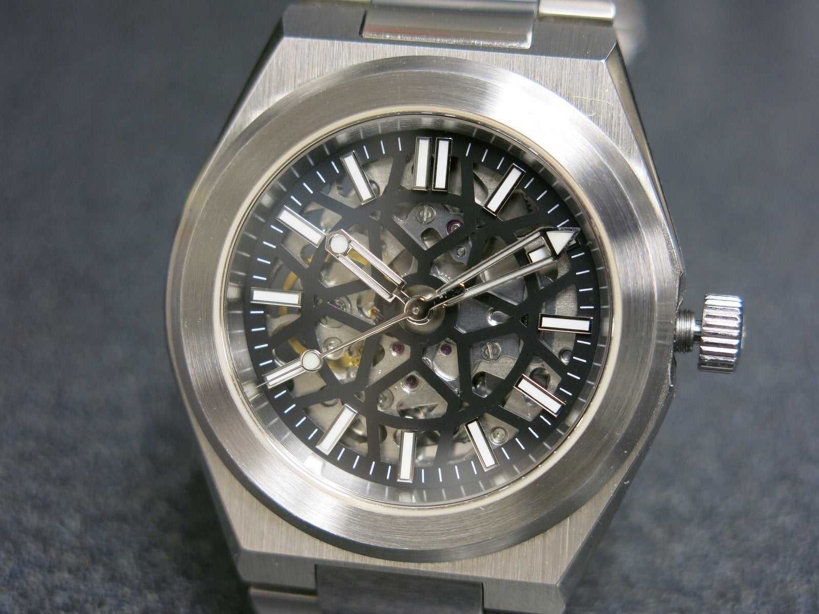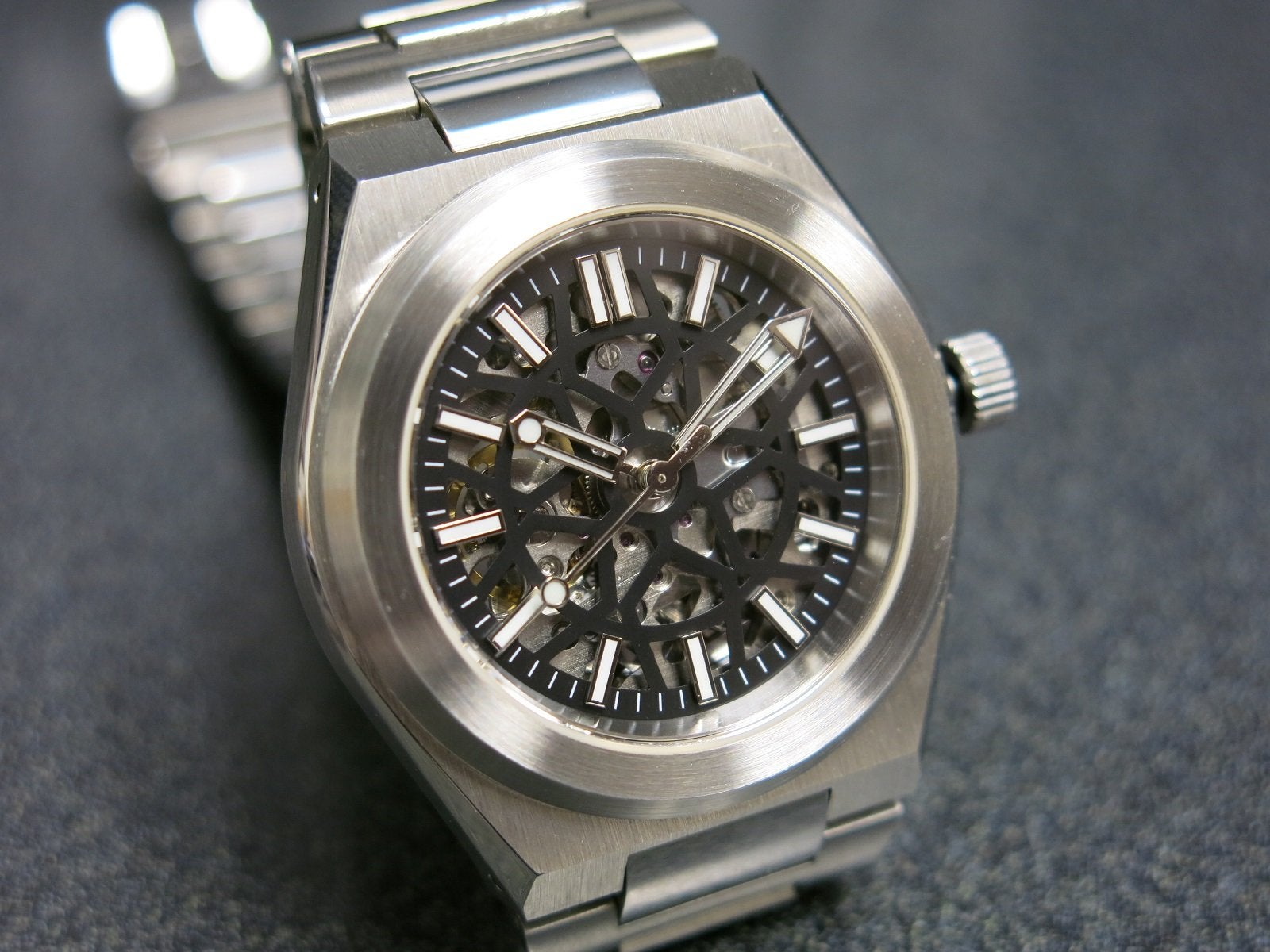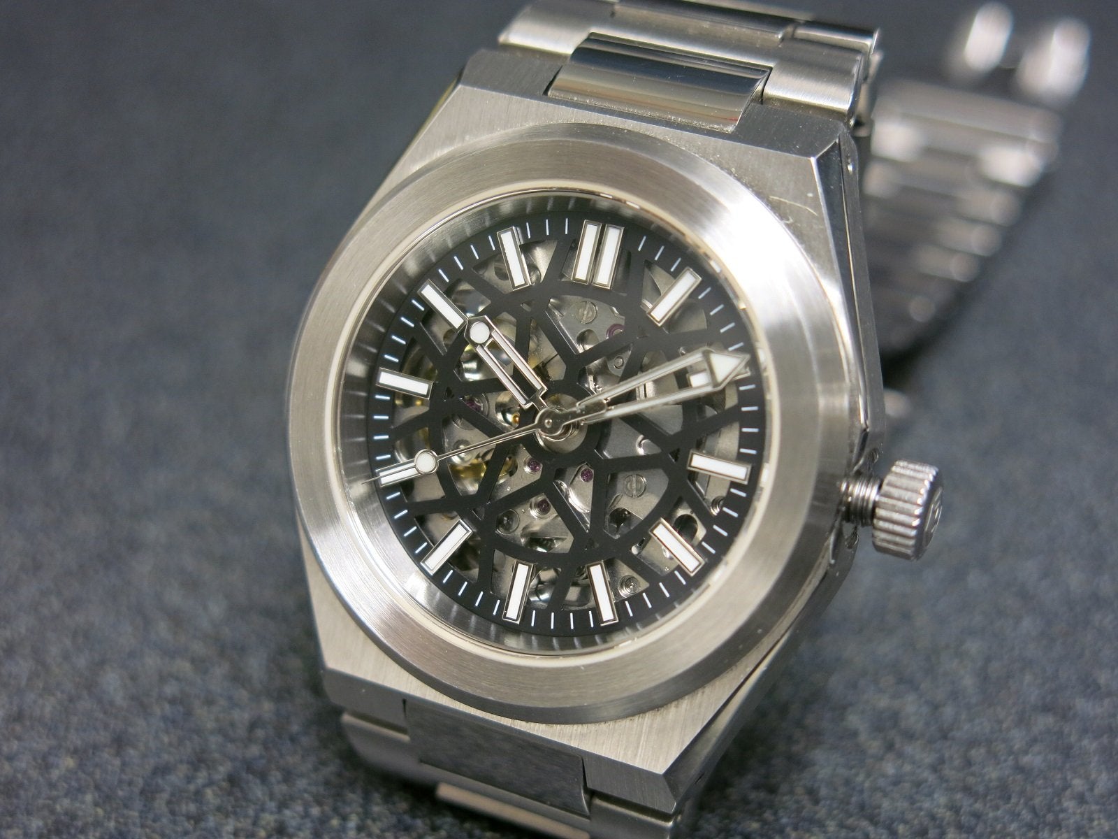 The original movement was replaced with a OEM Seiko NH70 which is a skeletonized movement with decorated rotor. A skeleton dial was installed as well as SMP hands to complete the skeleton looks.