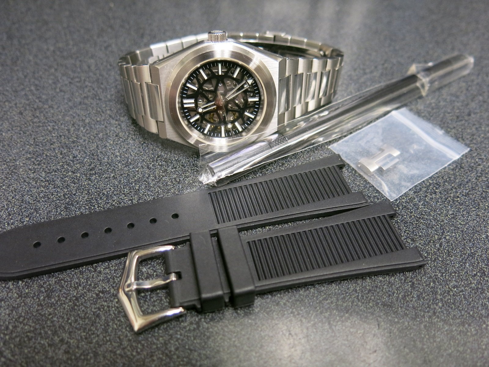 Comes with an extra link for the bracelet (sized for about 8 1/4" now) and an original rubber strap so you can change the looks of the watch. There is also some kind of tool which I did not open from the packaging.